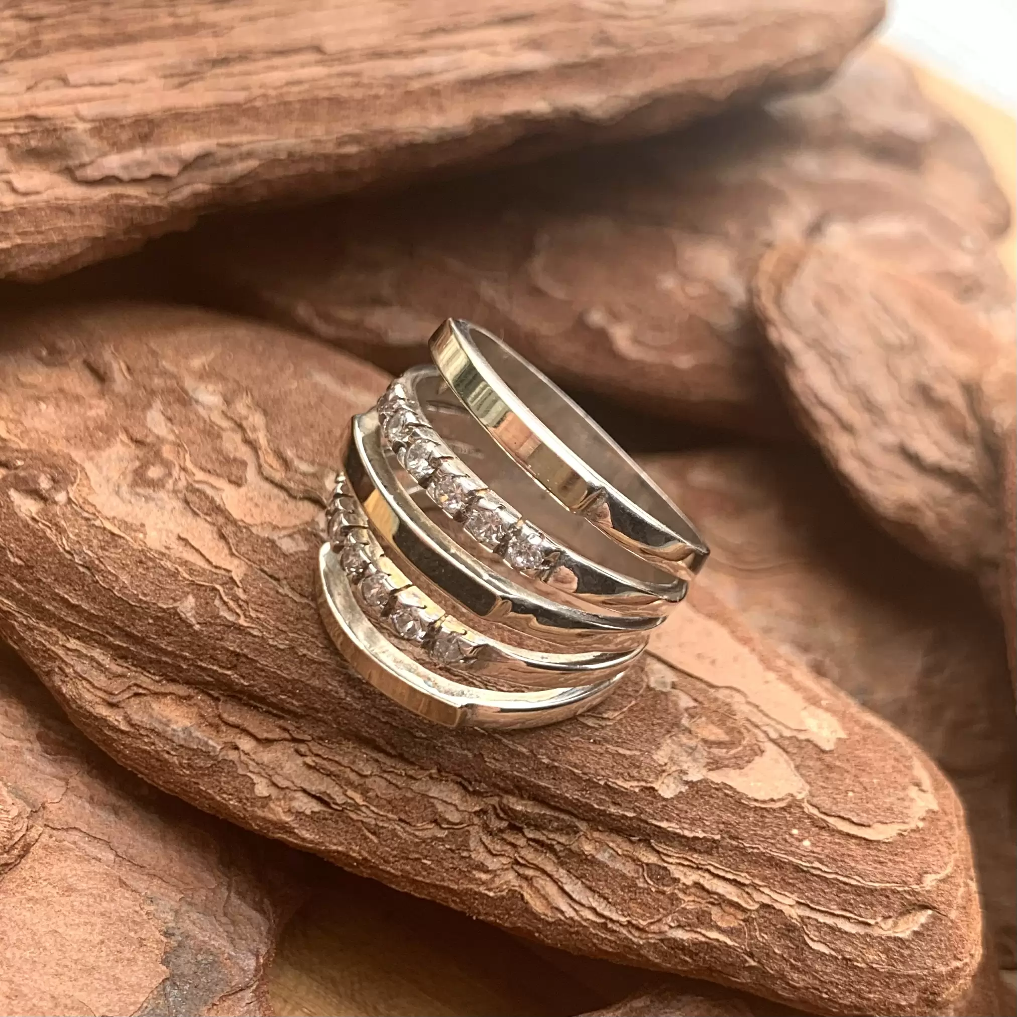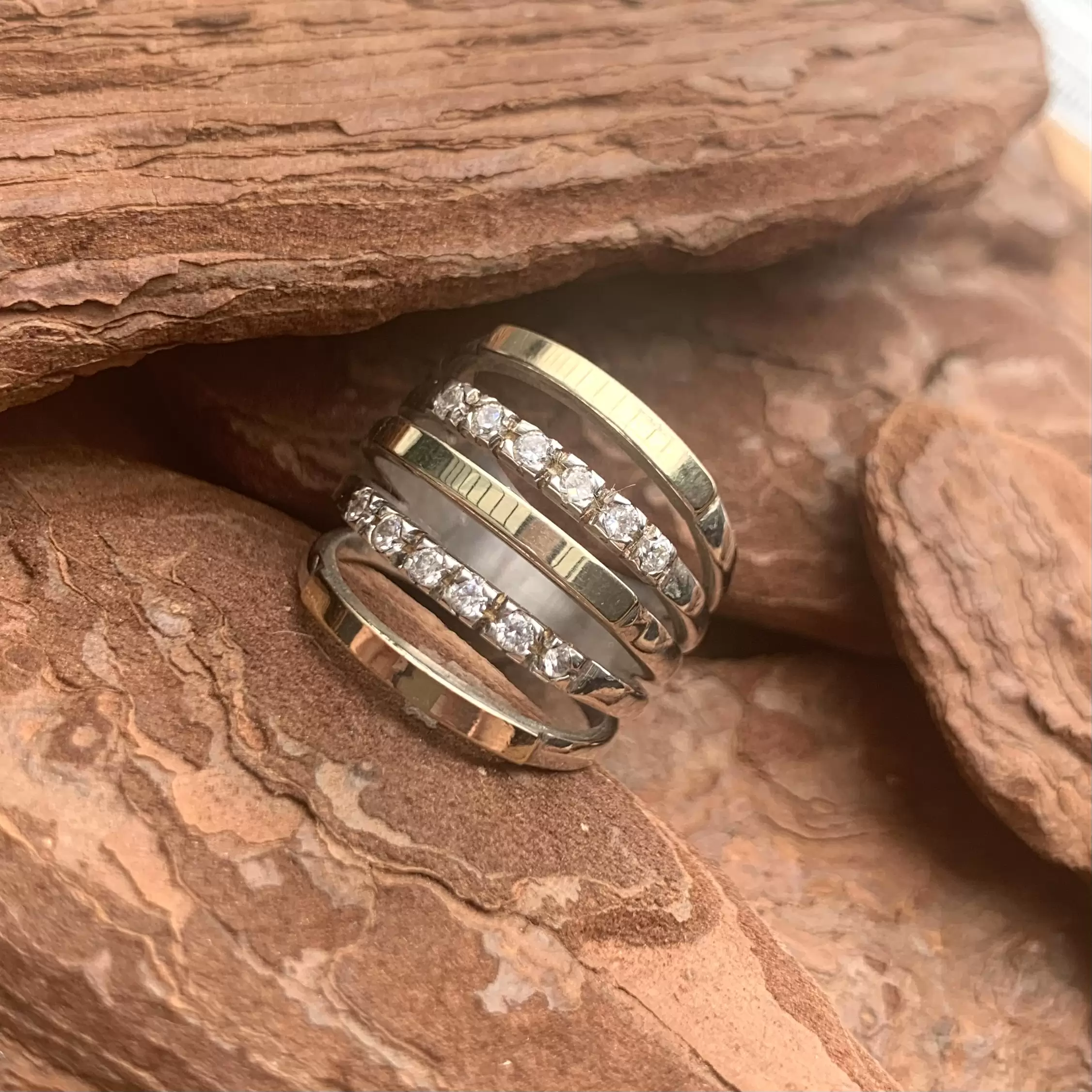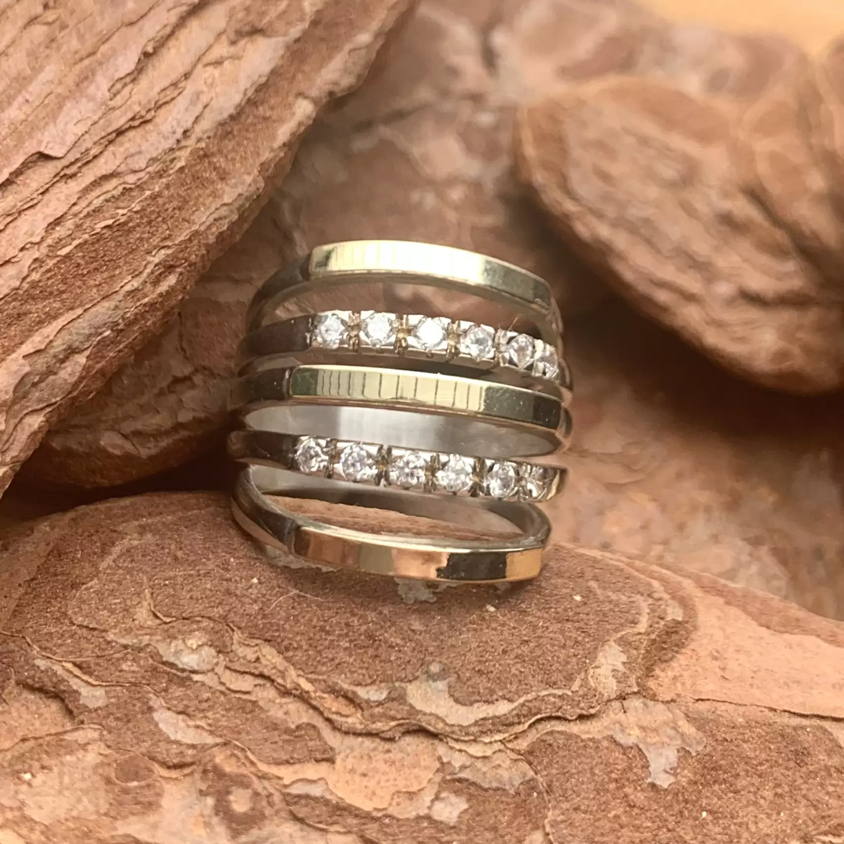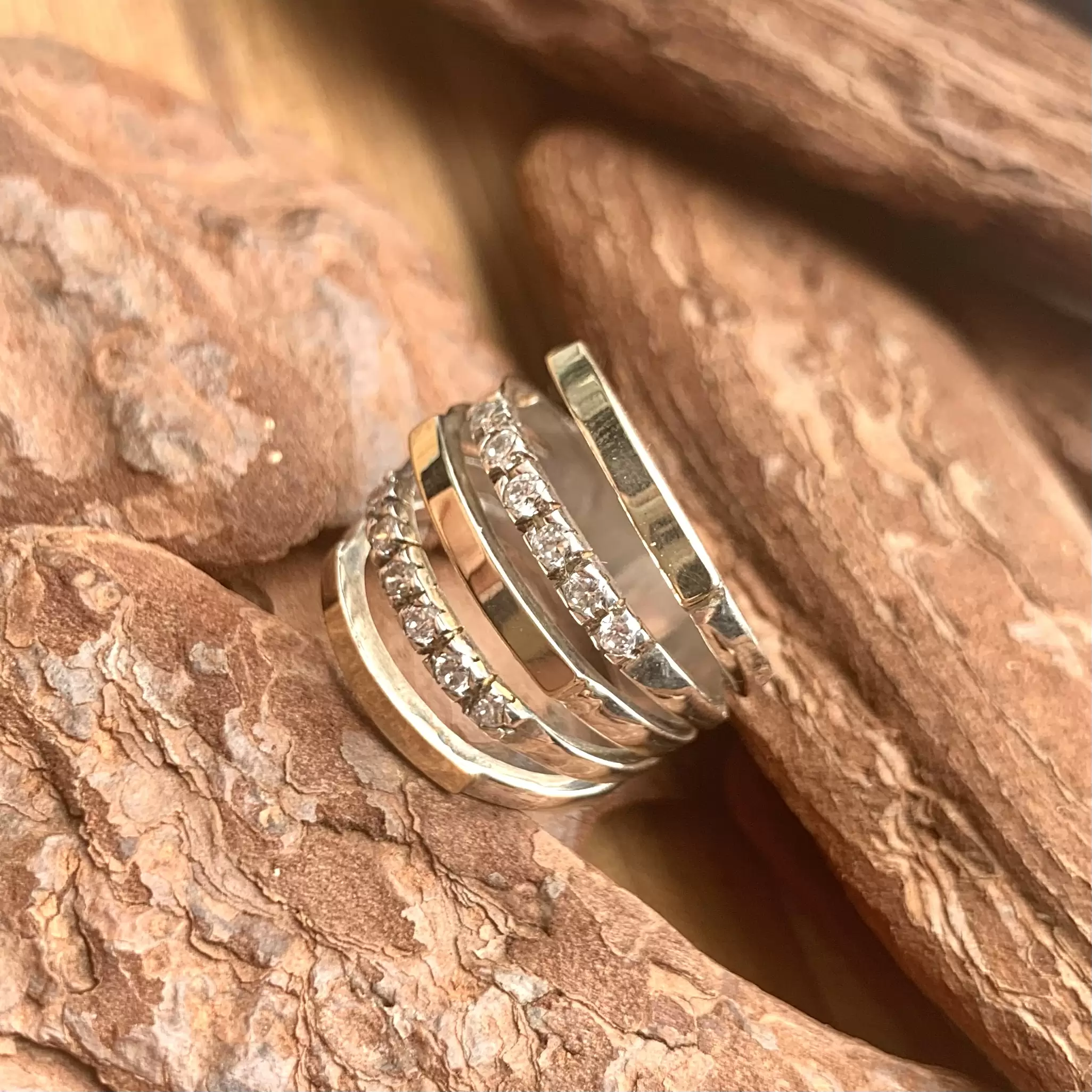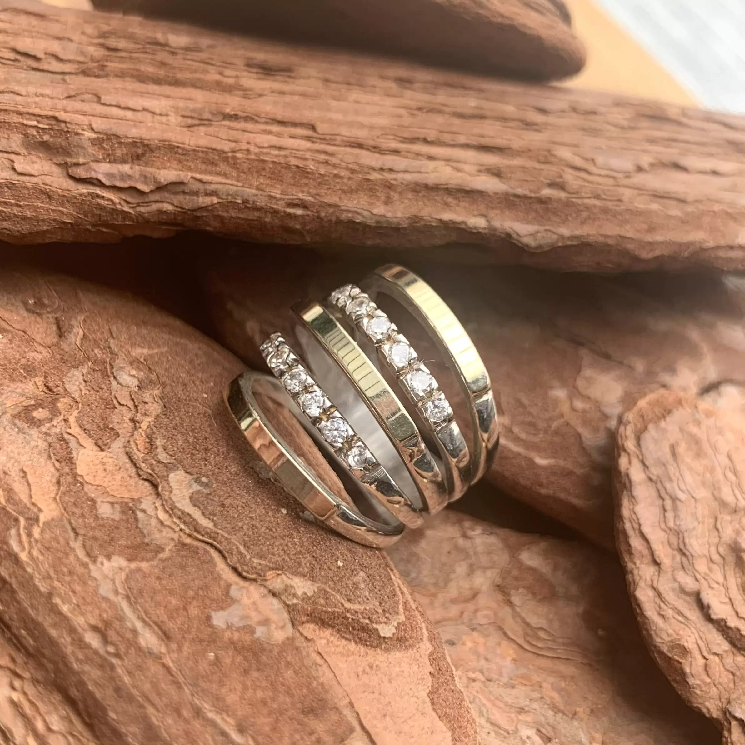 Anel 5 fios em Prata 925 com Aplique em Ouro cravejado com zircônias brancas.