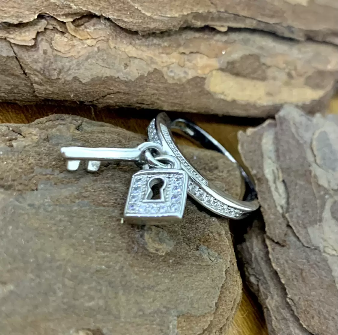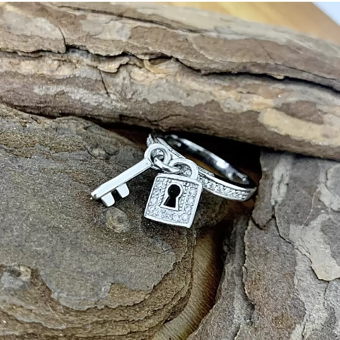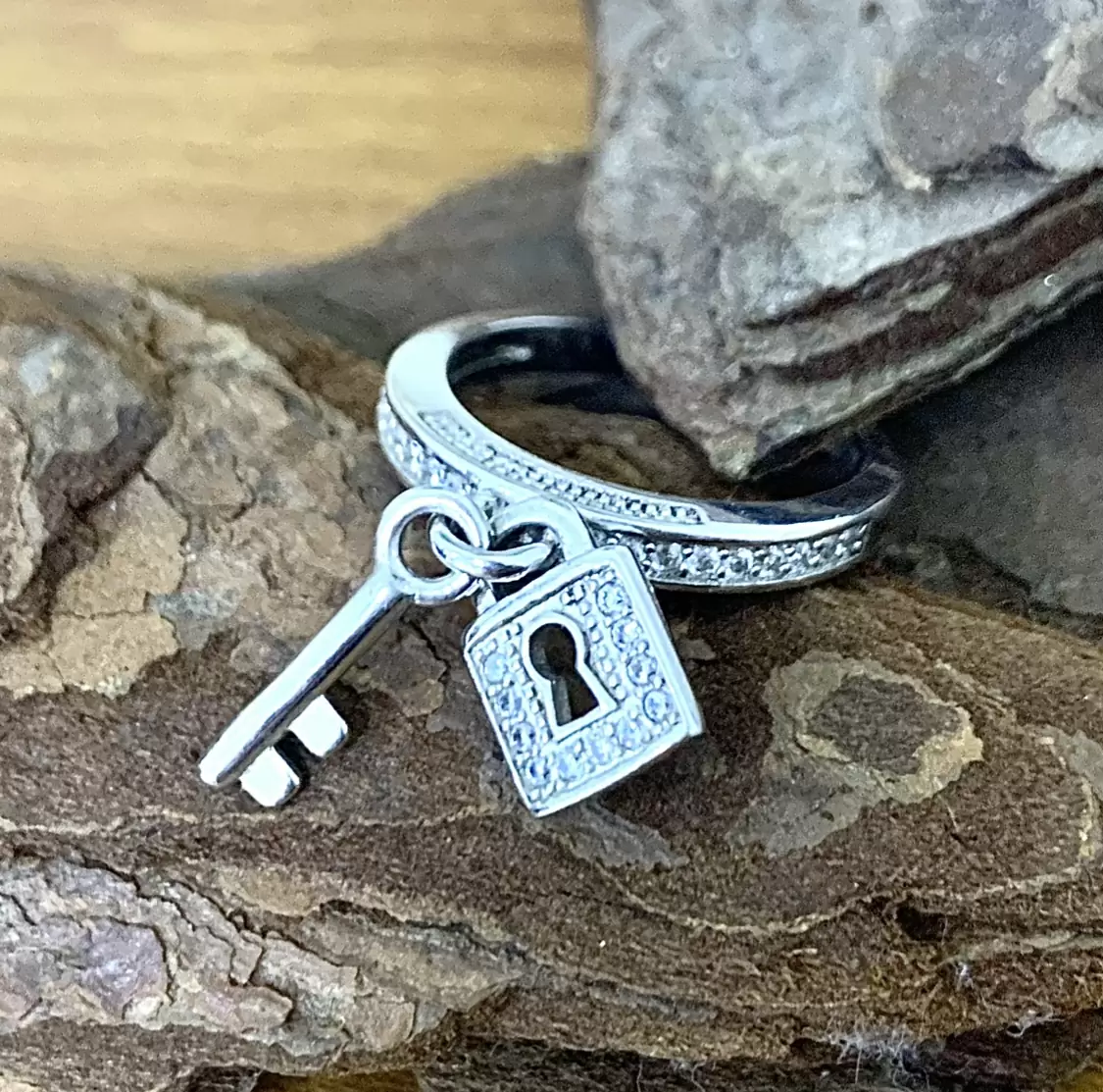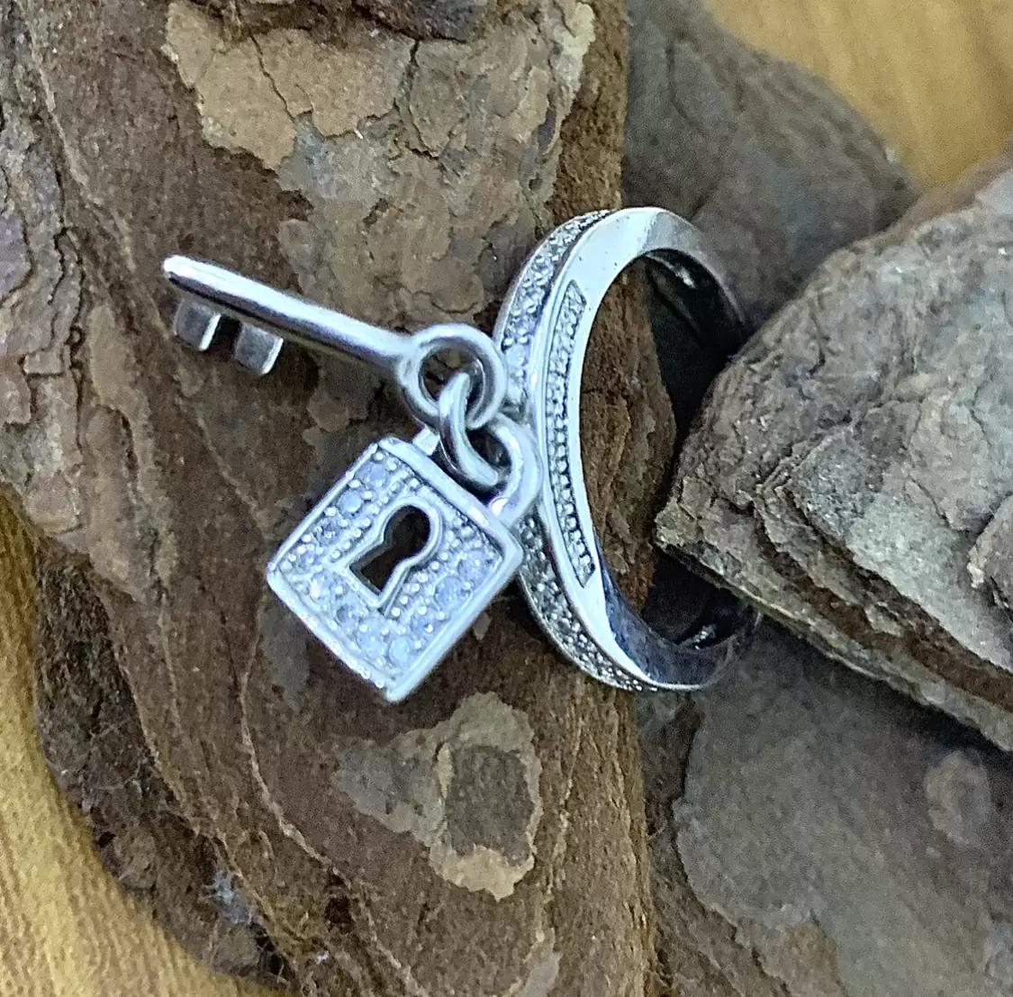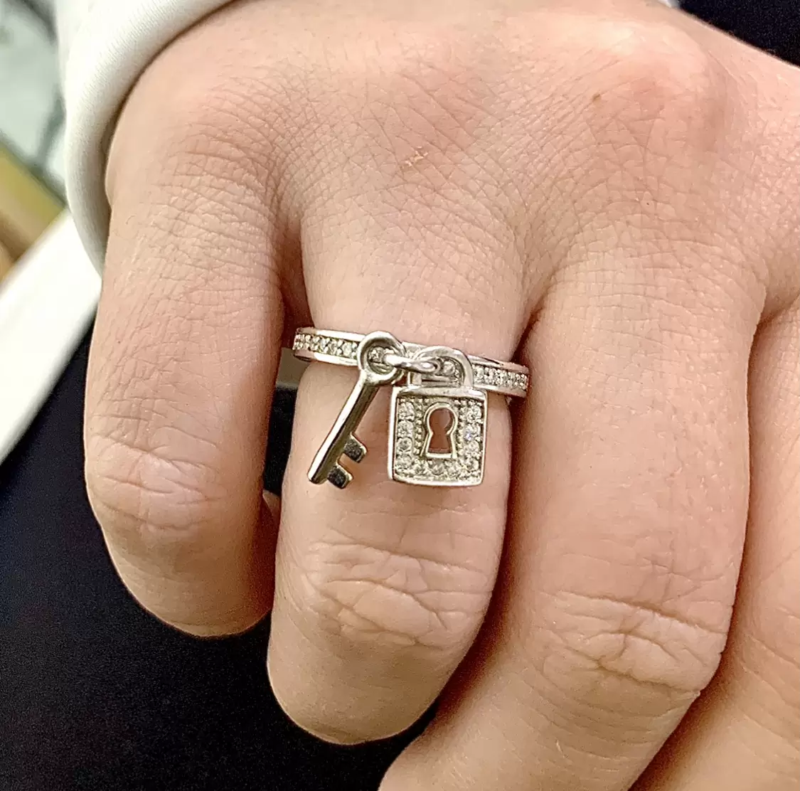 Anel com pingentes de chave e cadeado cravejados com zircônias brancas em prata 925 com banho de ródio.