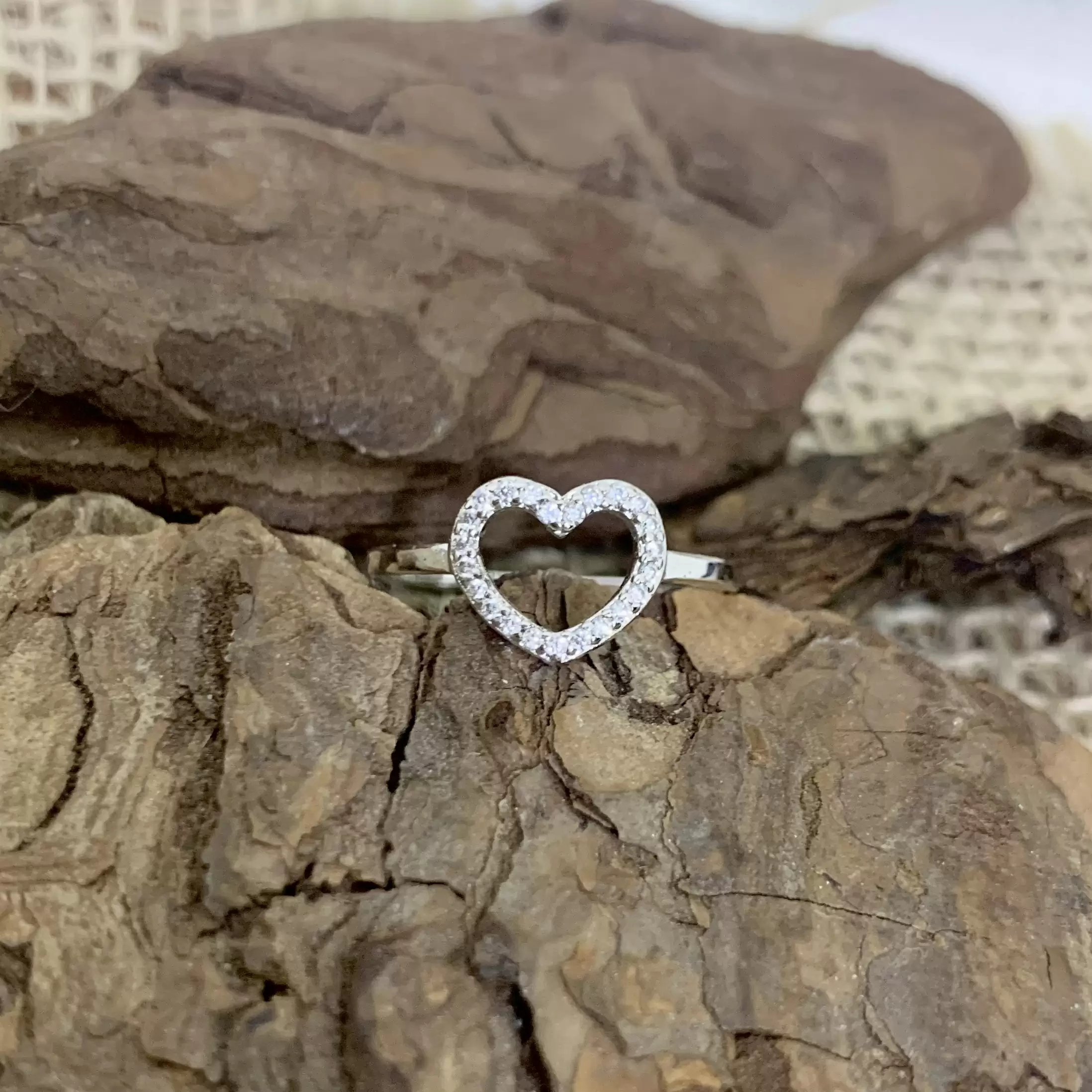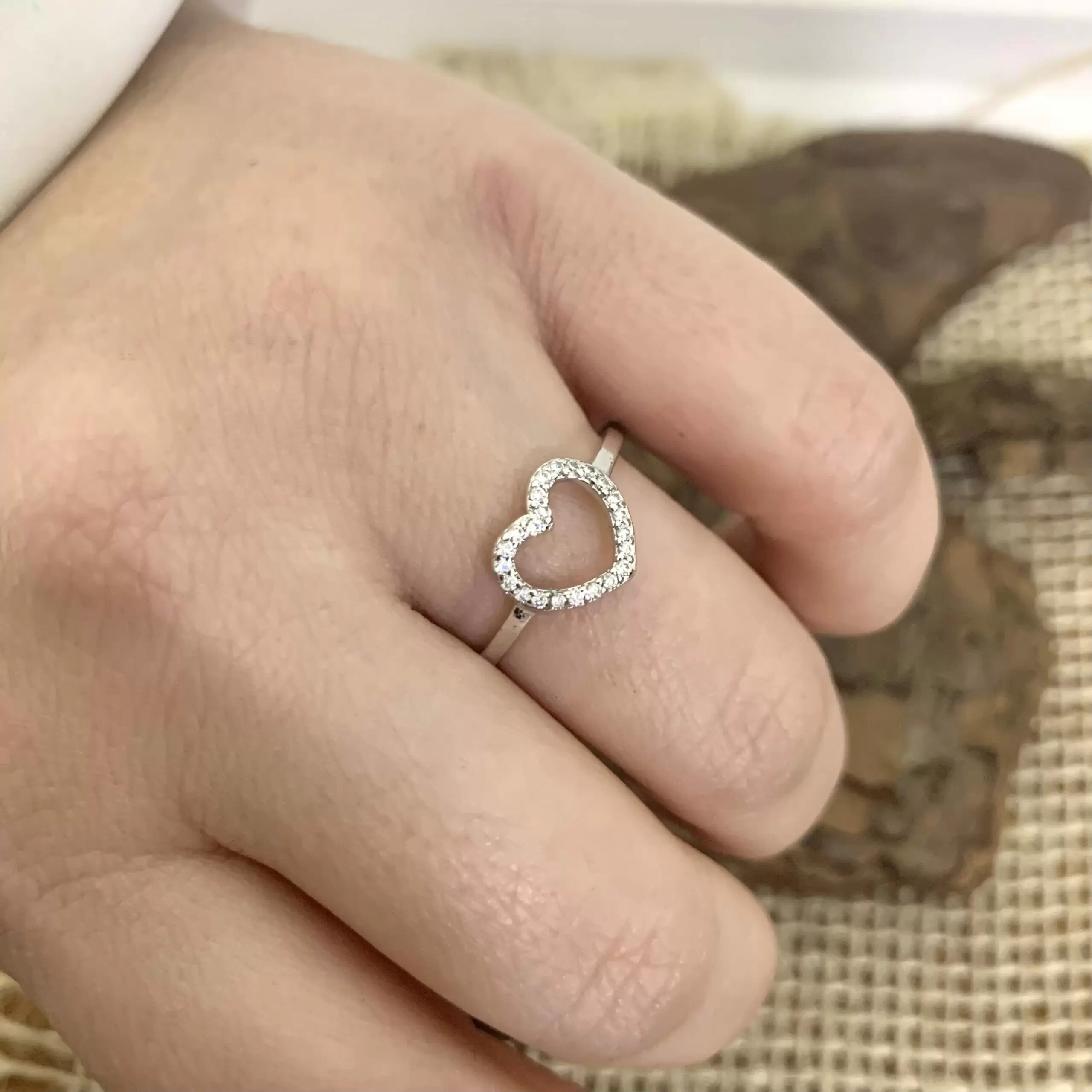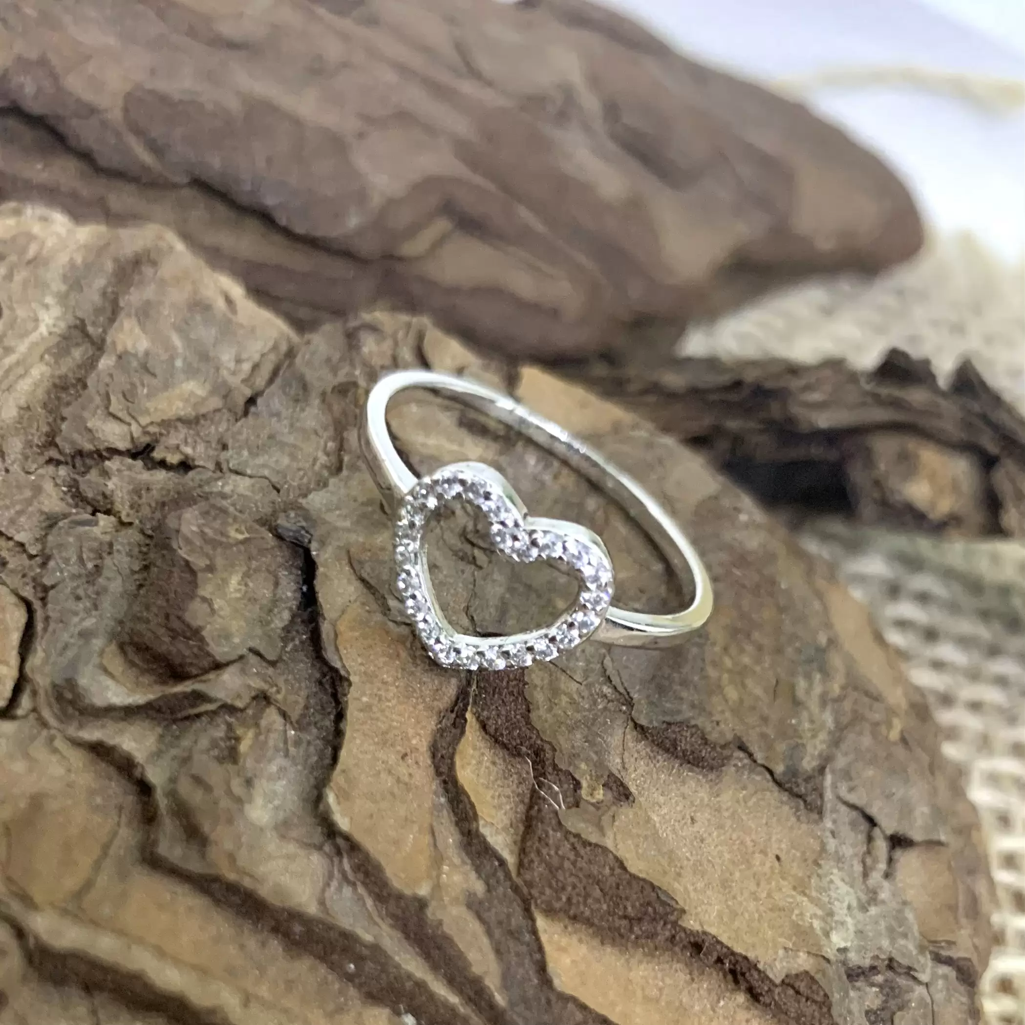 Anel delicado de coração cravejado com zircônias brancas feito em prata 925 com banho de ródio.