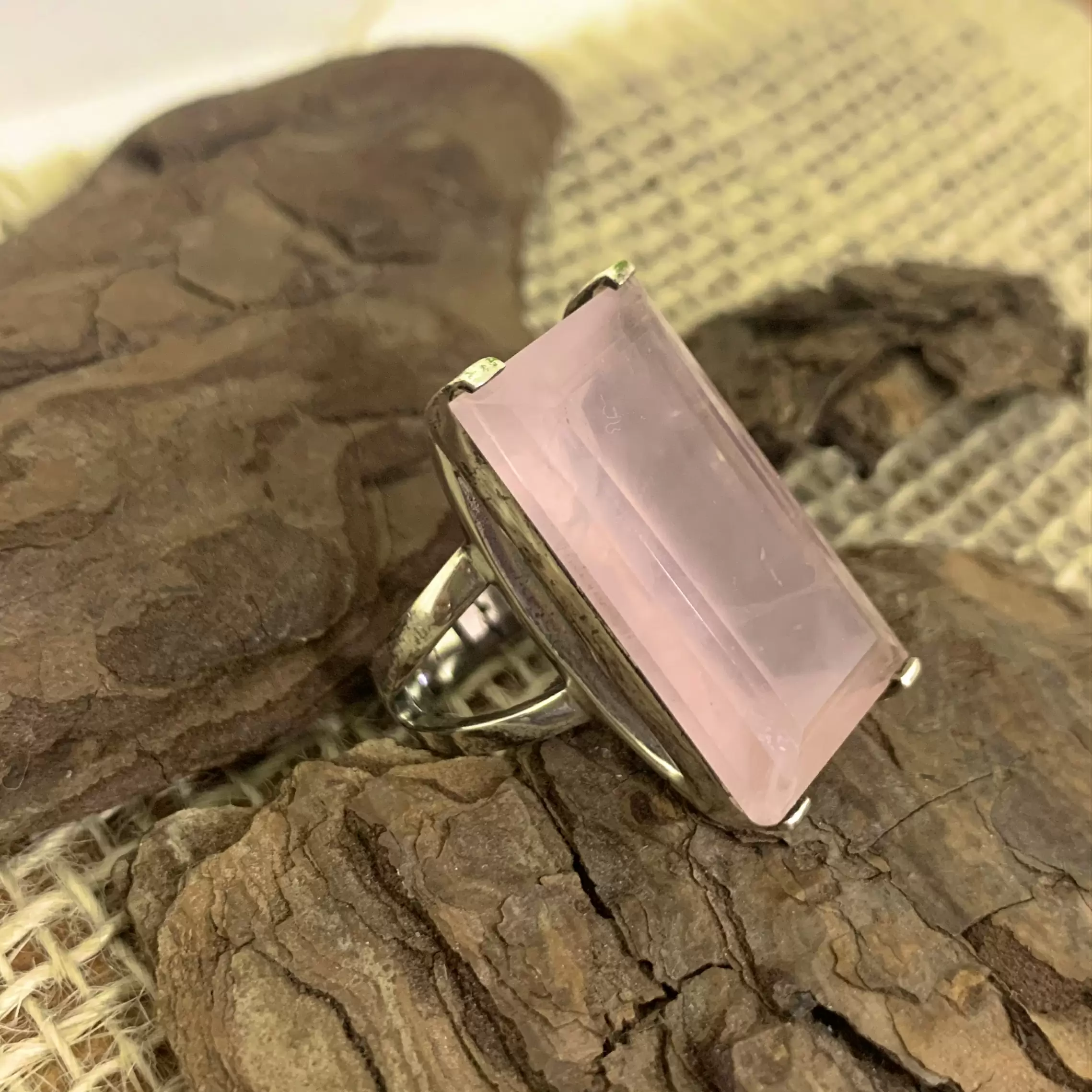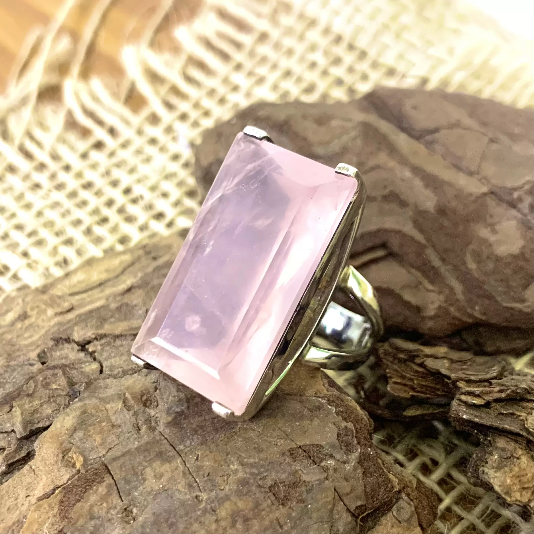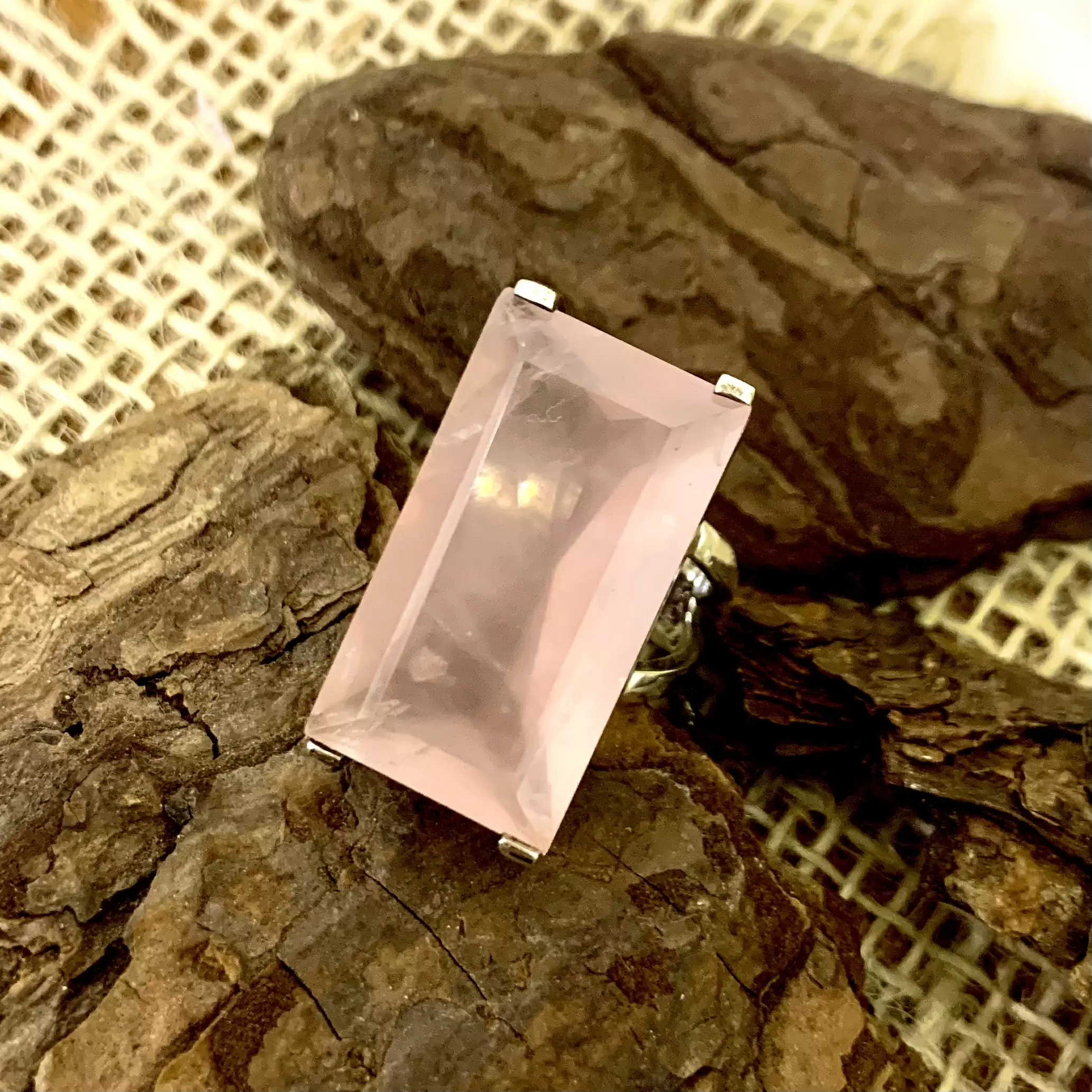Anel Retangular de Quartzo Rosa em Prata 925.