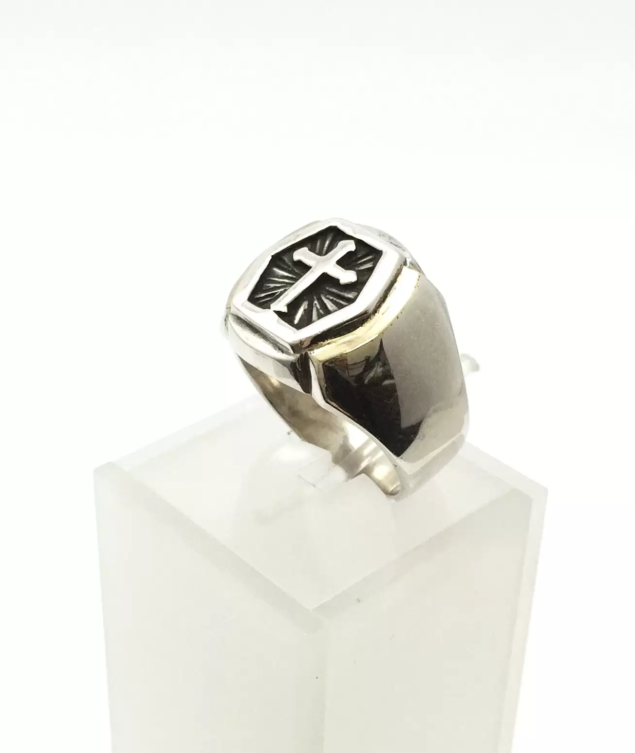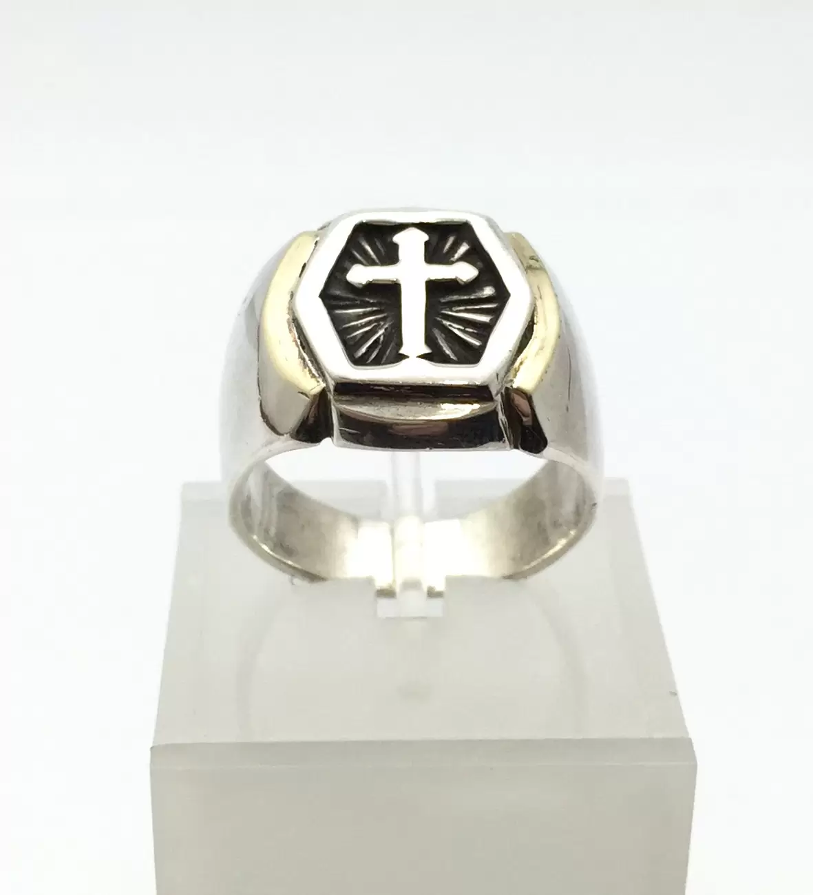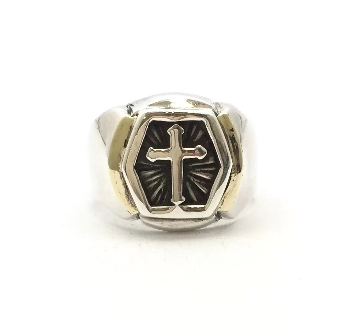 Anel Masculino cm Cruz em Alto Relevo e Detalhe Lateral com Aplique de Ouro, em Prata 925.