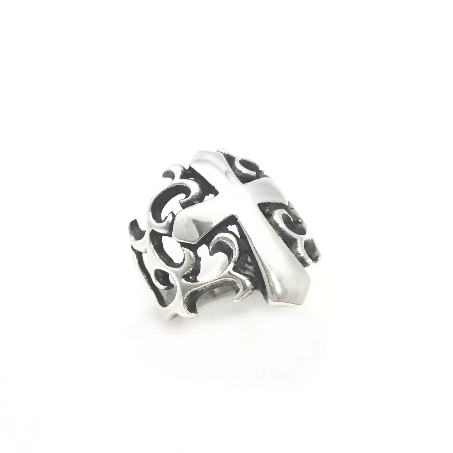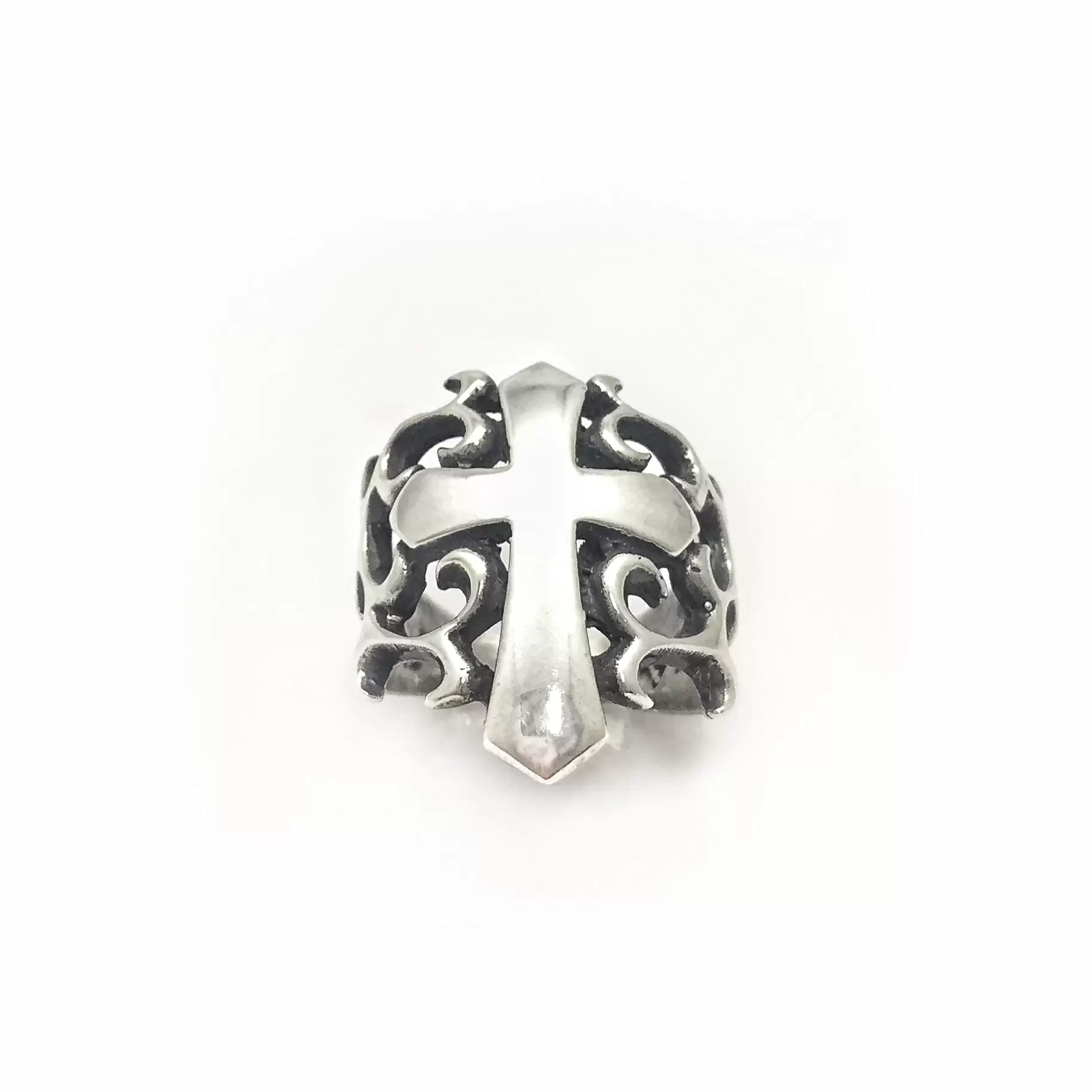 Anel Masculino Trabalhado com Crucifixo, em Prata 925.