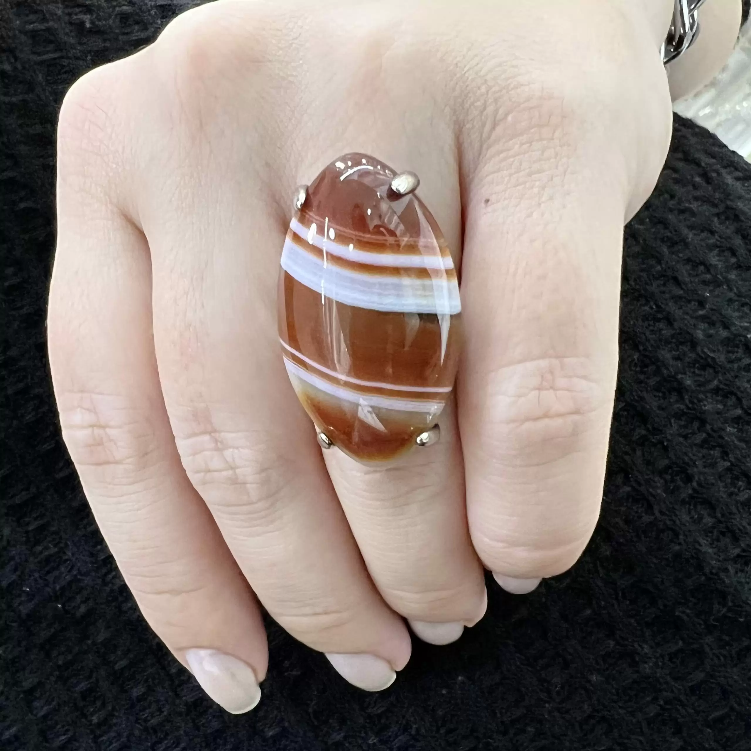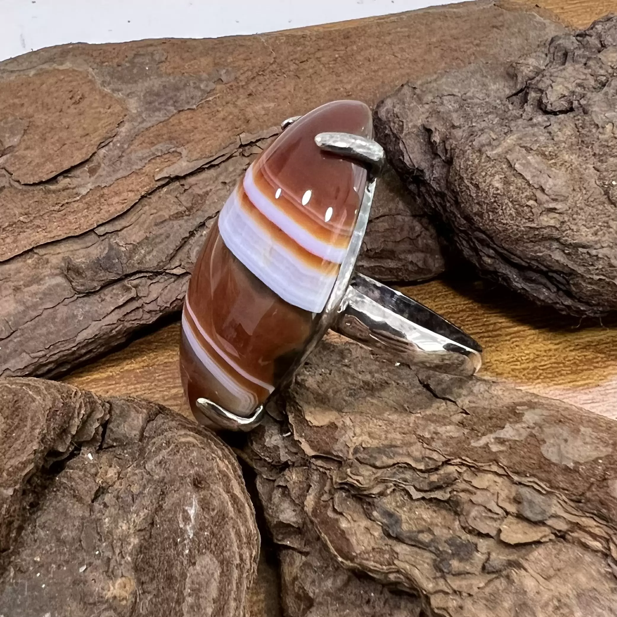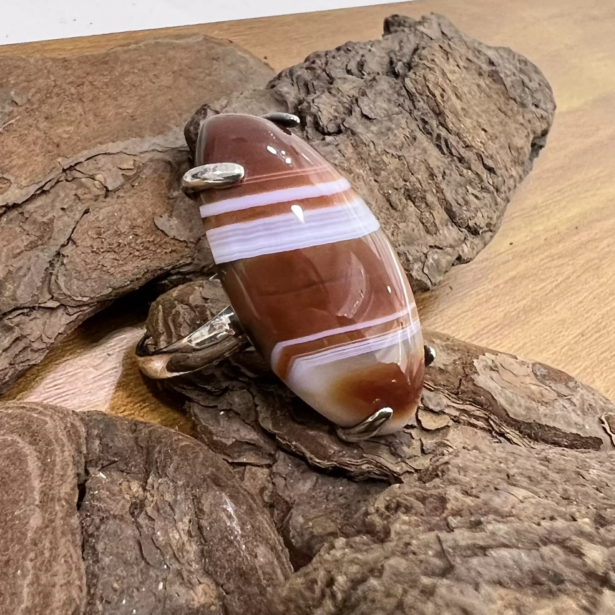 Anel Navete de Ágata de Fogo em Prata 925.