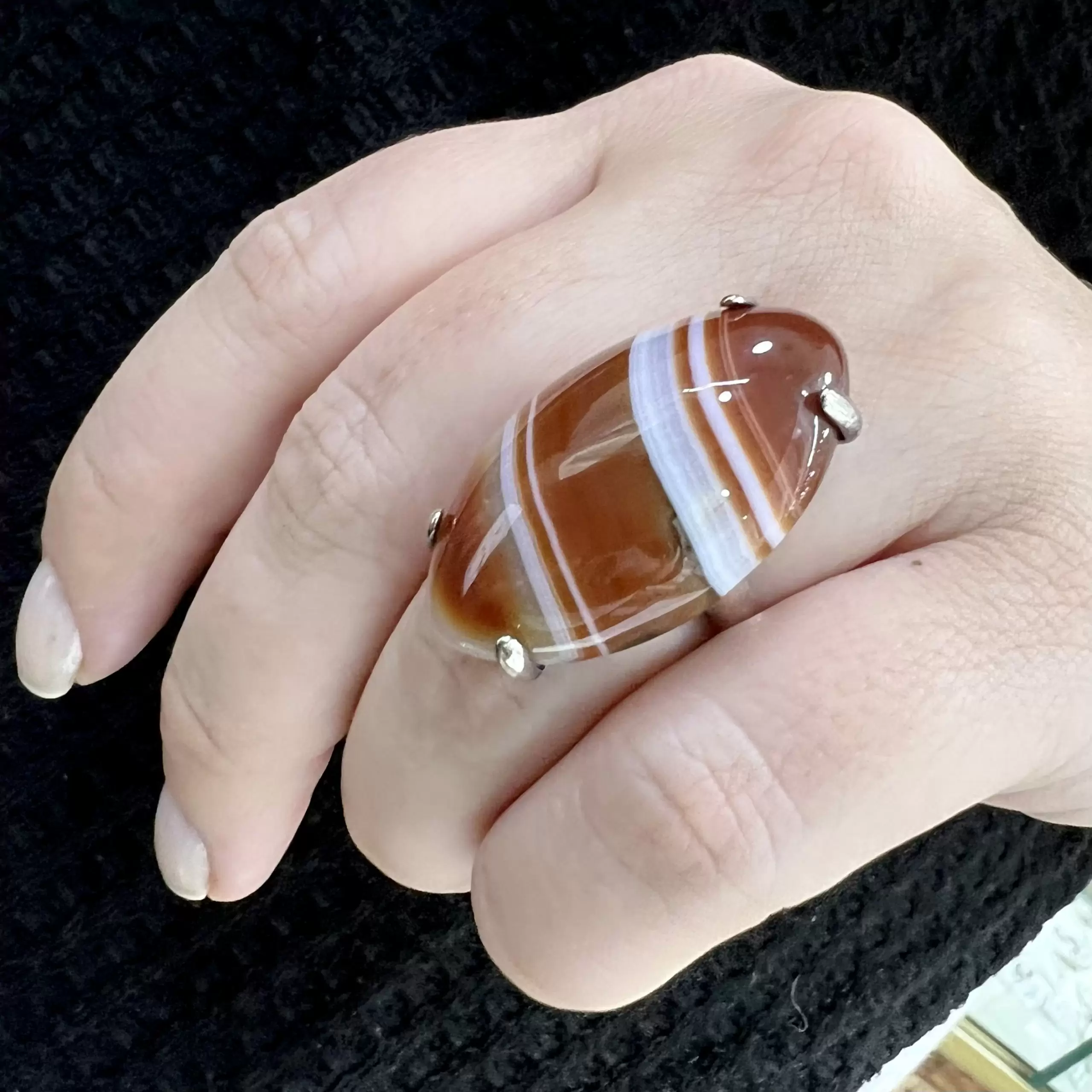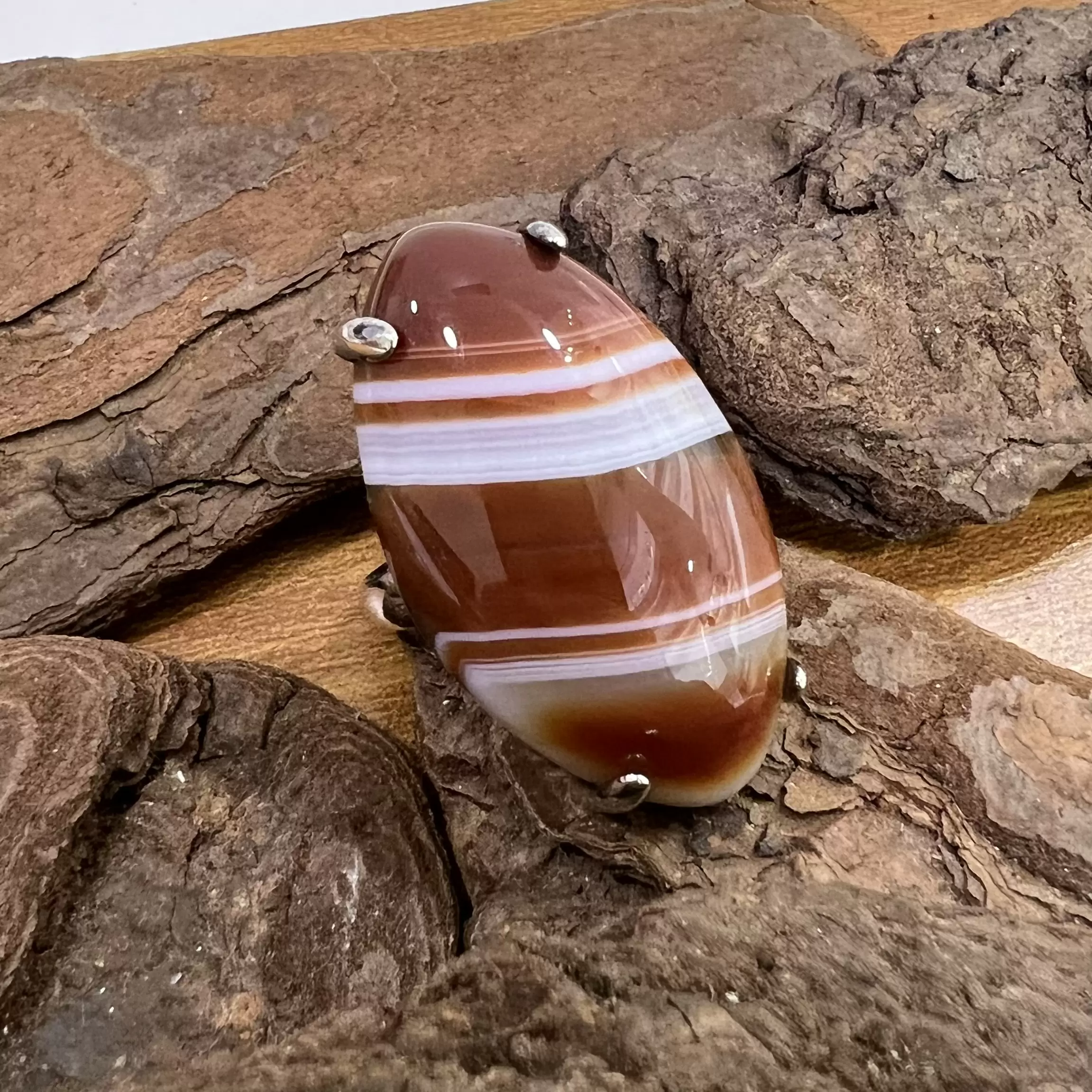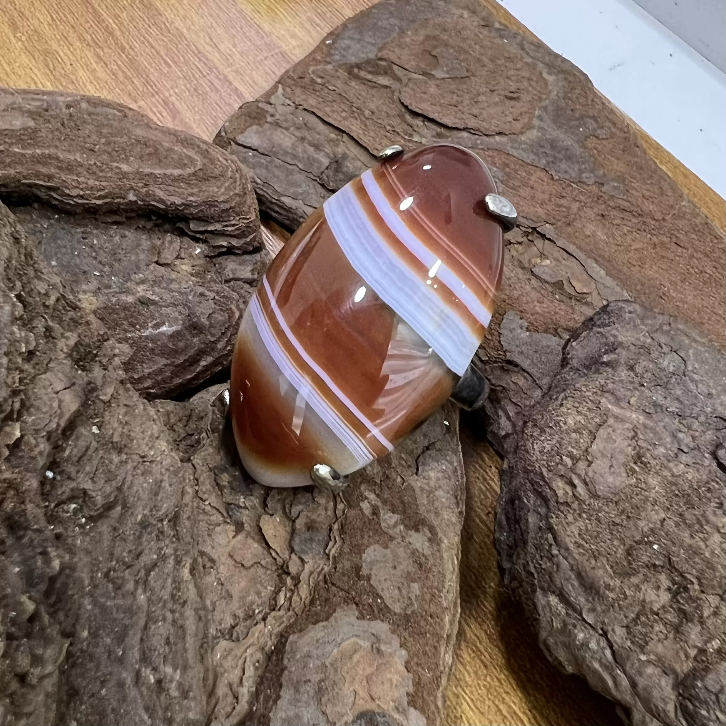 Anel Navete de Ágata de Fogo em Prata 925.