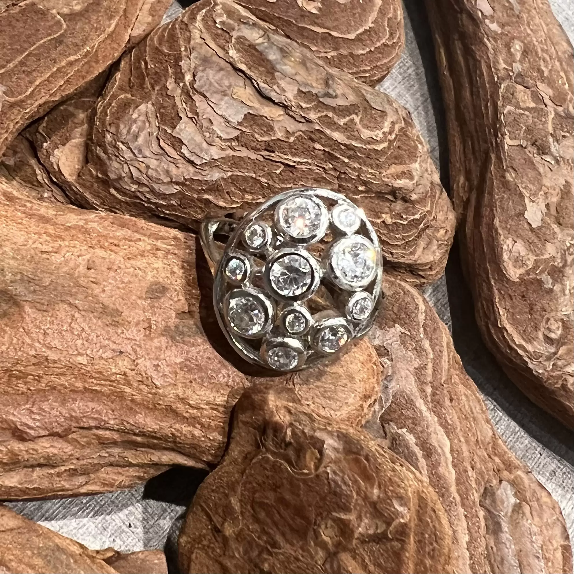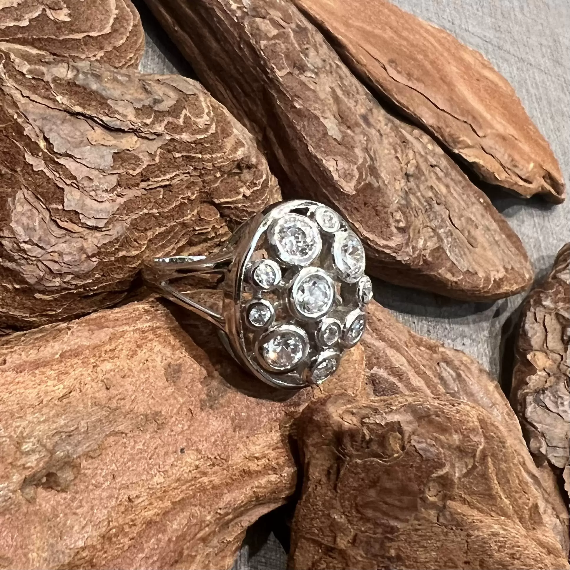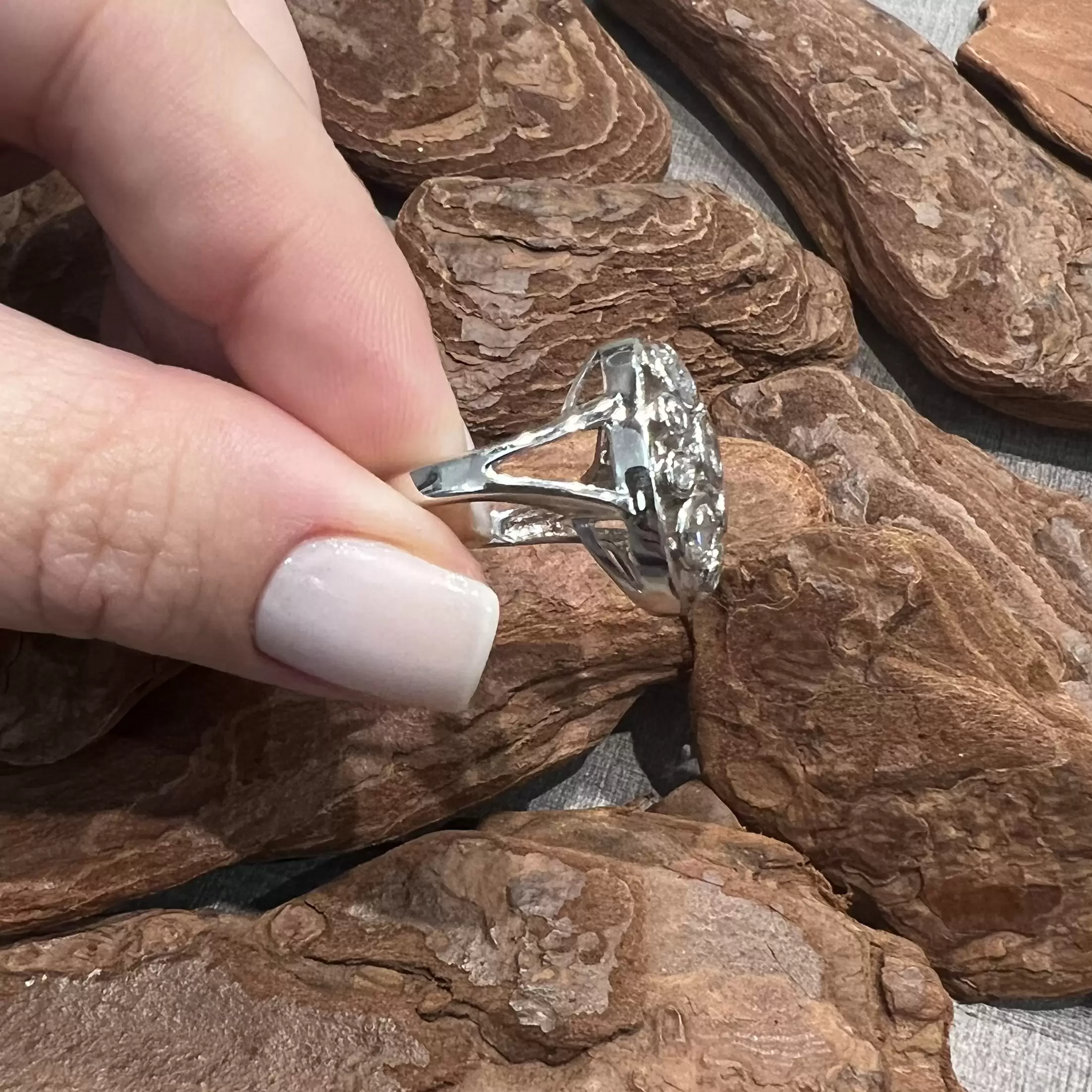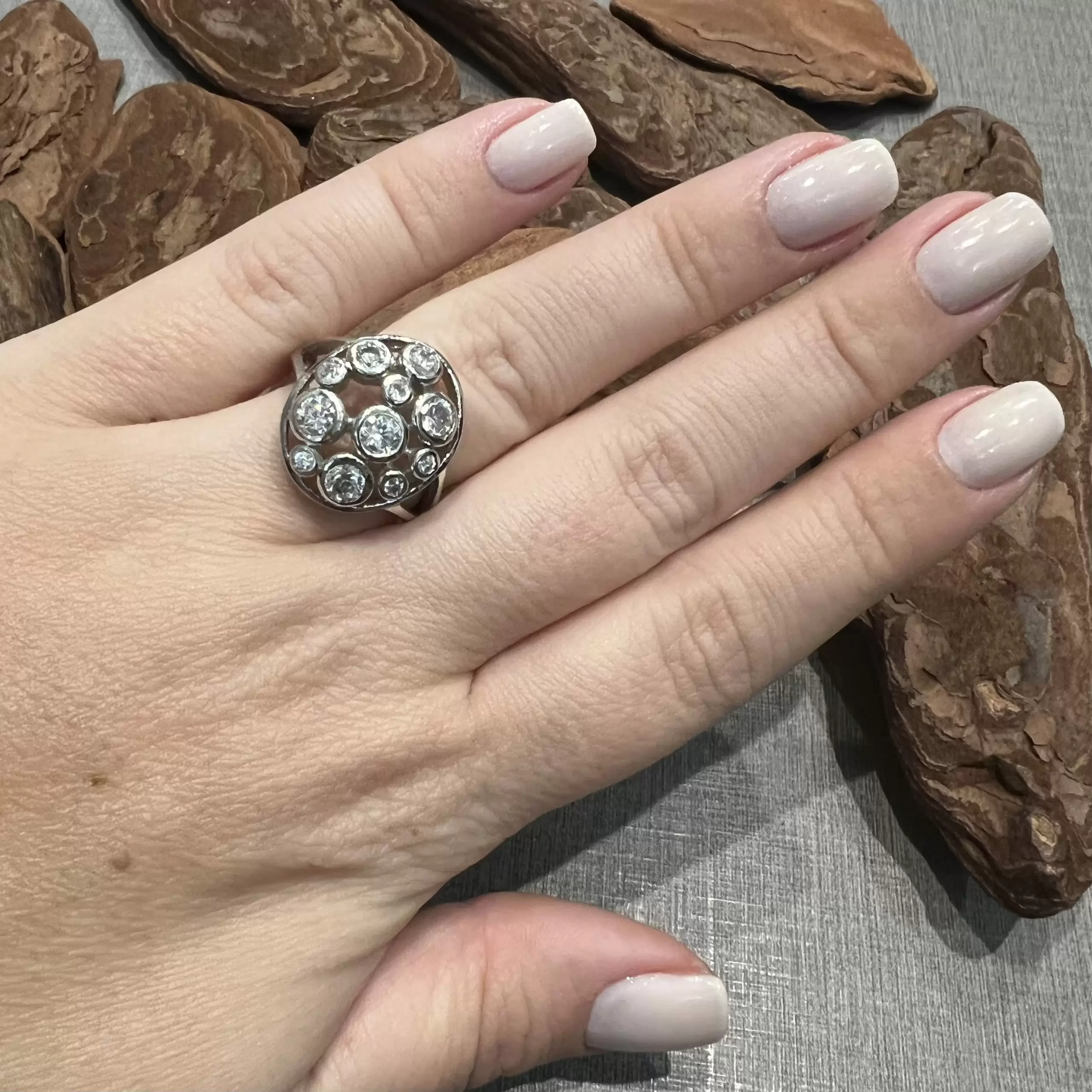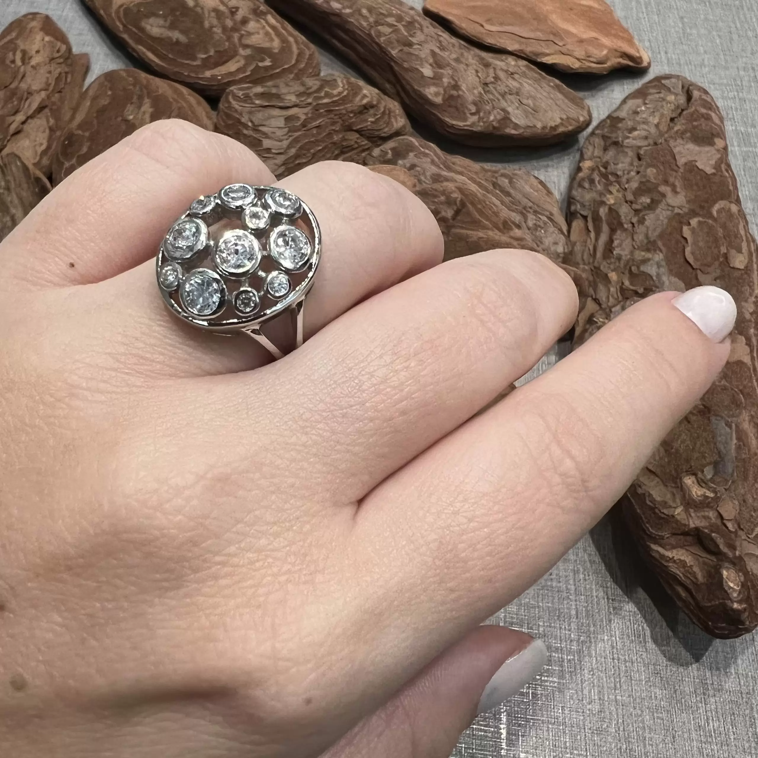 Anel oval com 11 zircônias brancas feito em prata 925 com banho de ródio.