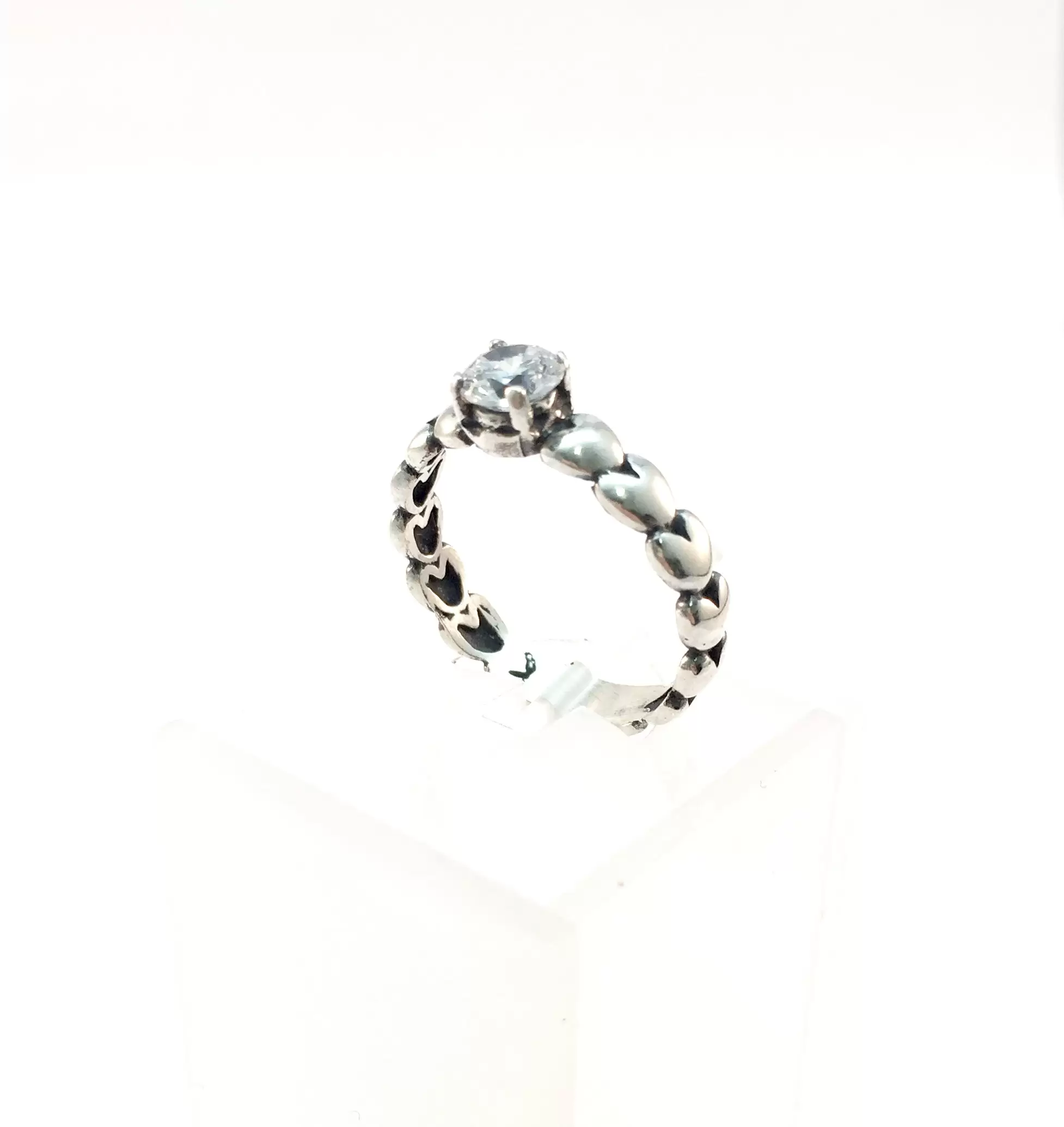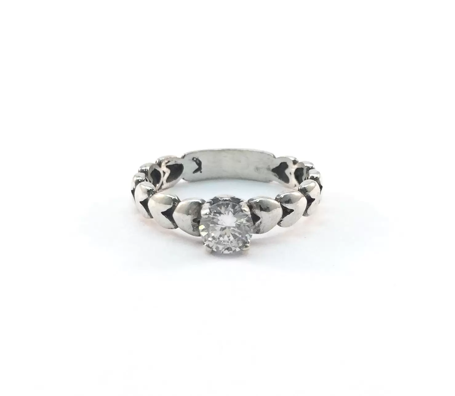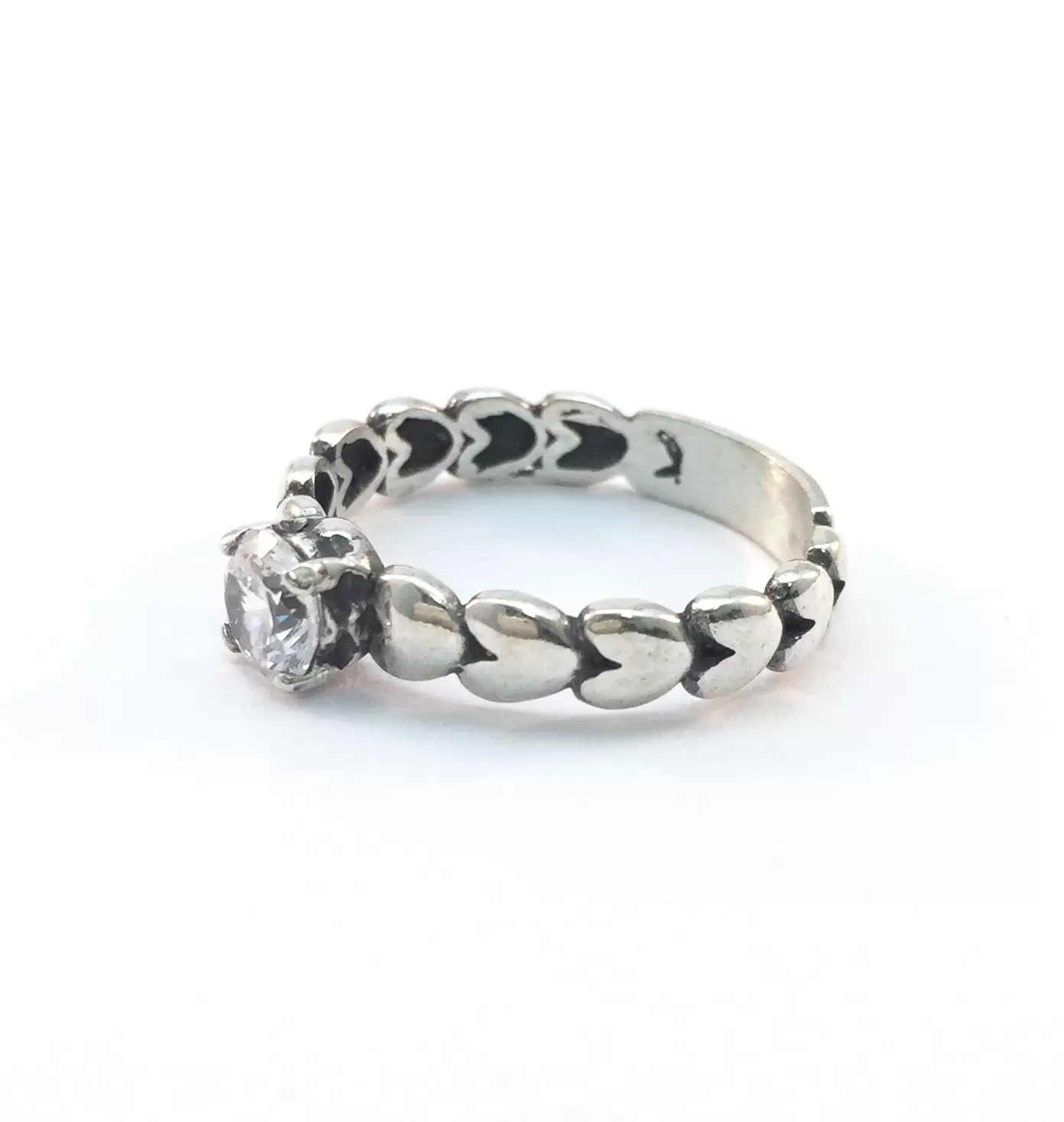 Anel Solitário Corações e Zircônia em Prata 925 Escurecida.