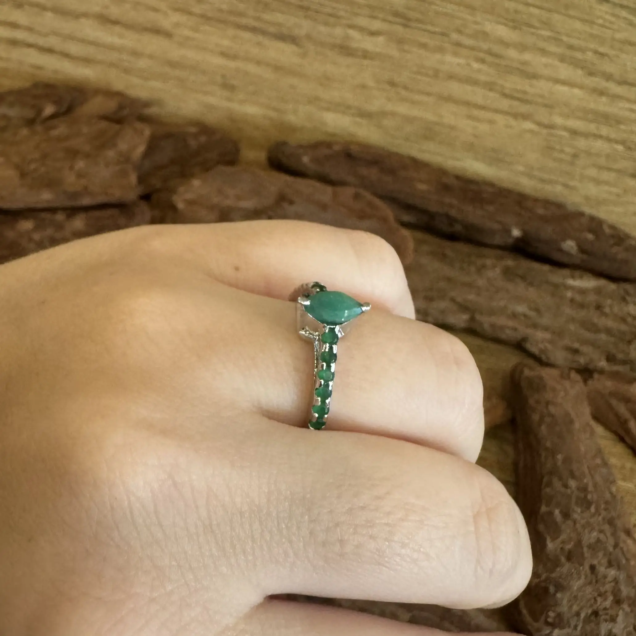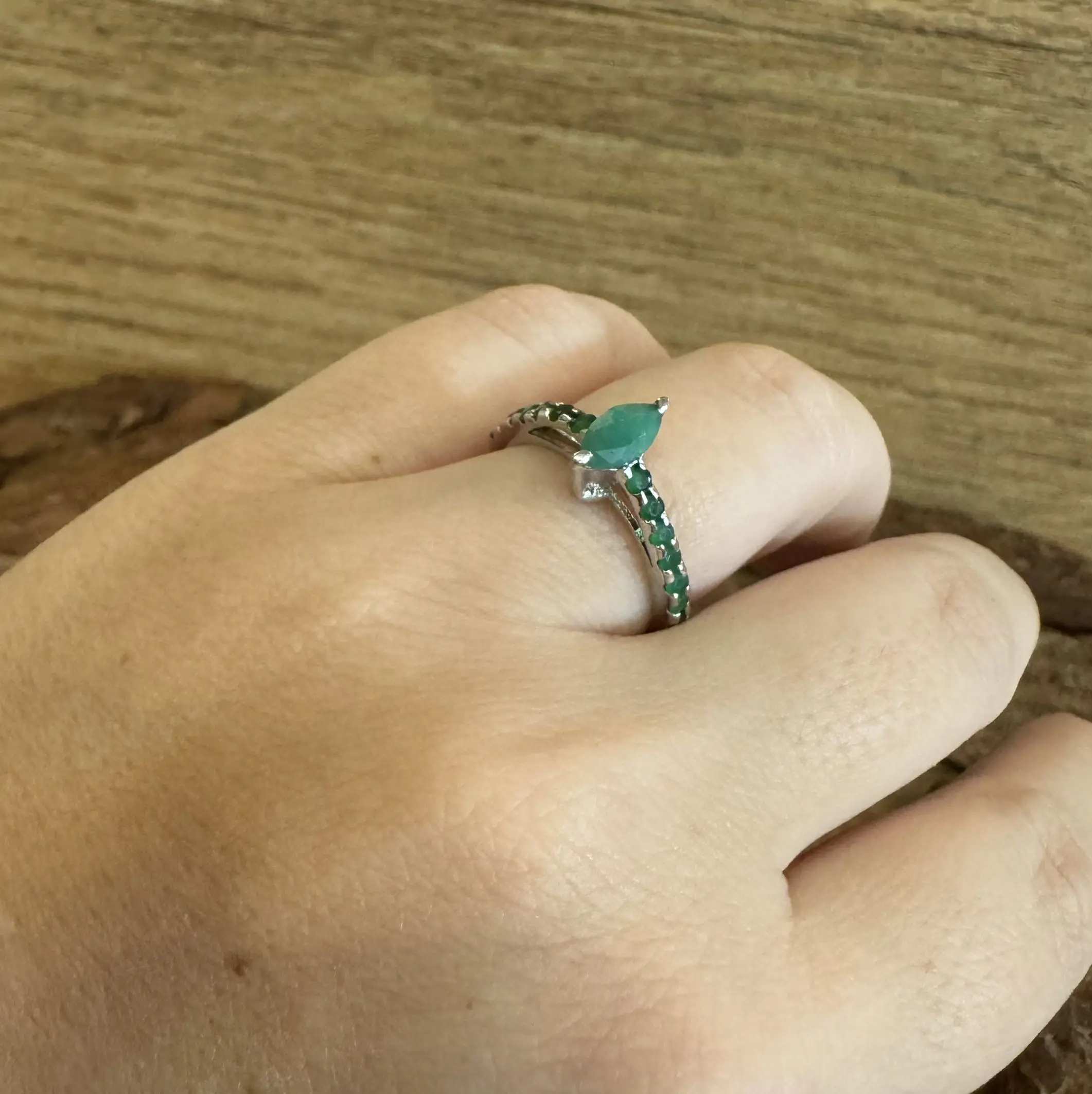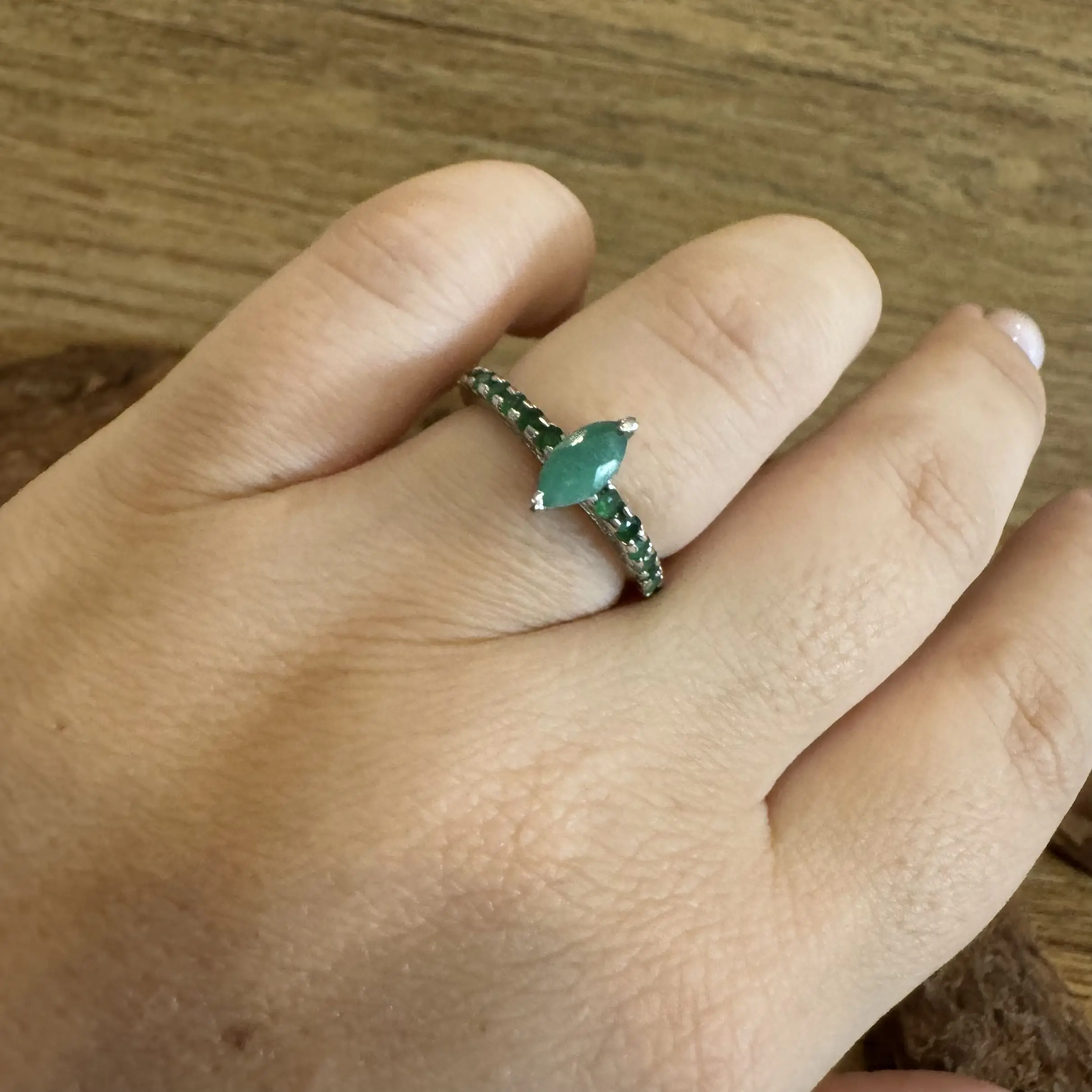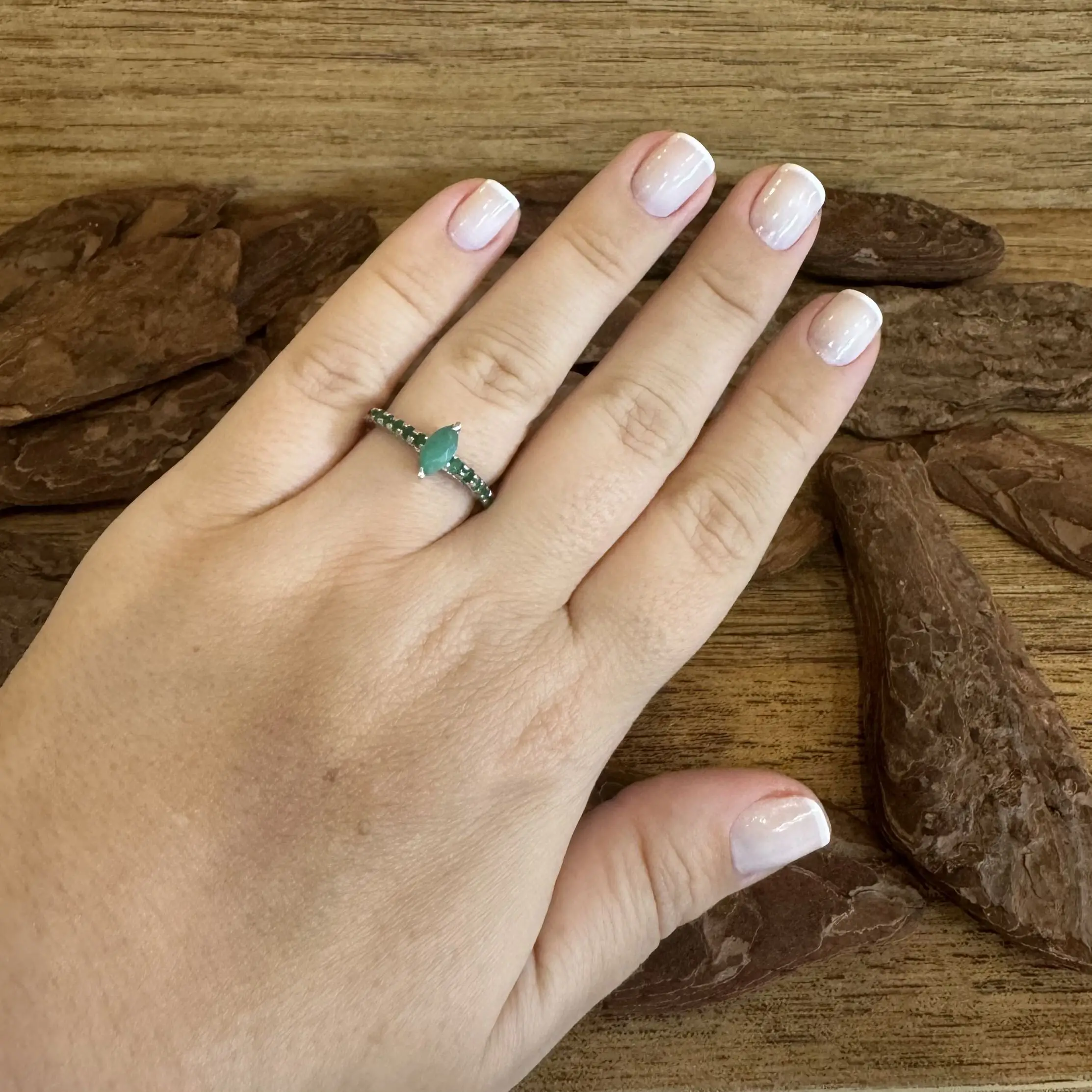 Anel Solitário Navete de Esmeralda indiana em Prata com banho de Ródio.