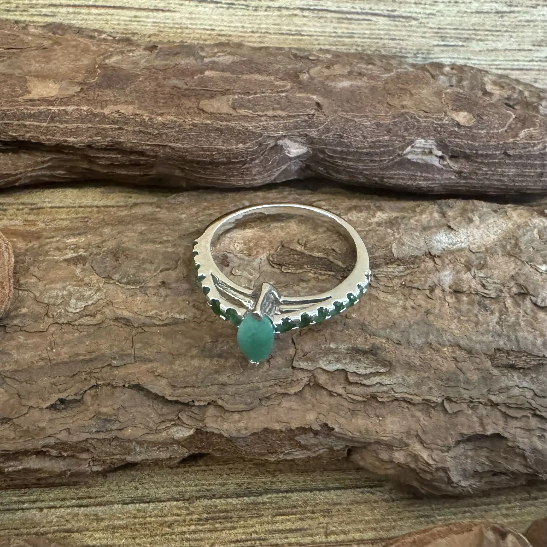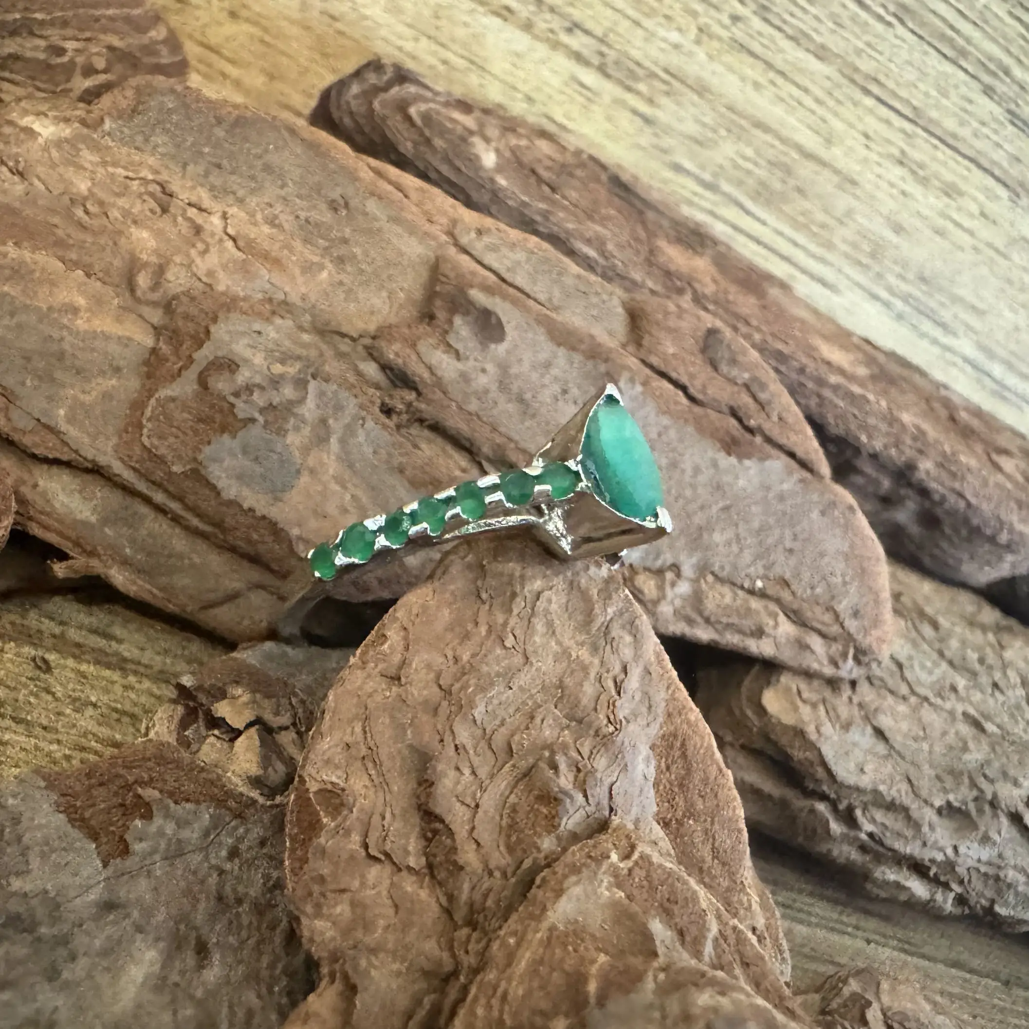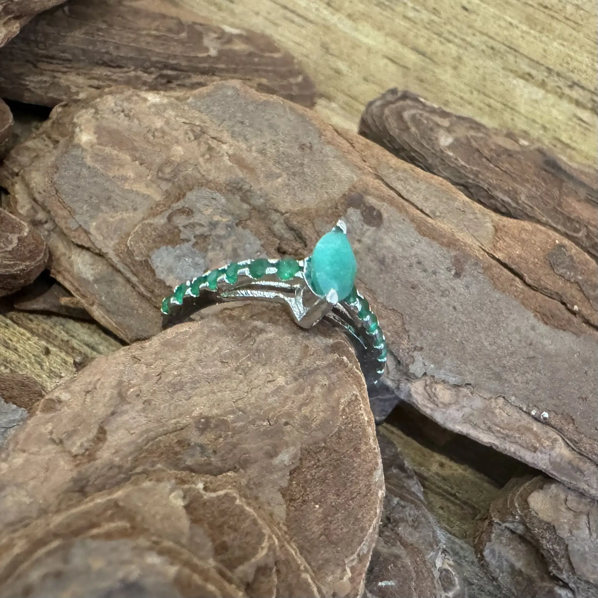 Anel Solitário Navete de Esmeralda indiana em Prata com banho de Ródio.