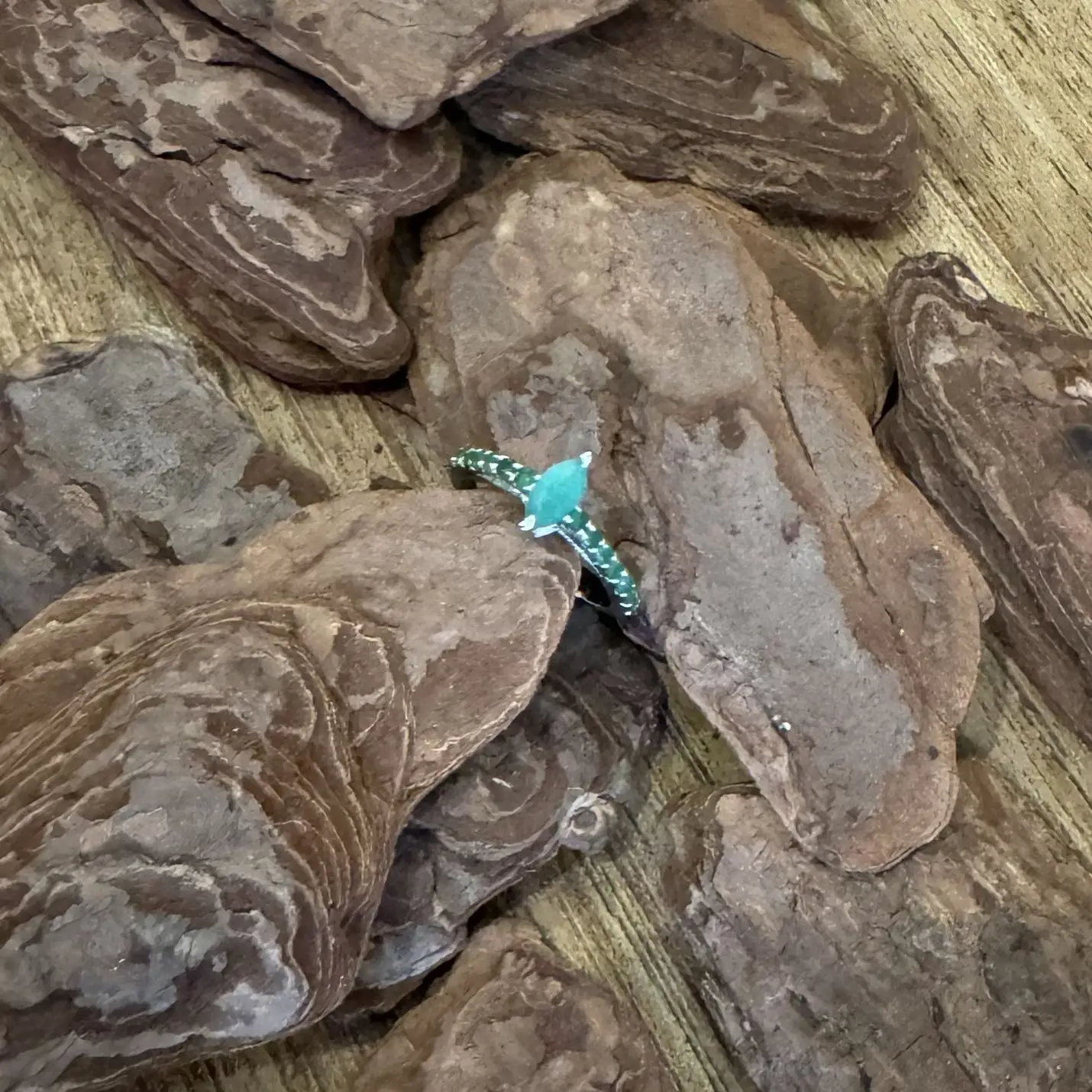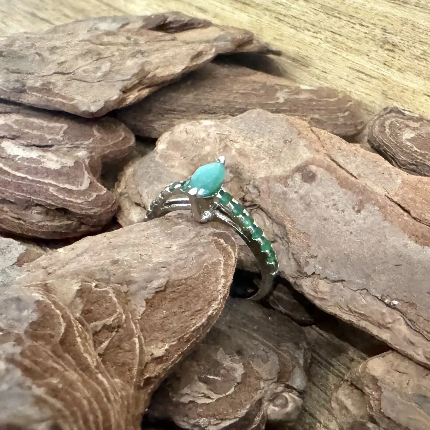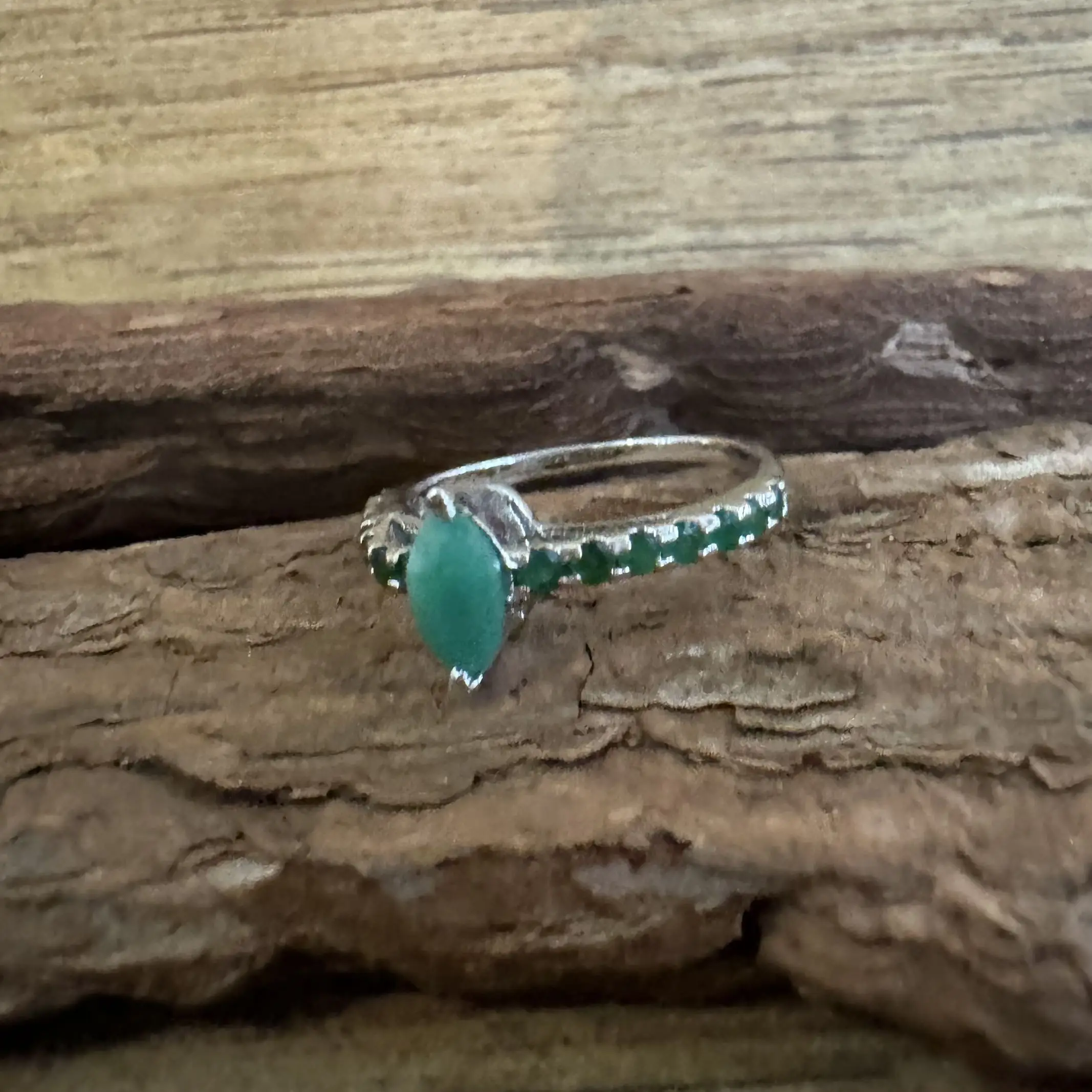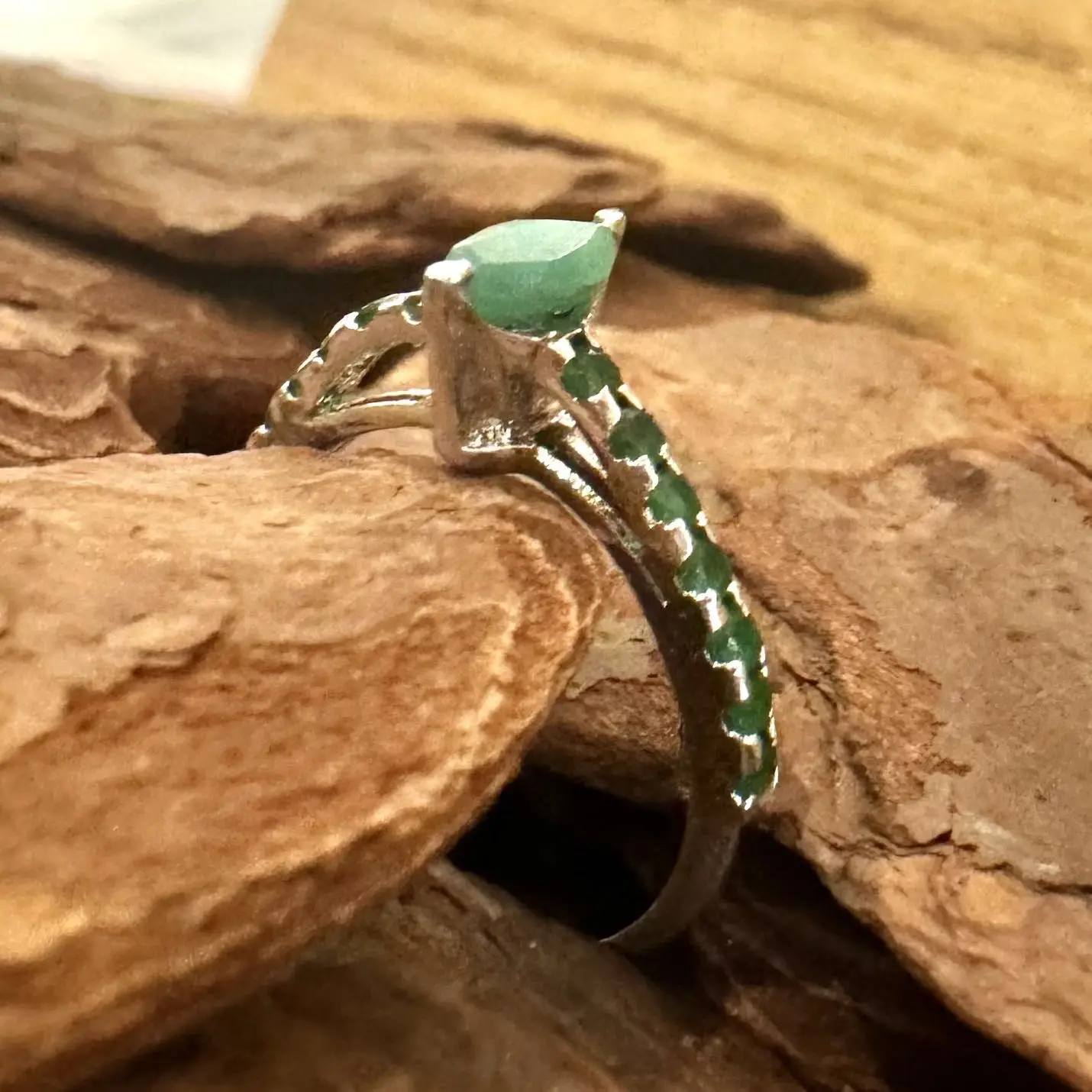 Anel Solitário Navete de Esmeralda indiana em Prata com banho de Ródio.