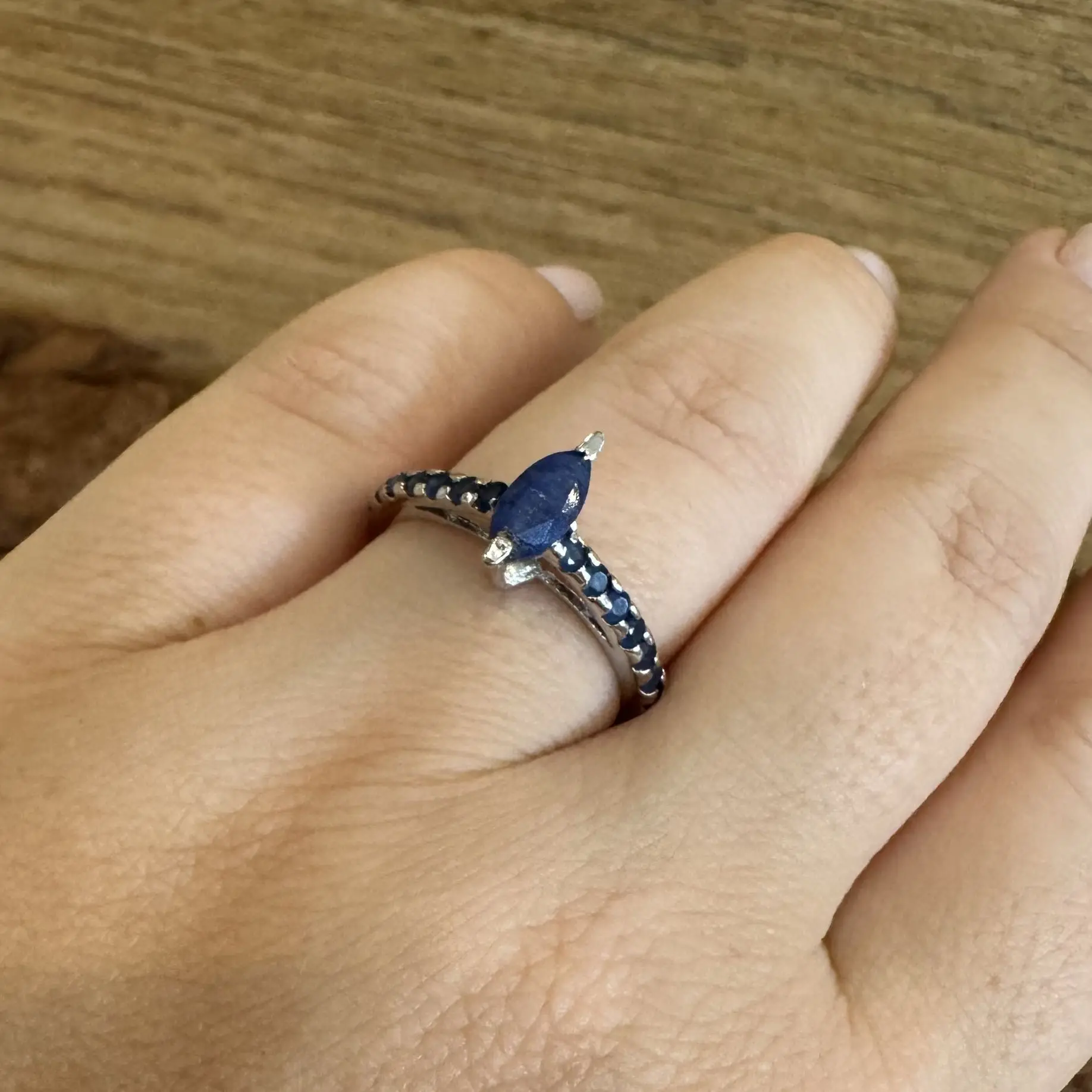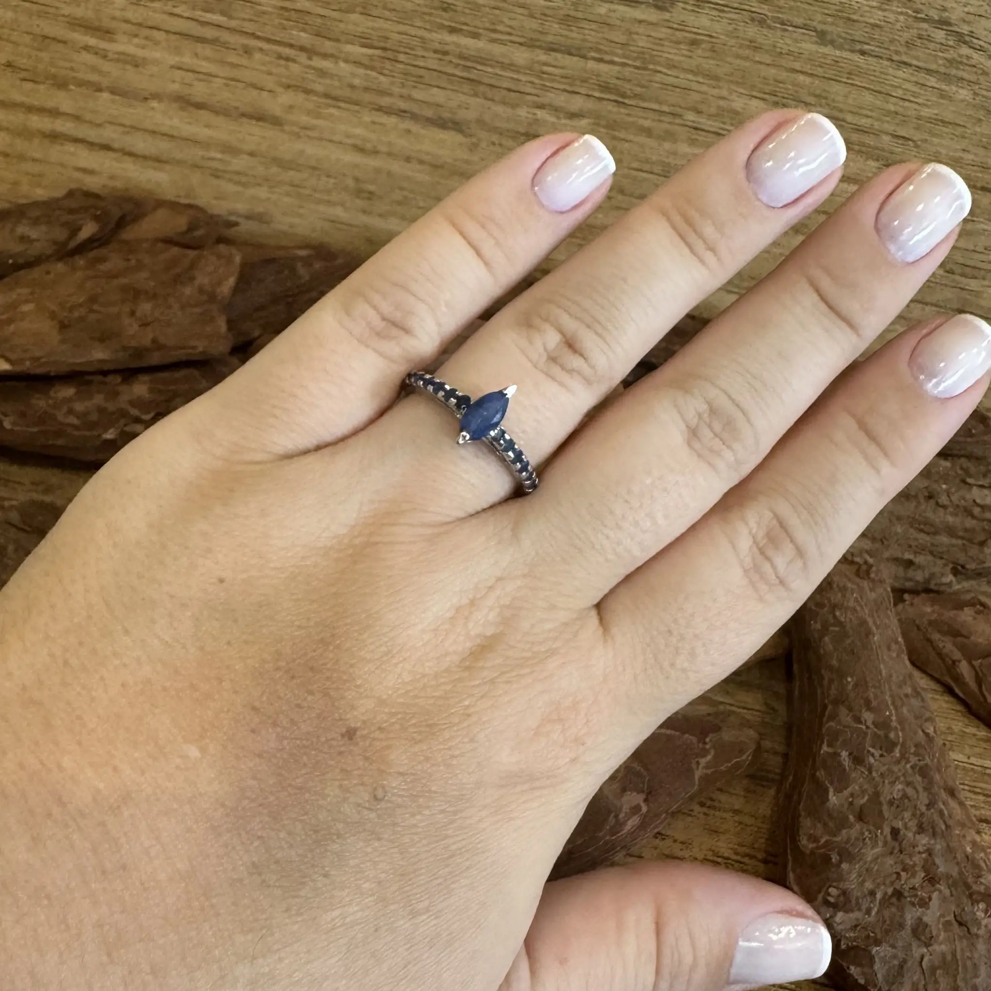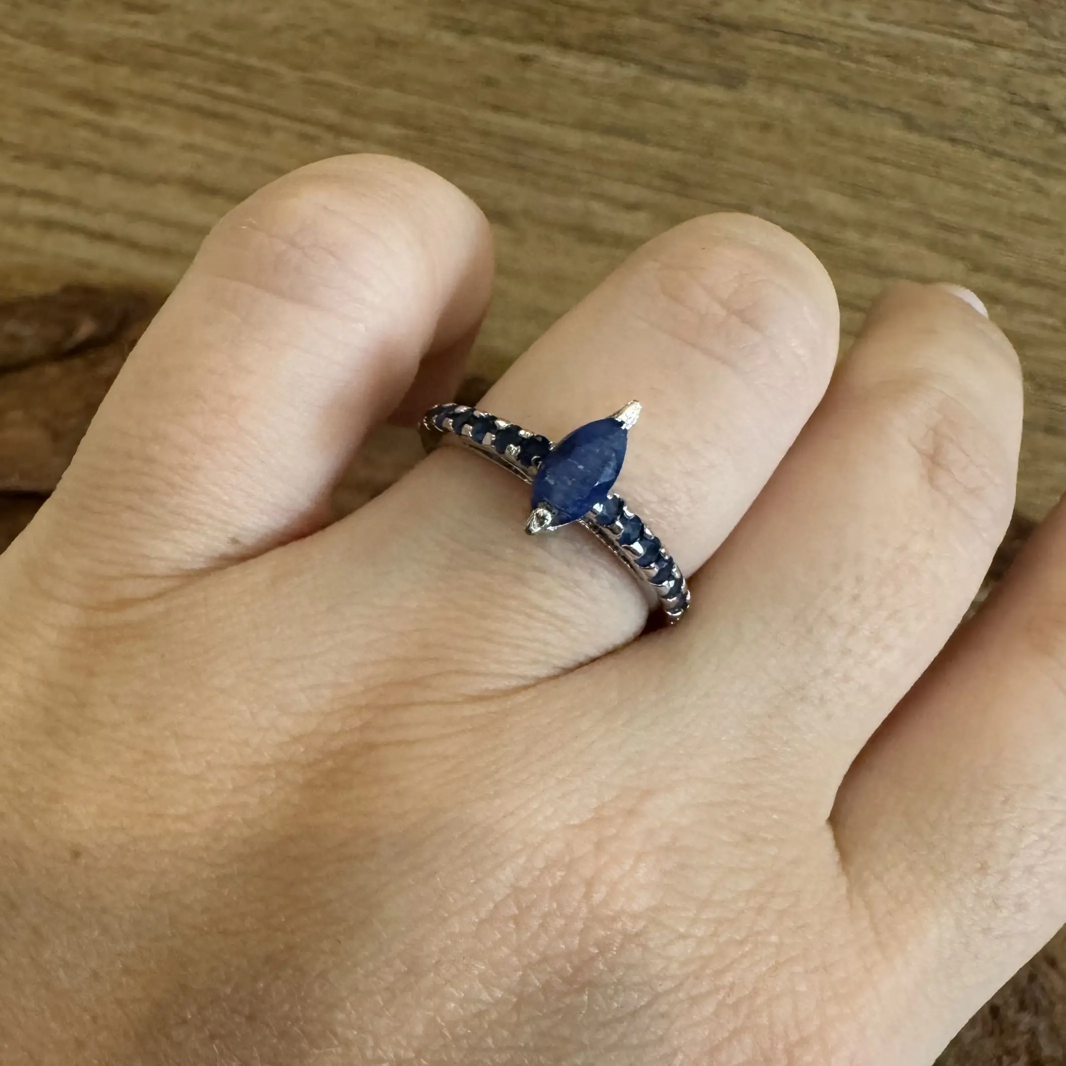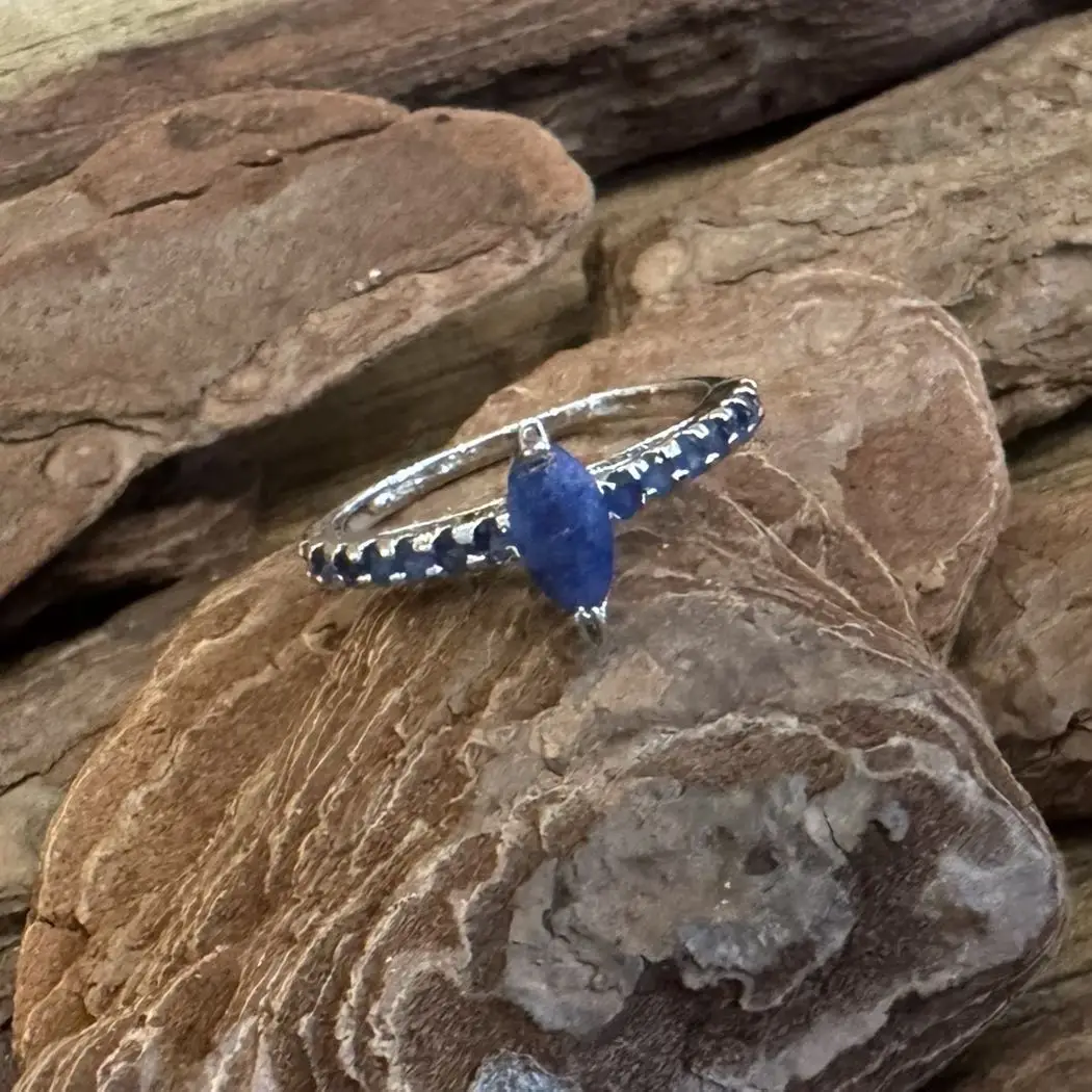 Anel Solitário Navete de Safira indiana em Prata com banho de Ródio.