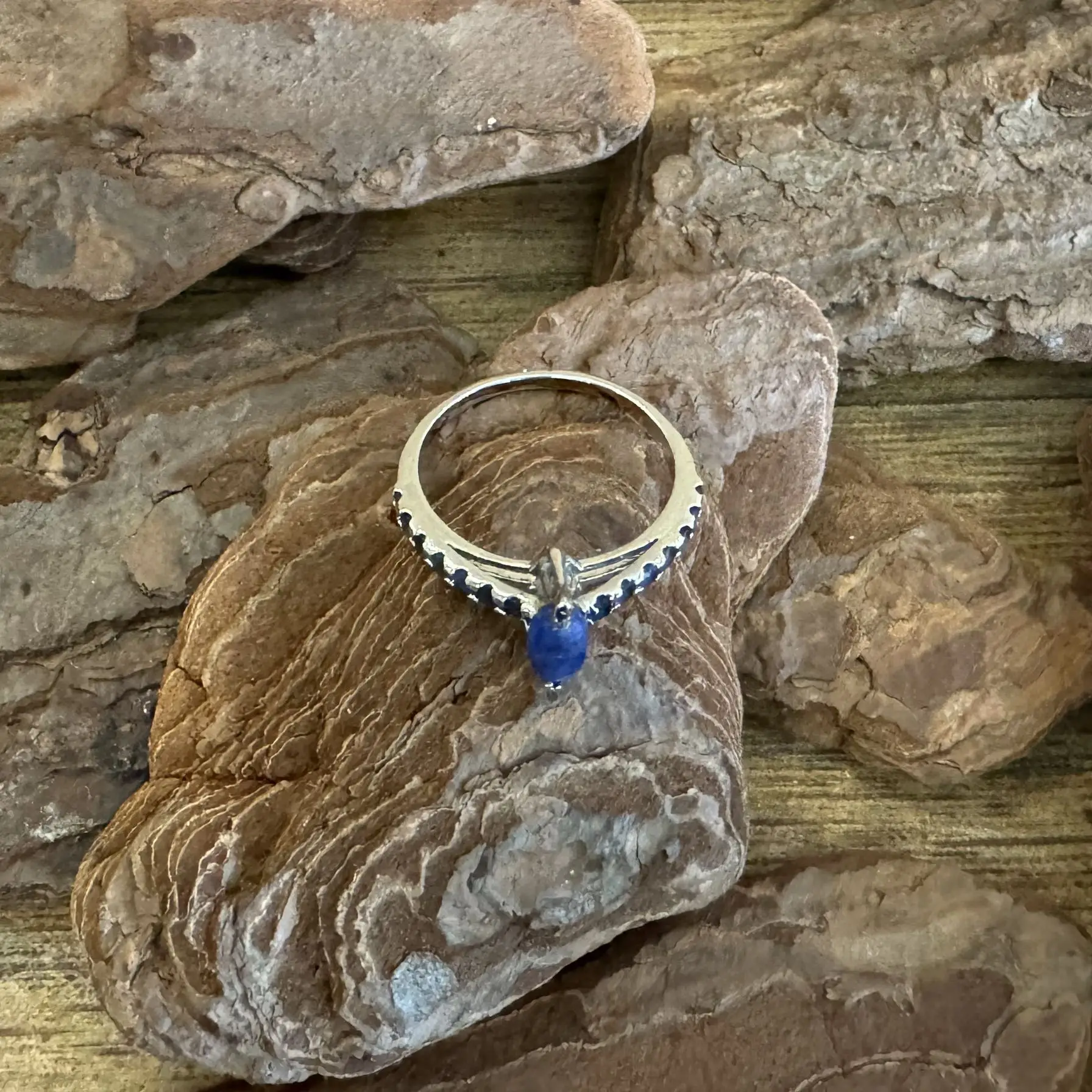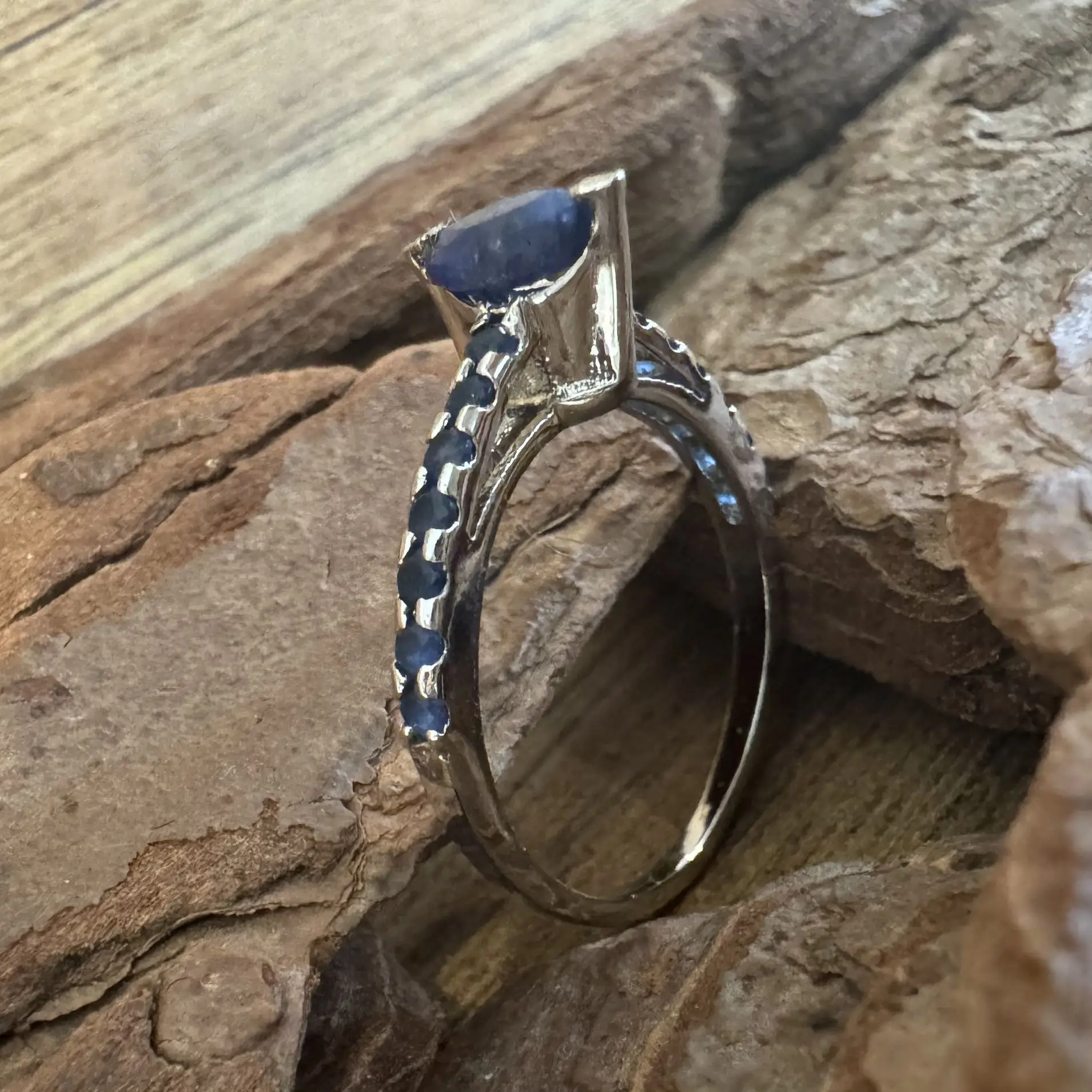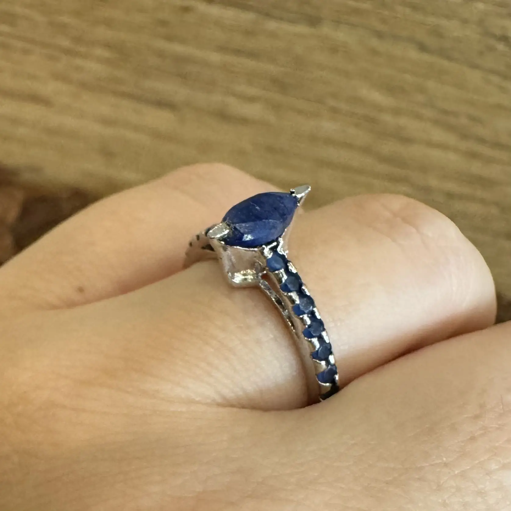 Anel Solitário Navete de Safira indiana em Prata com banho de Ródio.