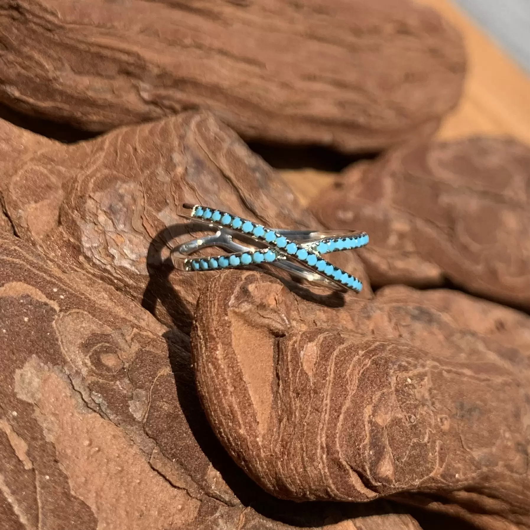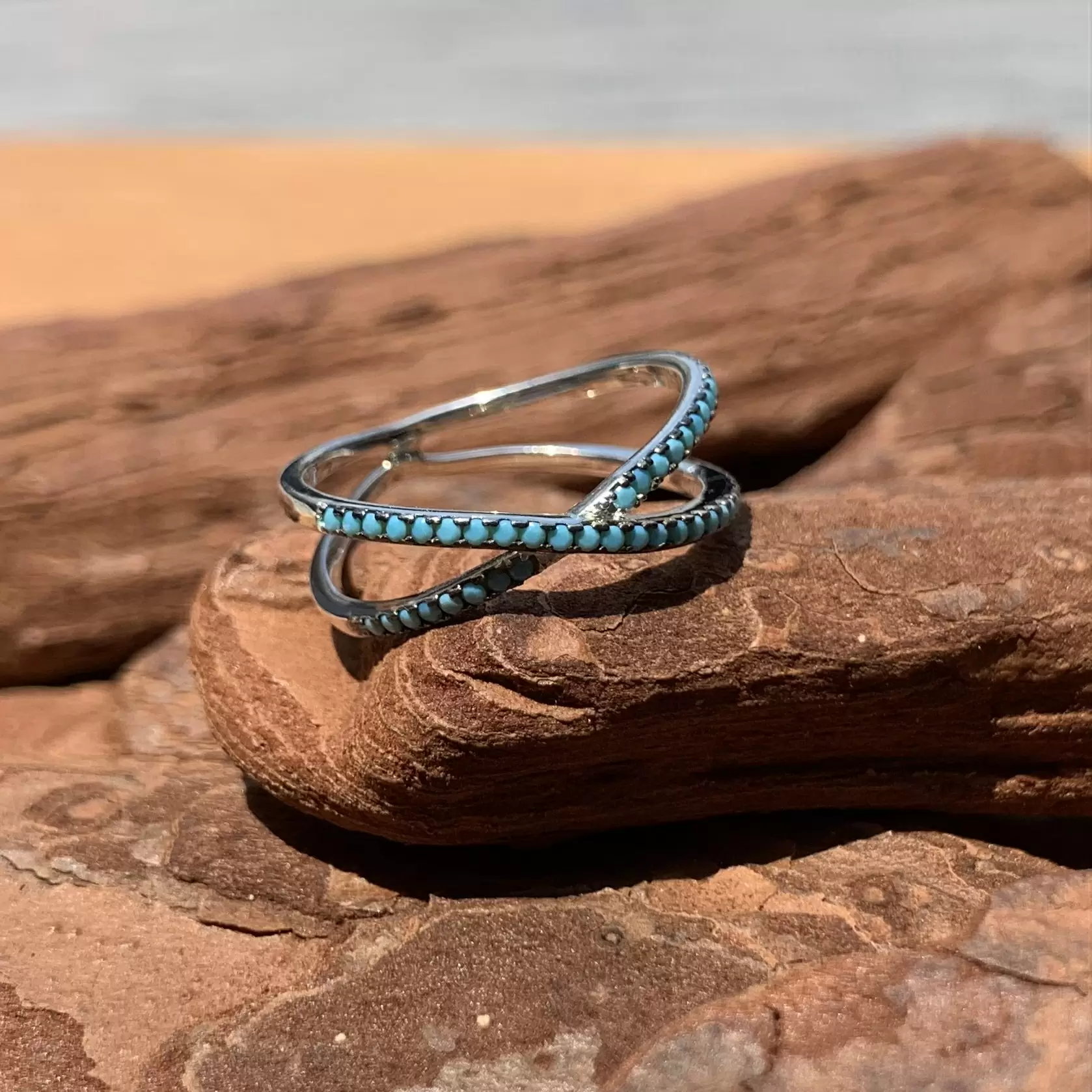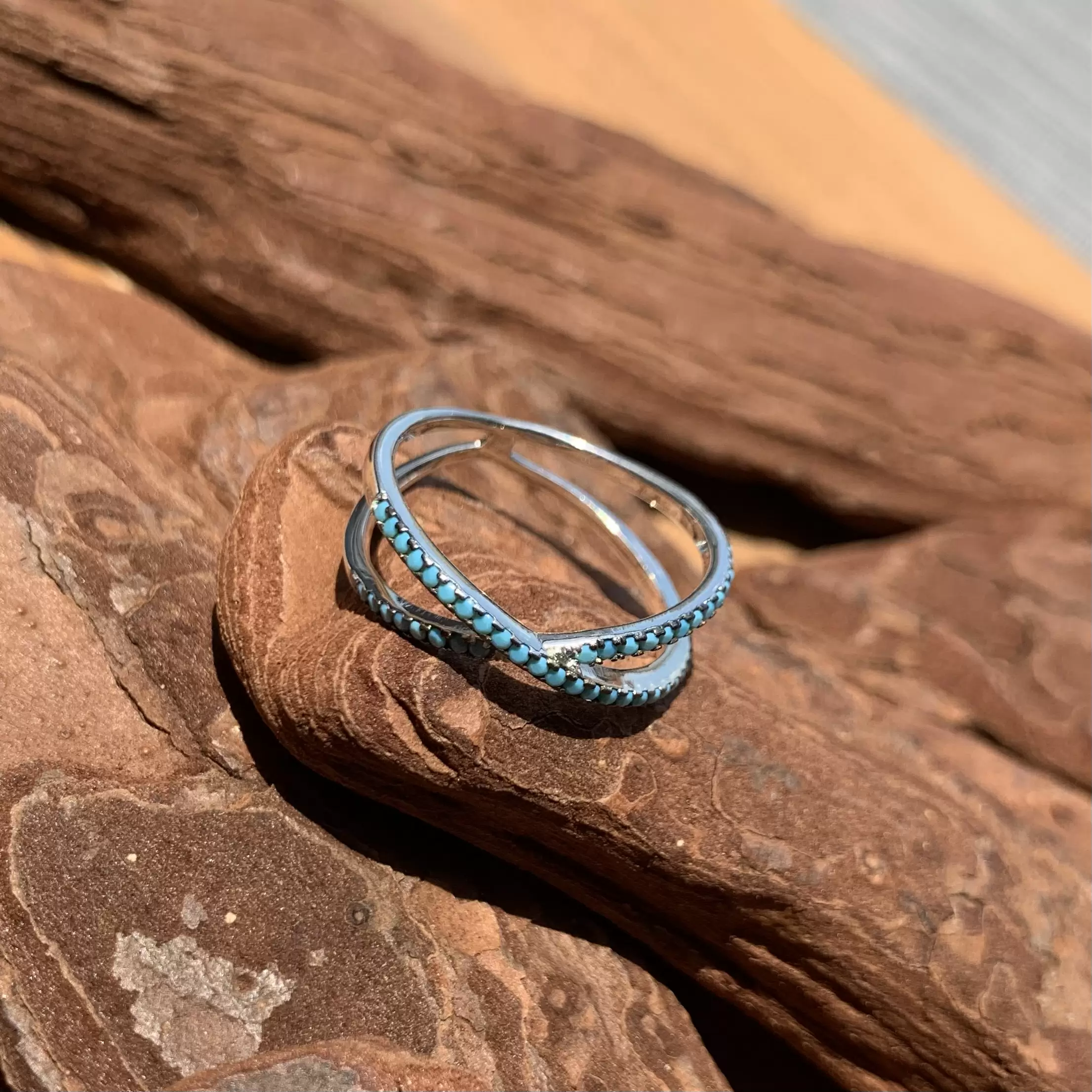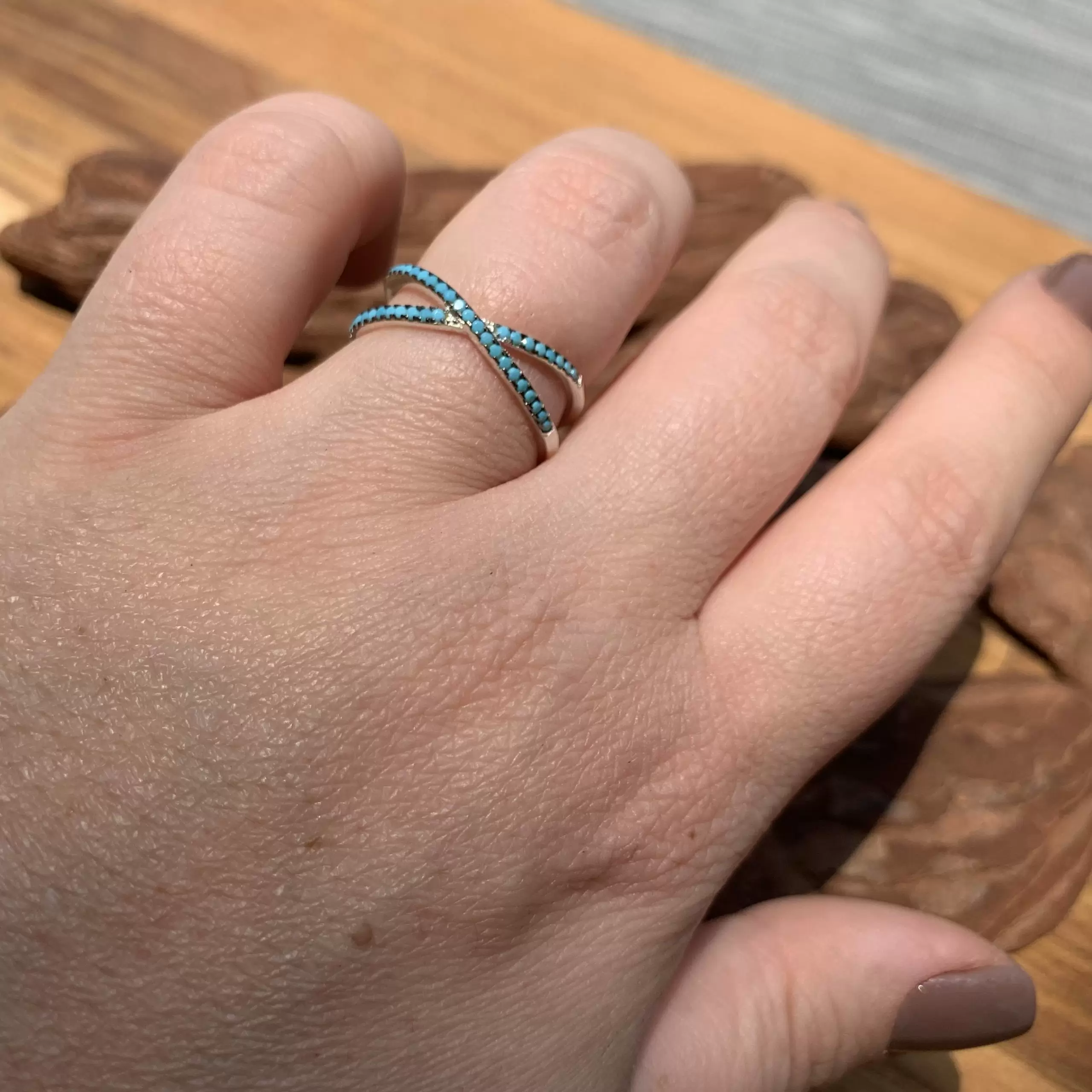 Anel X fino de nano turquesa feito em prata 925 com banho de ródio.