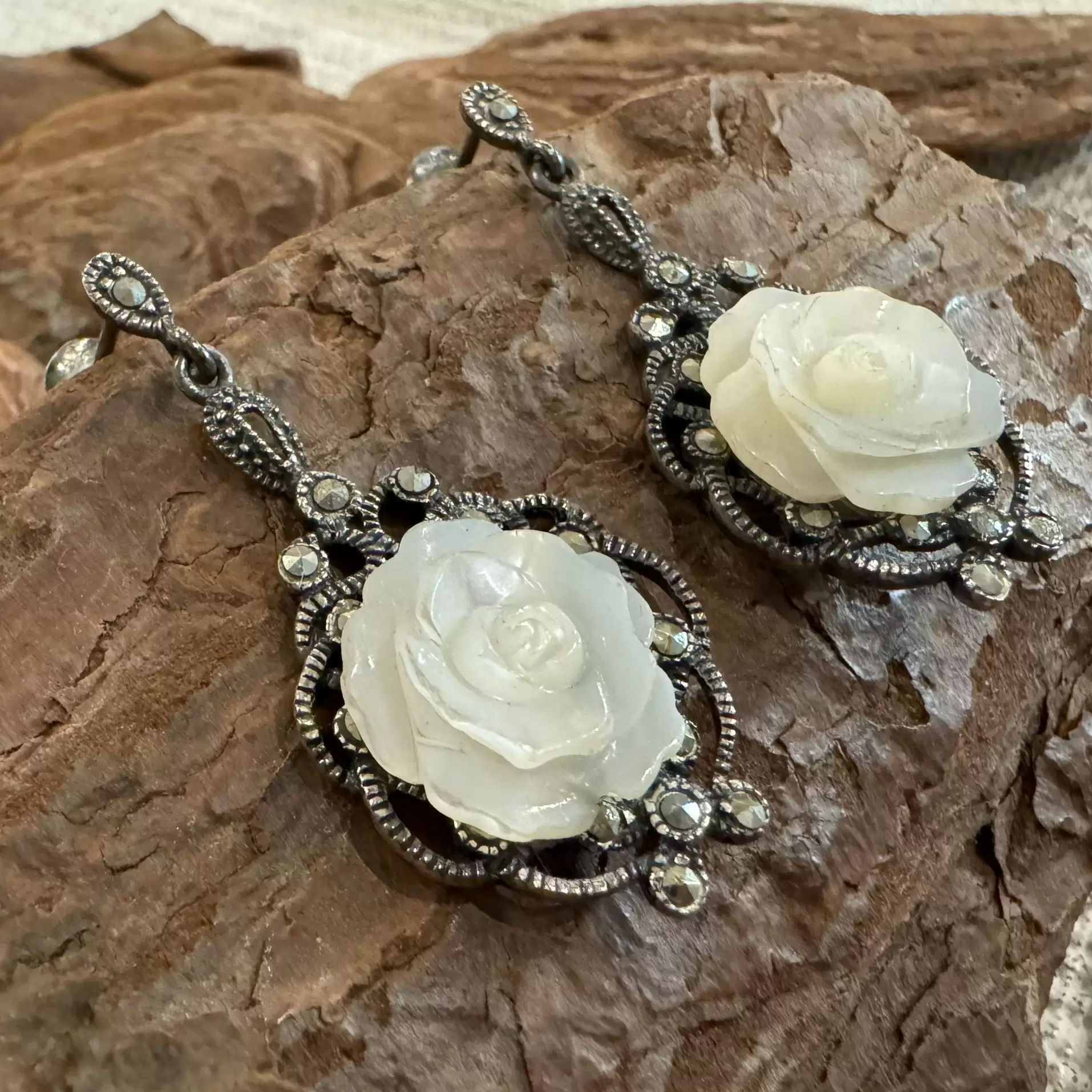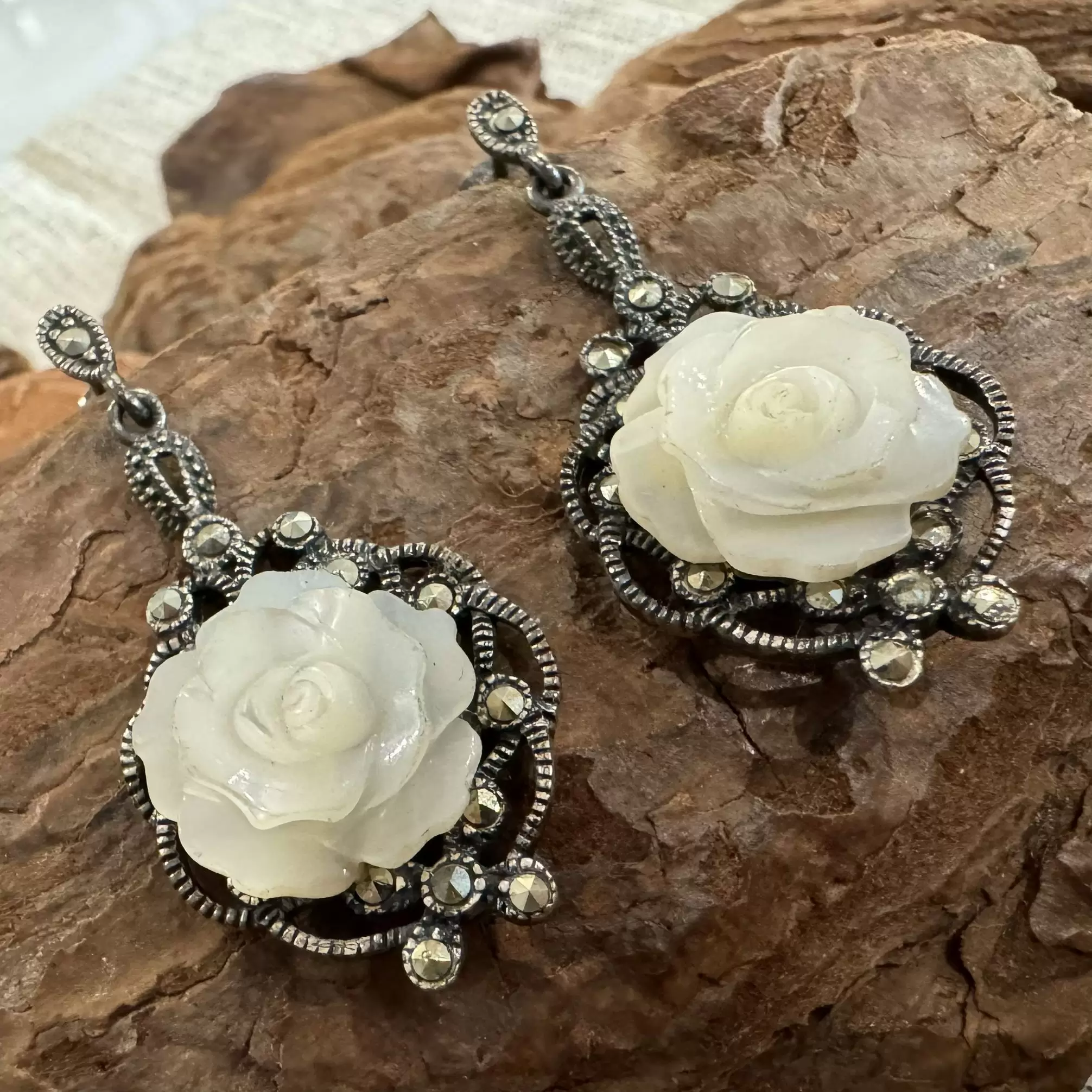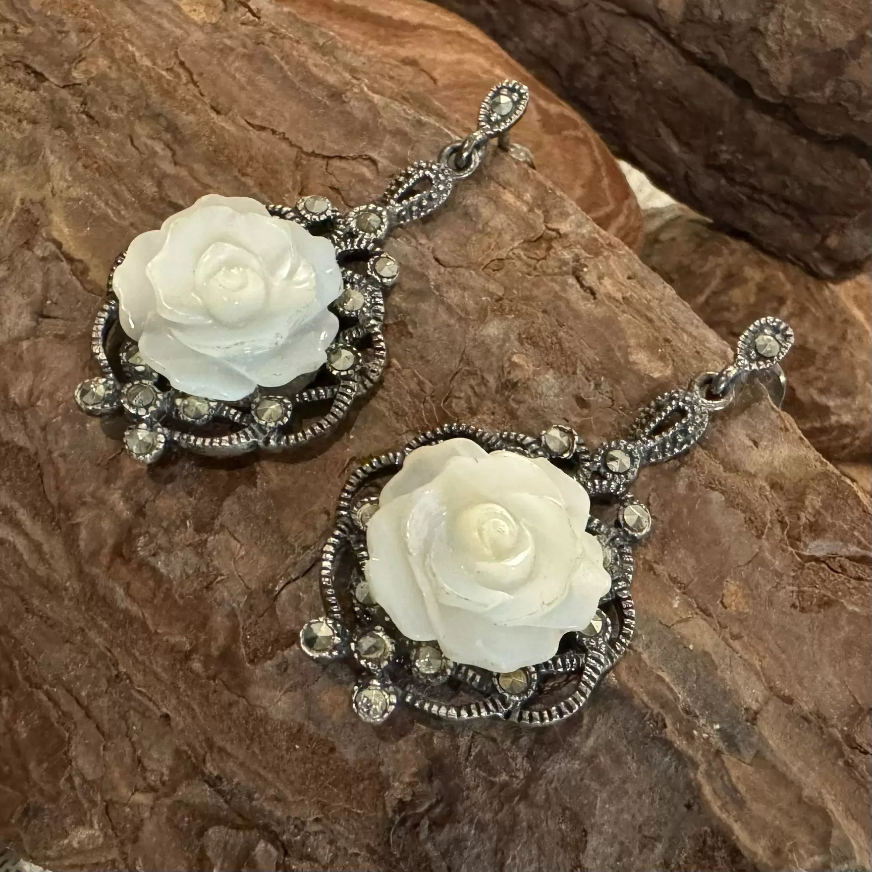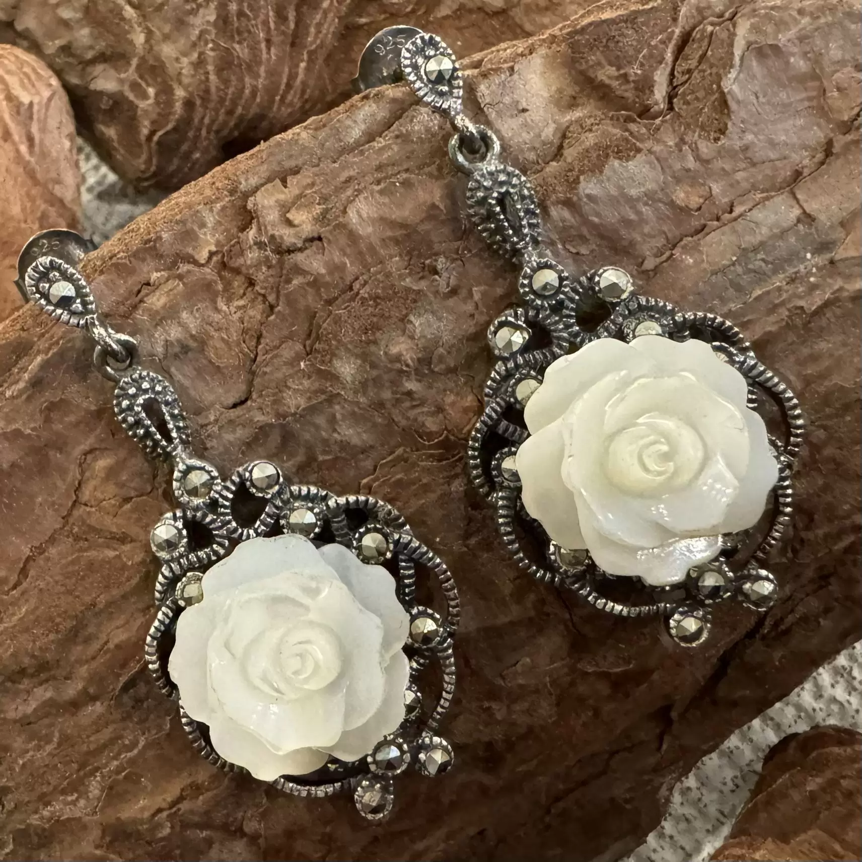 Brinco Flor Rosa de Madrepérola com Marcassitas em Prata 925.