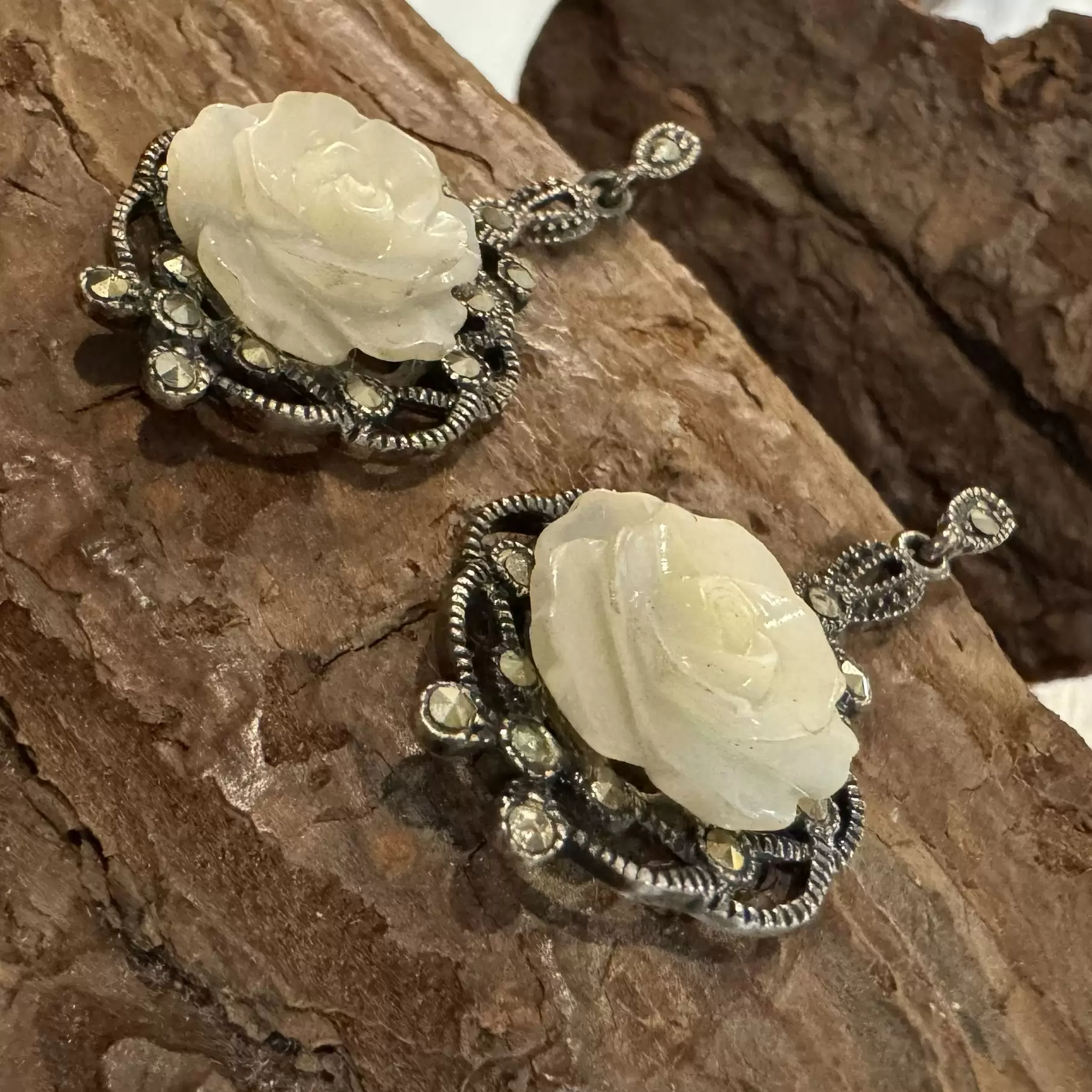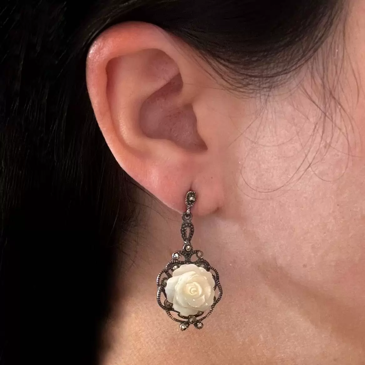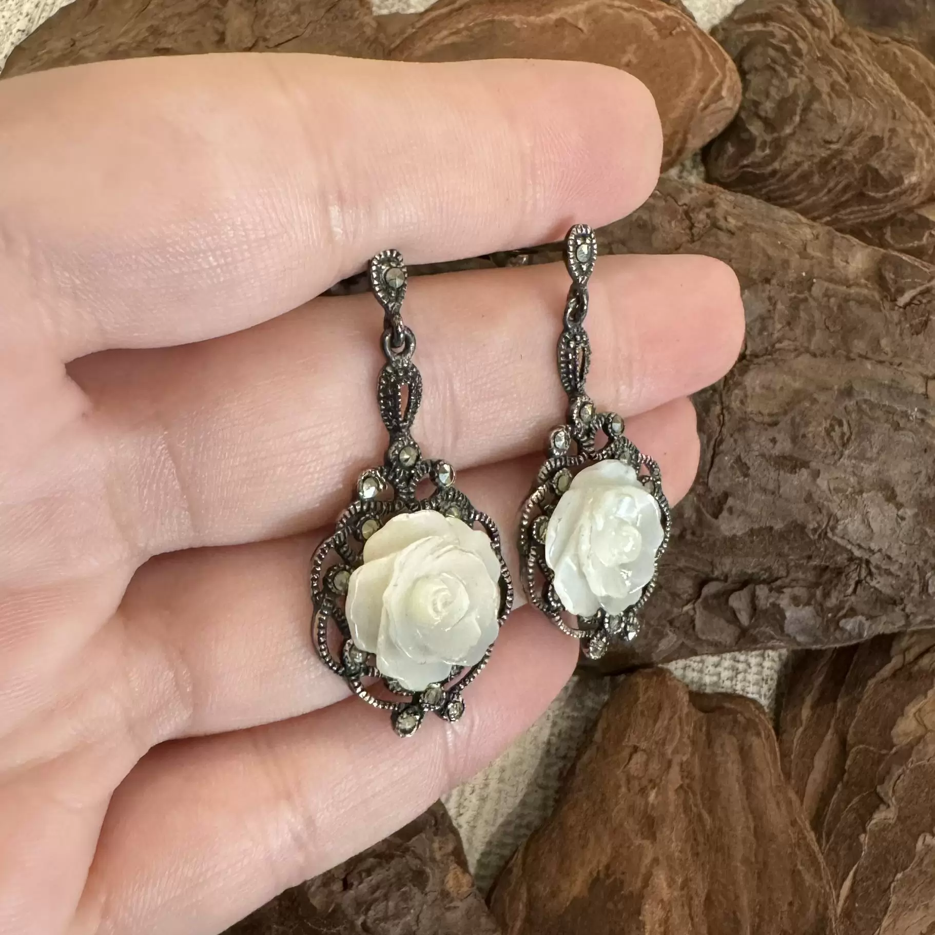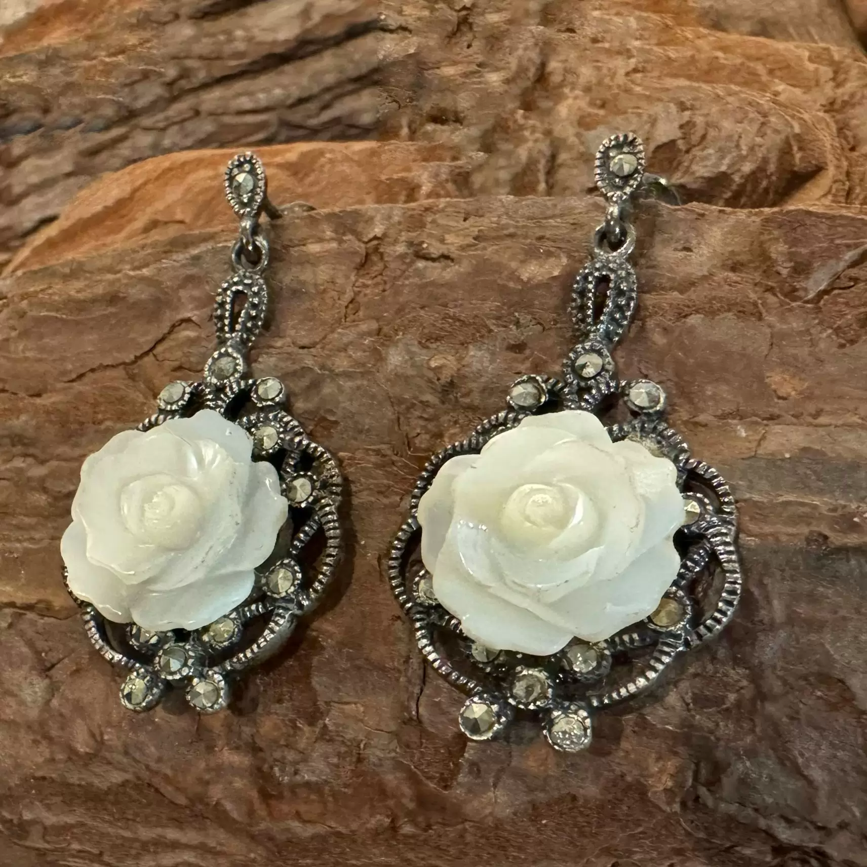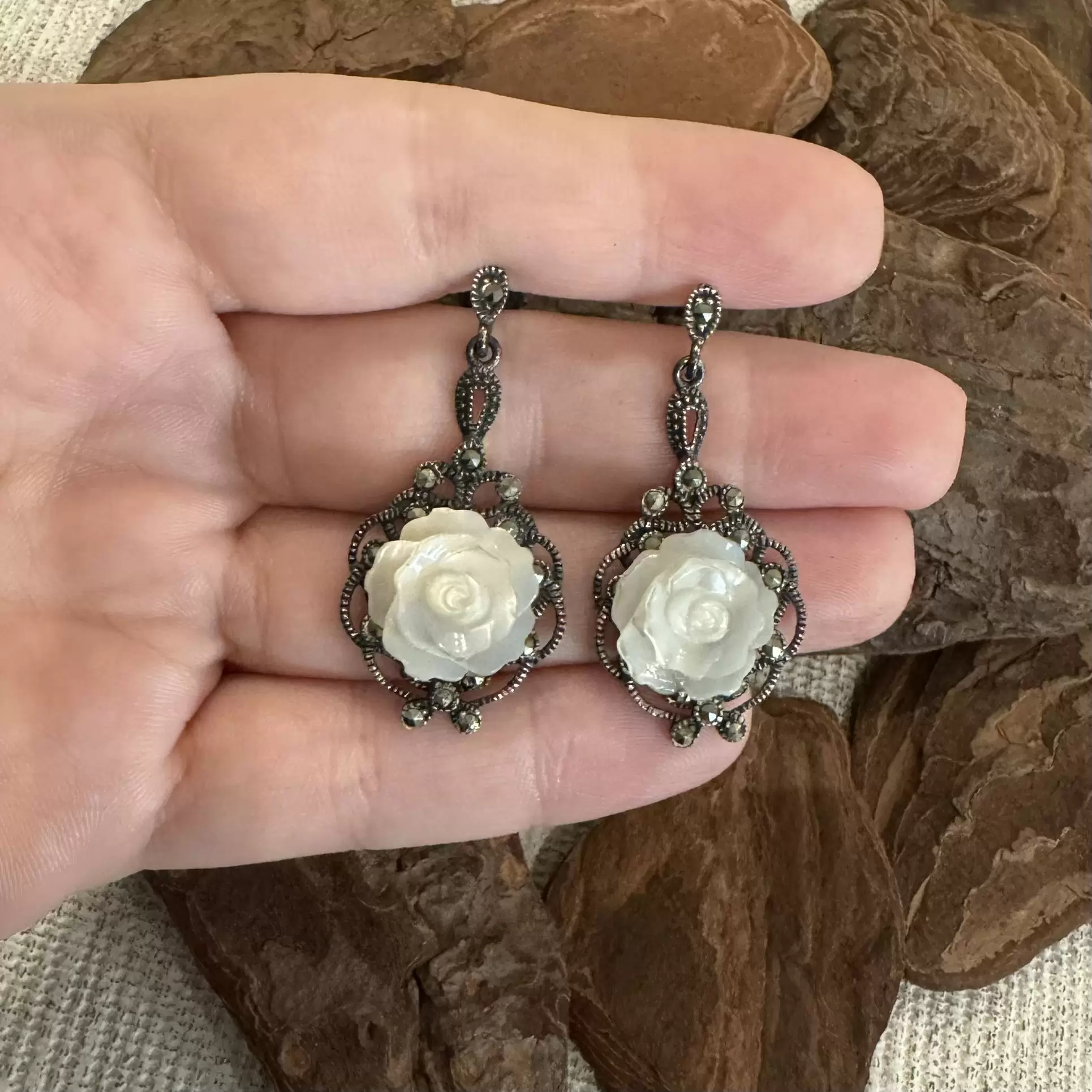 Brinco Flor Rosa de Madrepérola com Marcassitas em Prata 925.