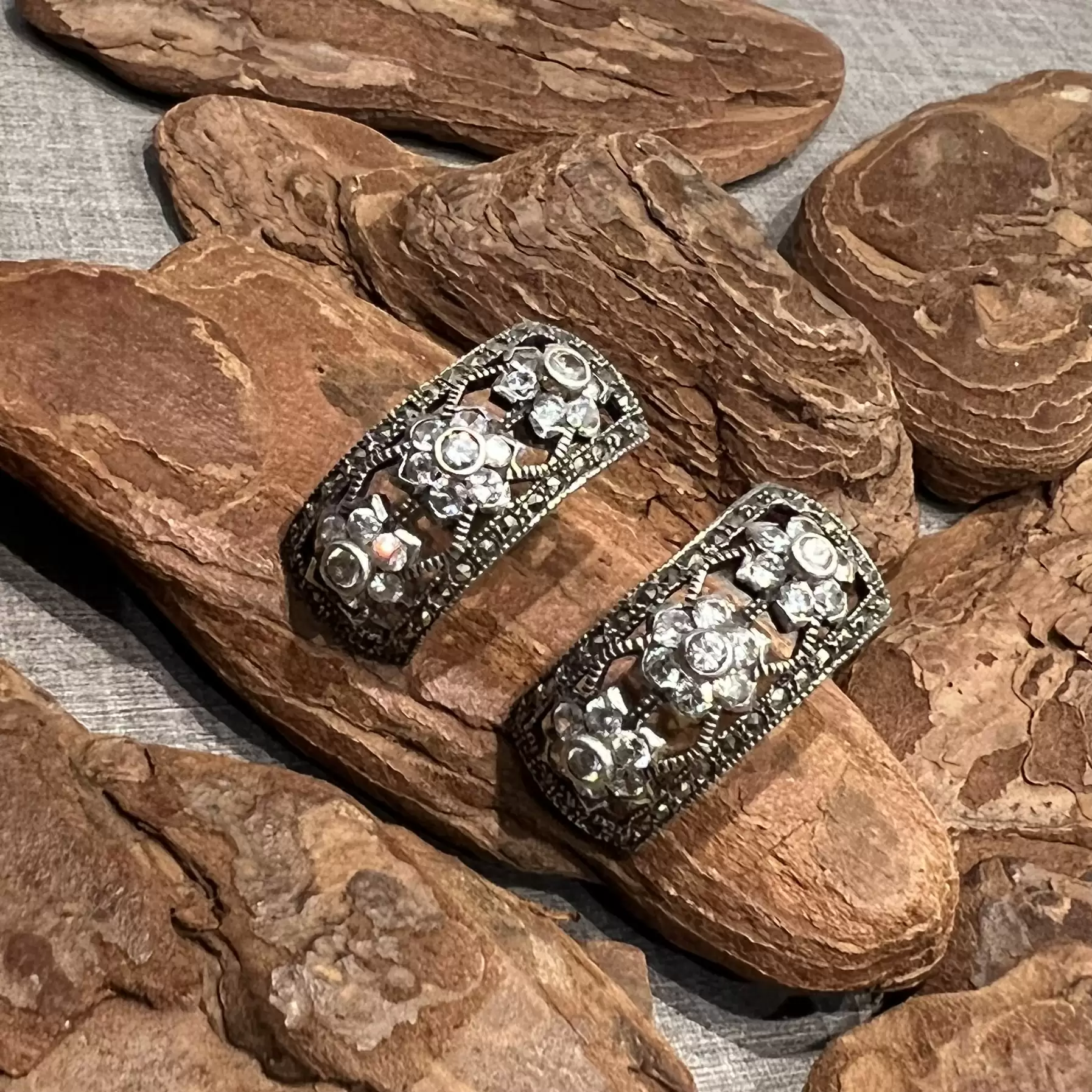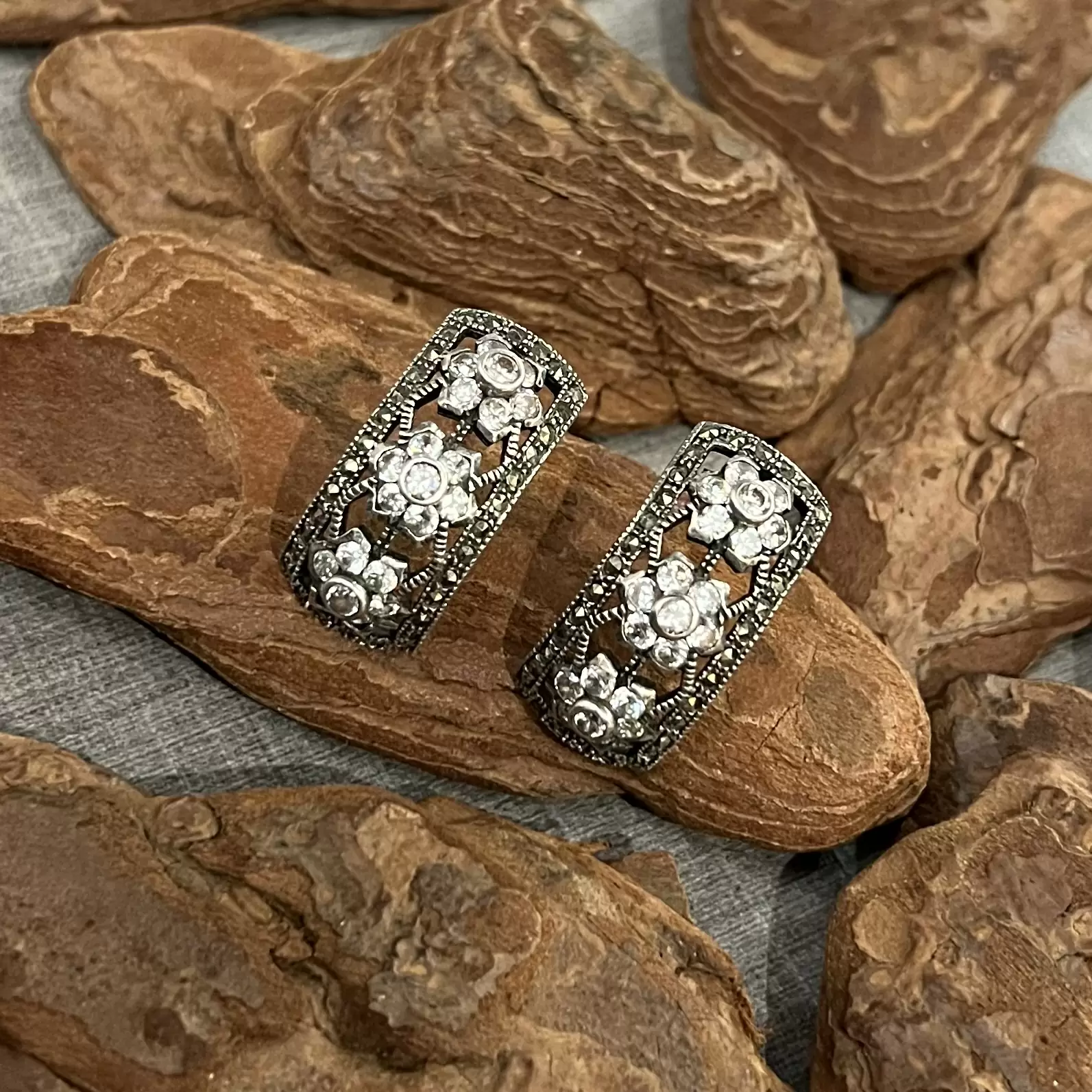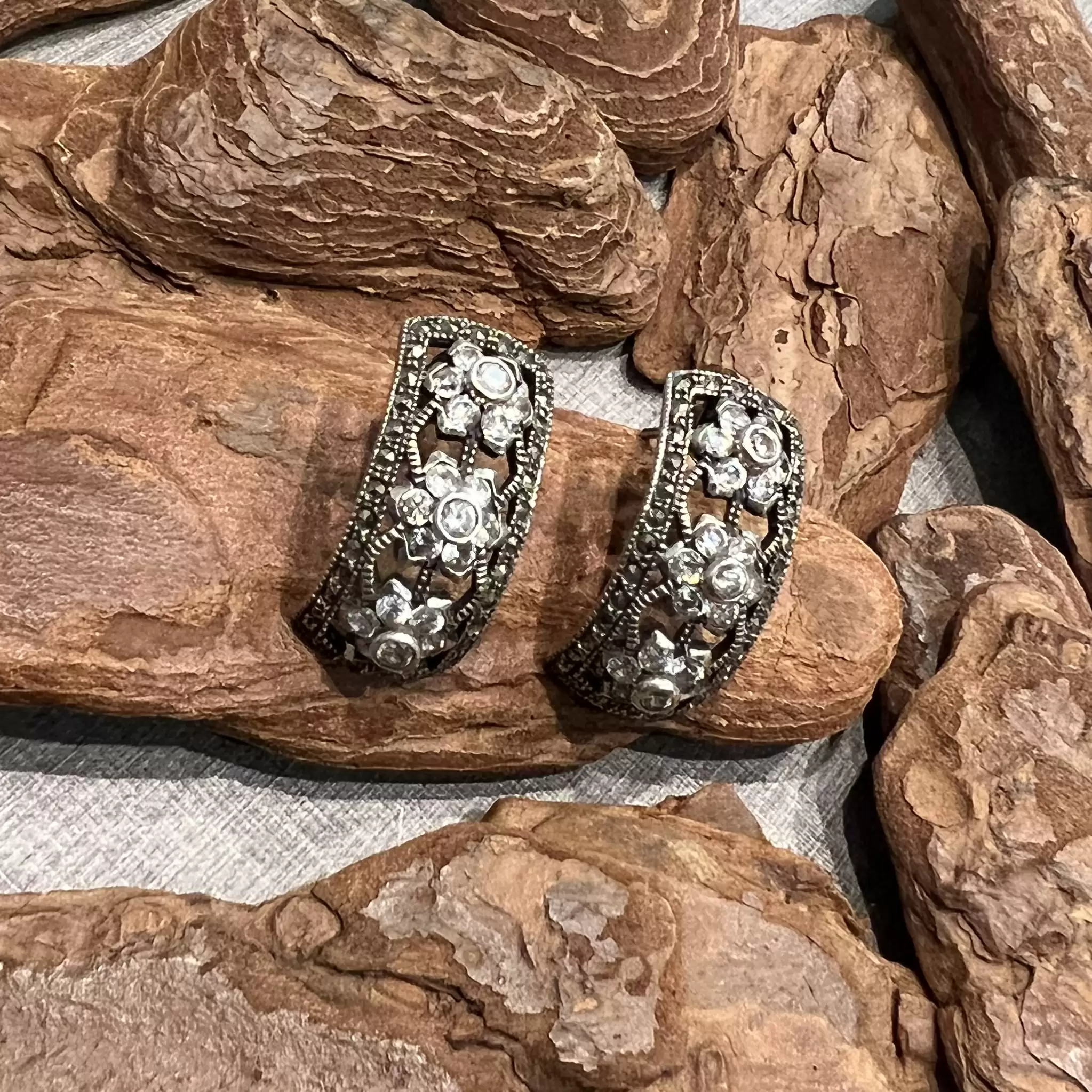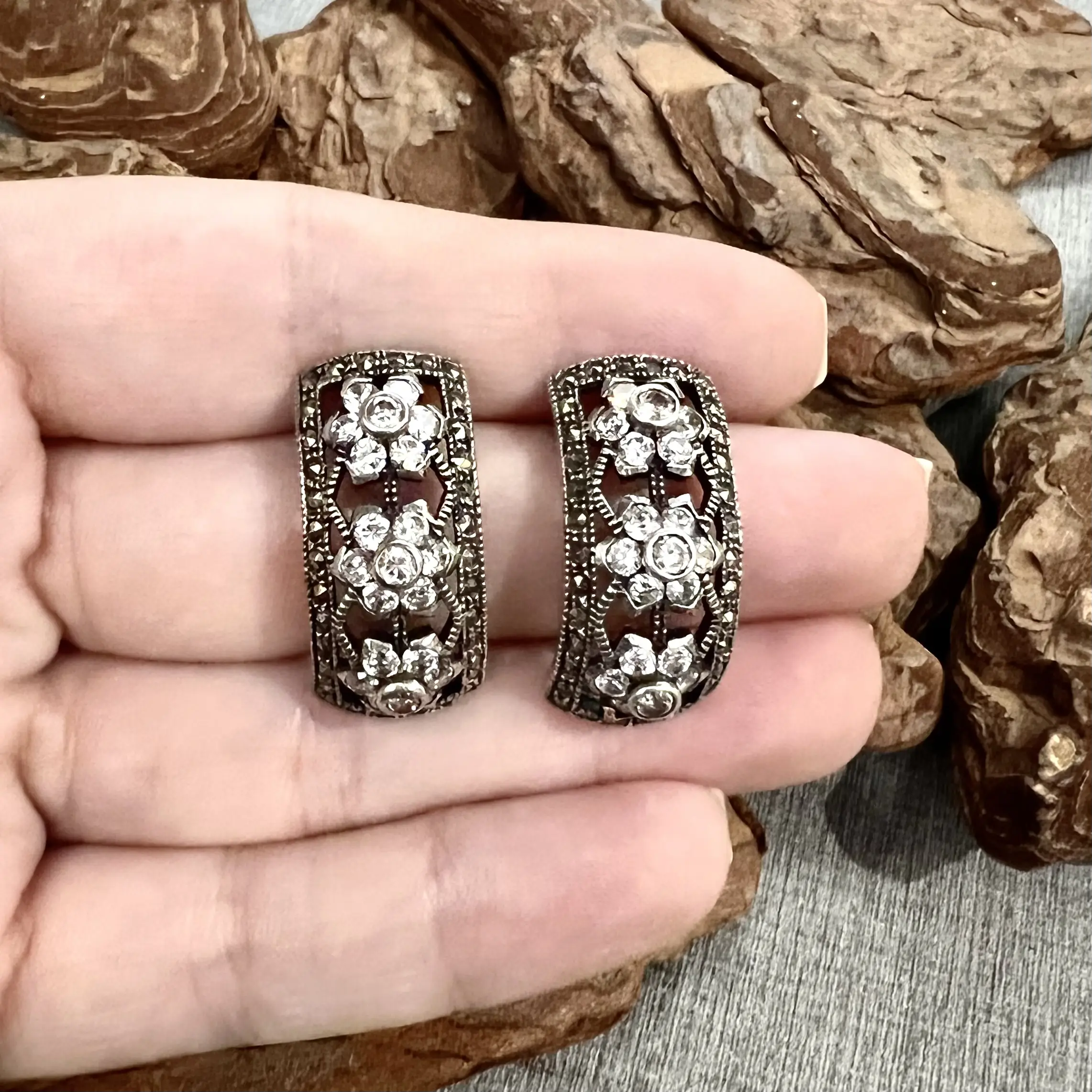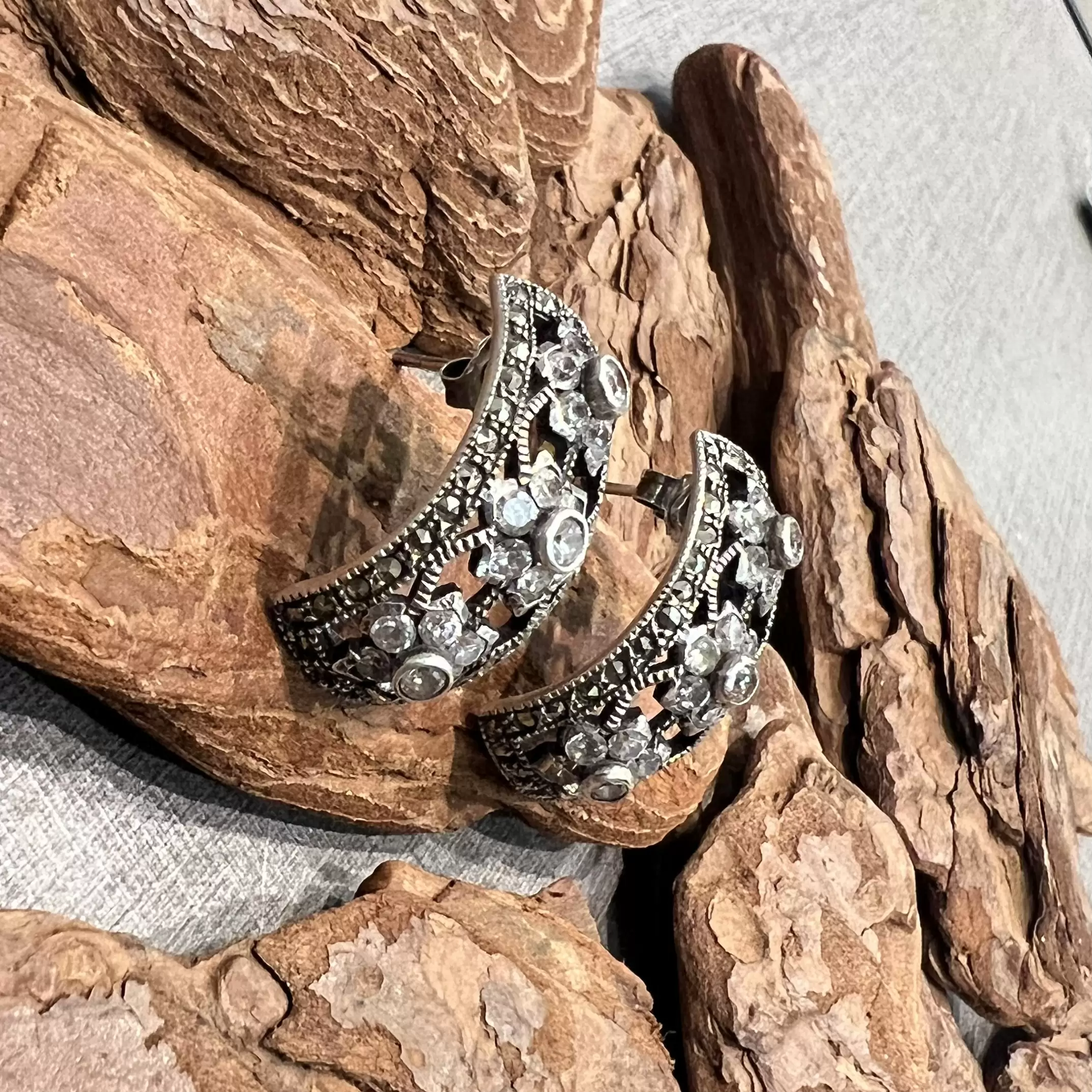 Brinco meia argola de marcassitas com zircônias brancas feito em Prata 925.