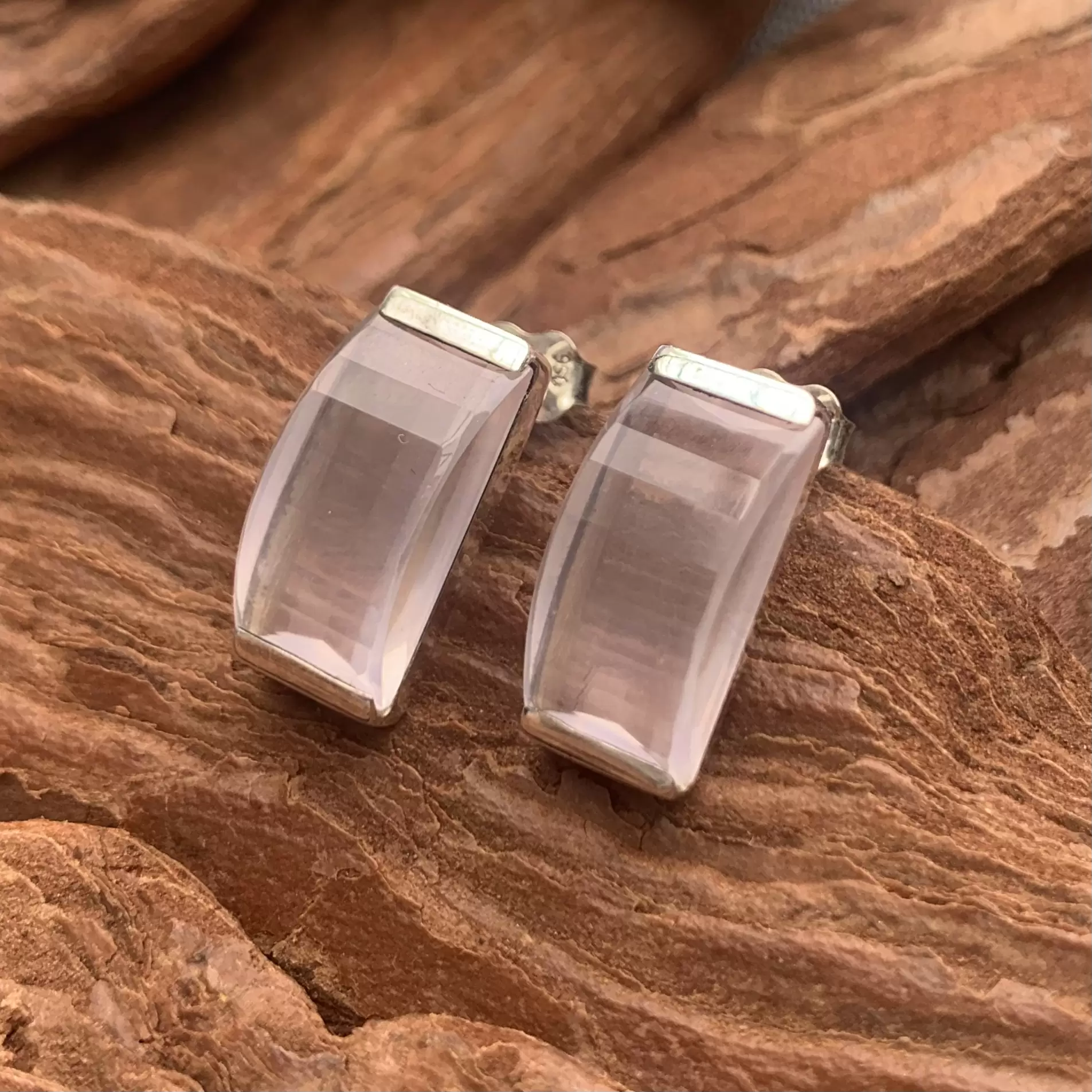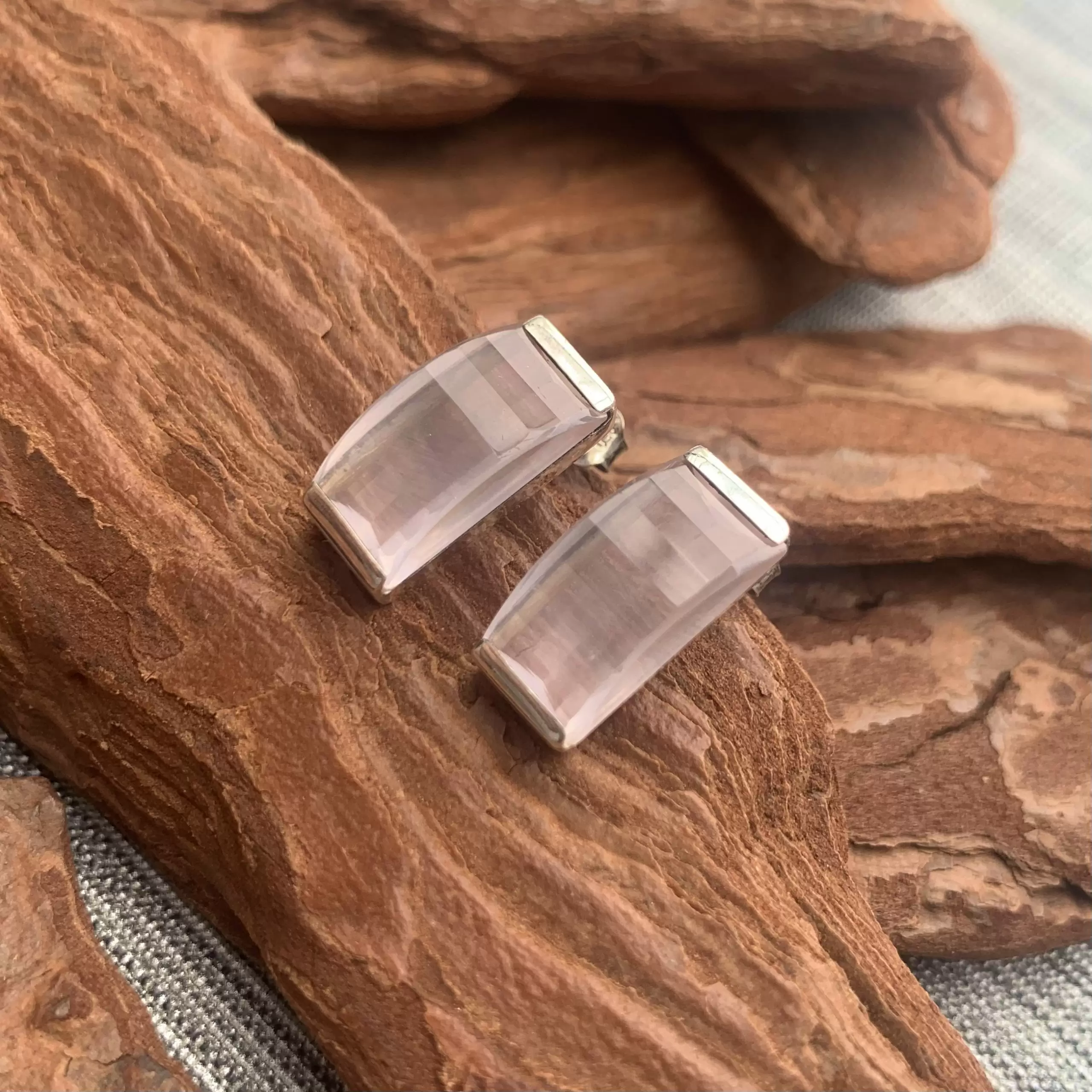 Brinco retangular fixo de quartzo rosa feito em Prata 925.