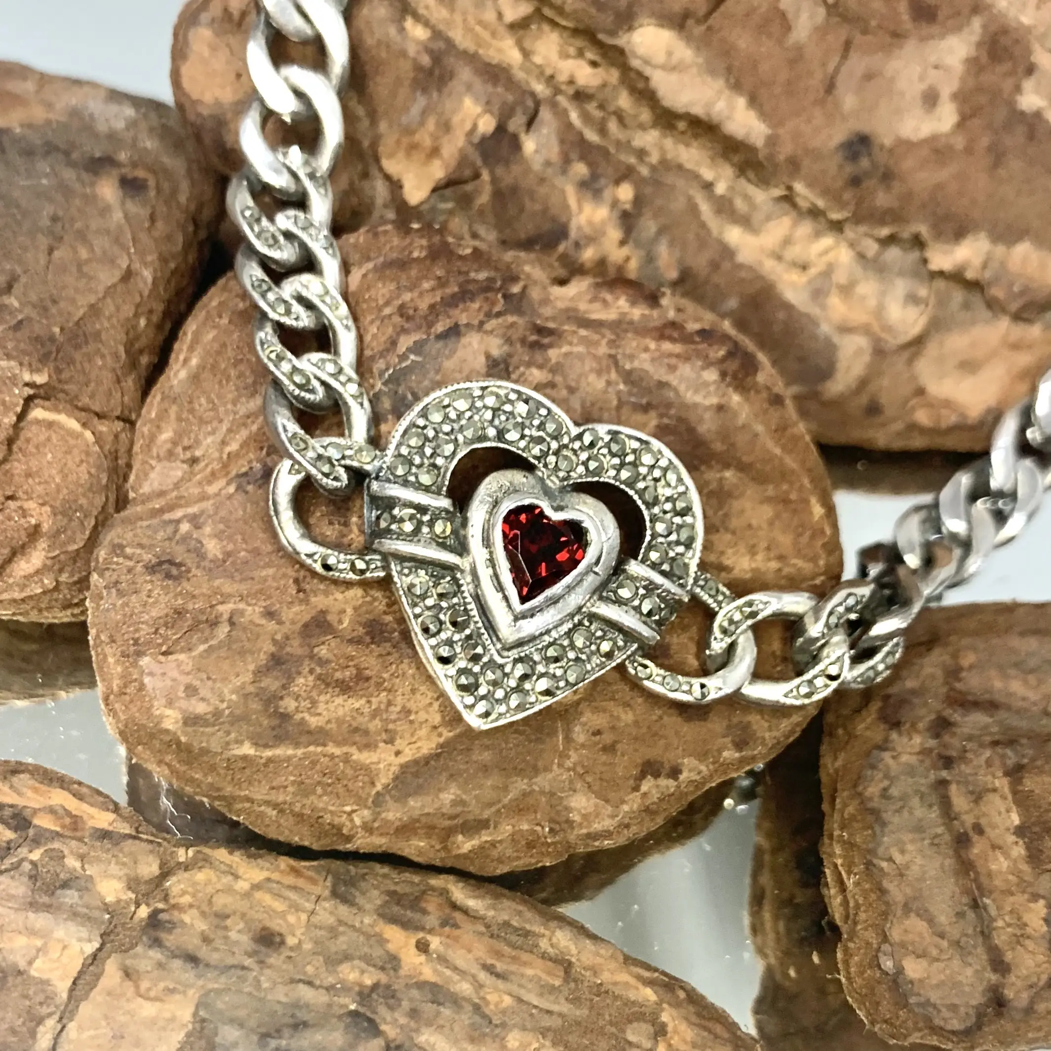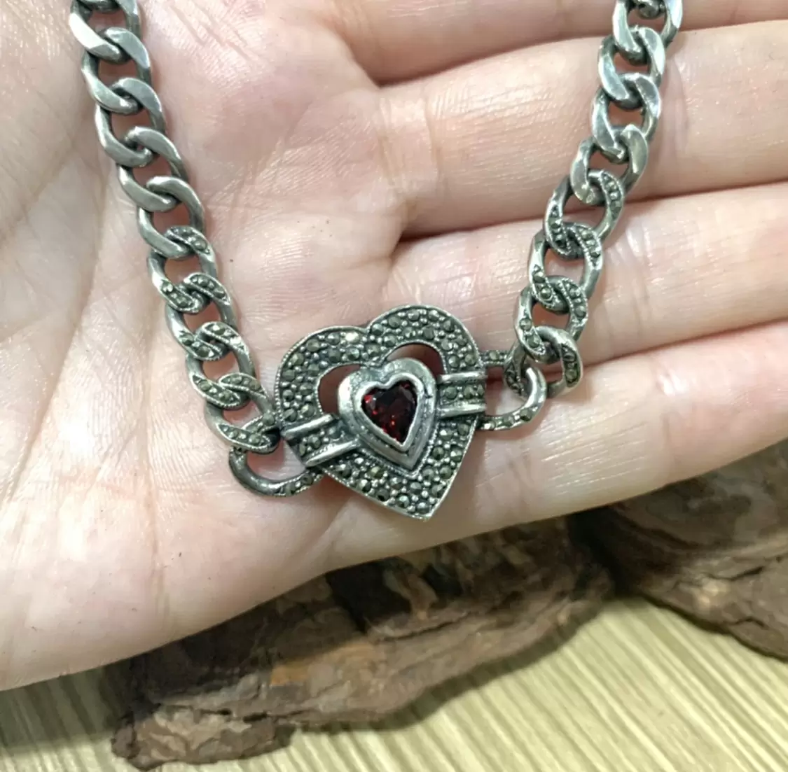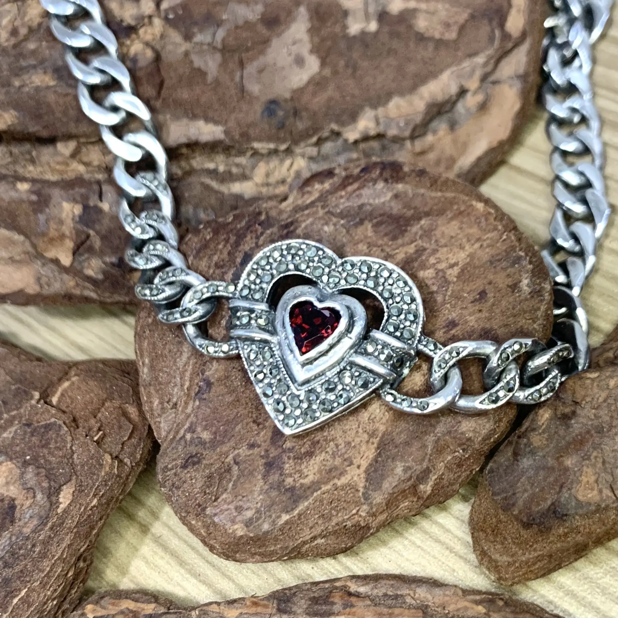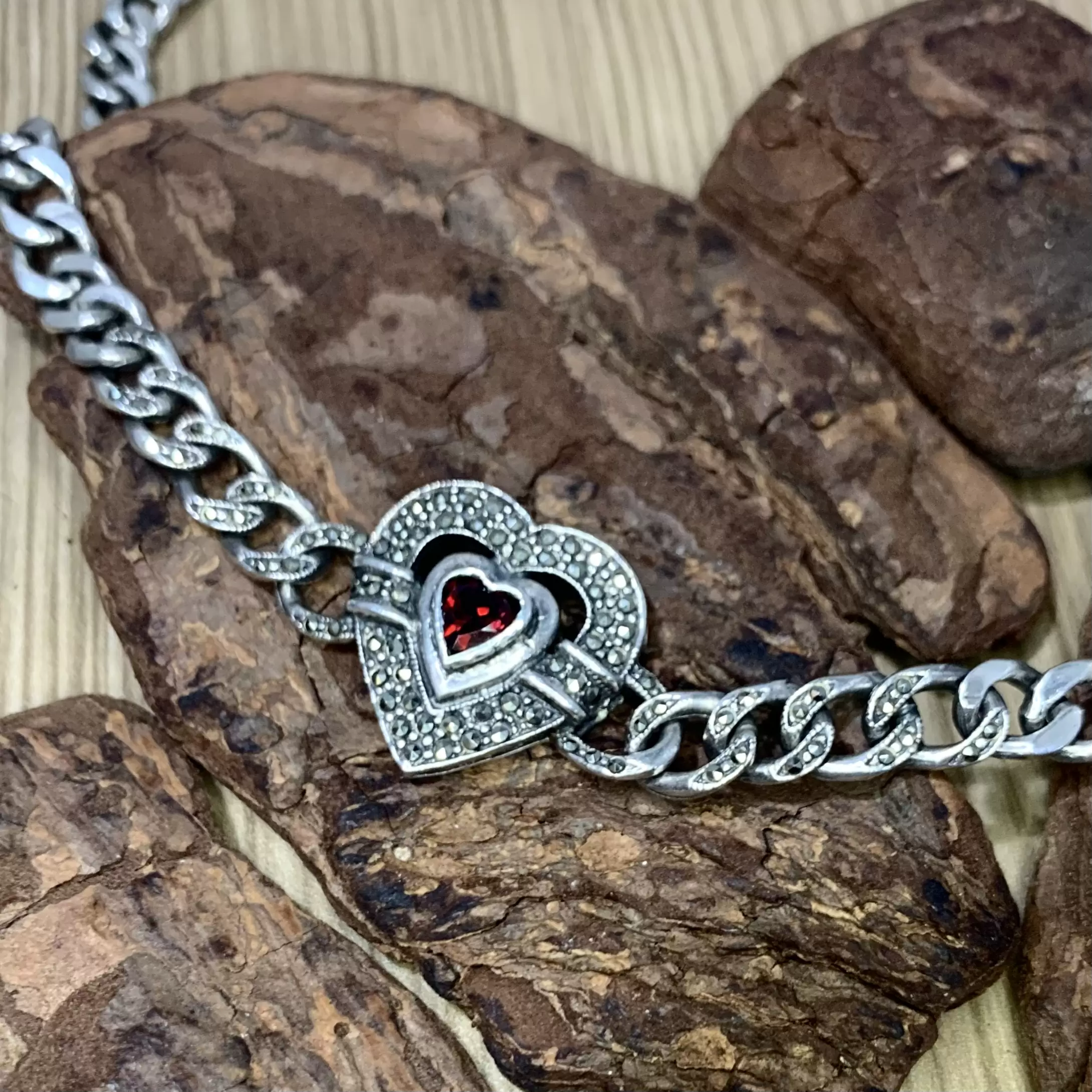 Colar coração de granada com marcassita em correte grumet grossa de Prata 925.