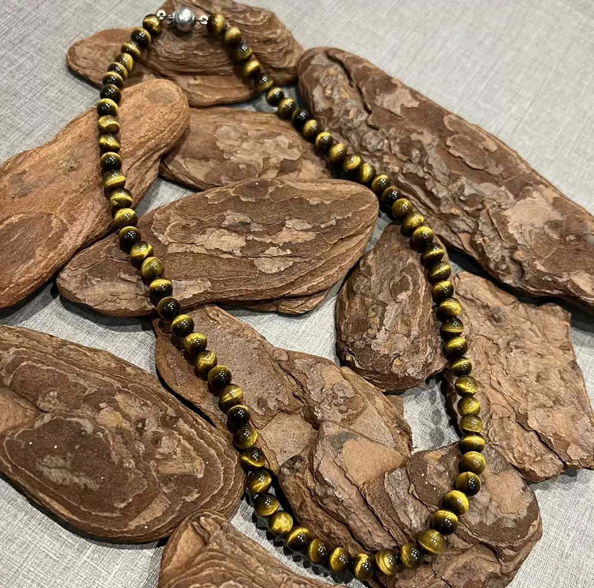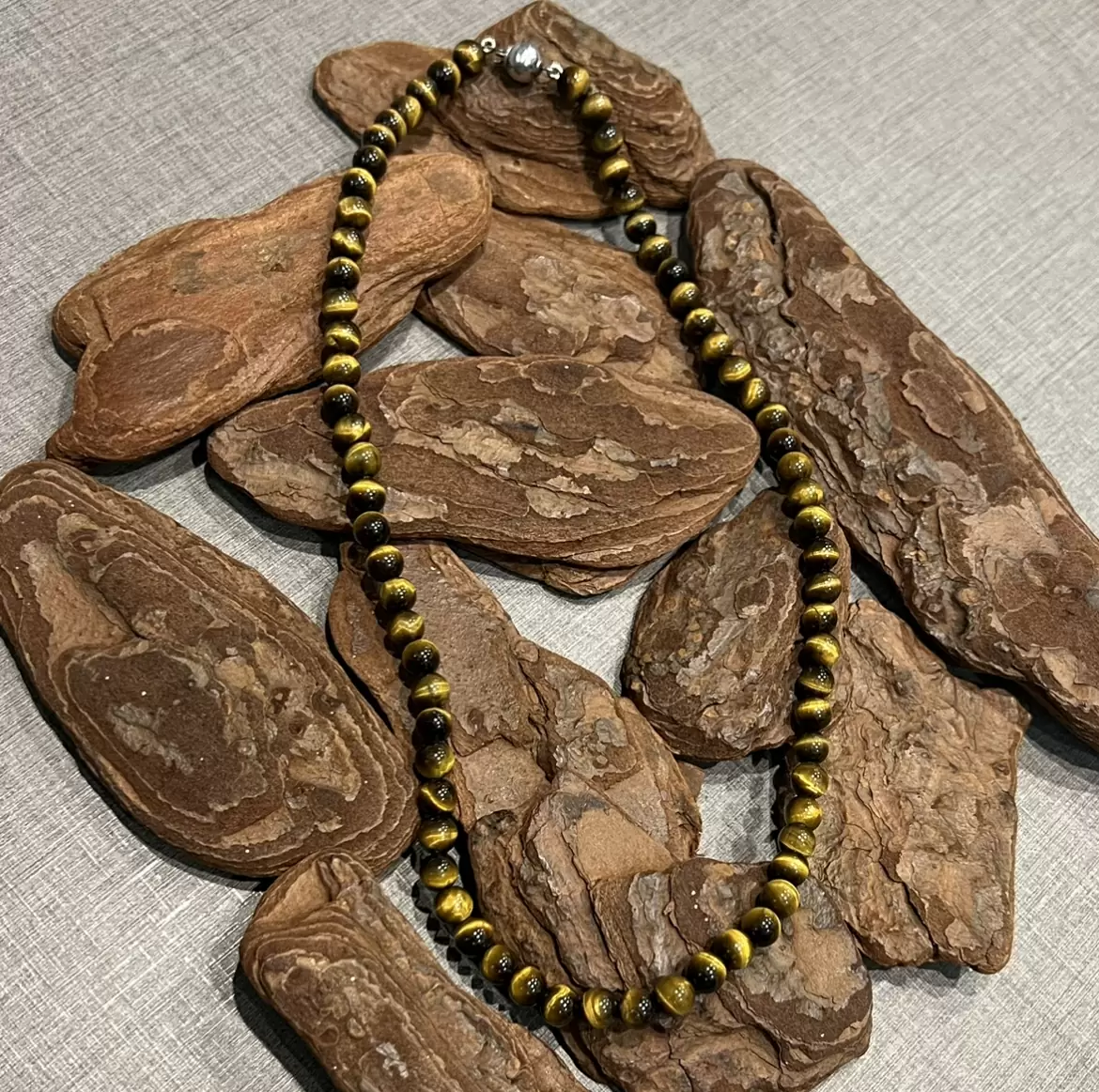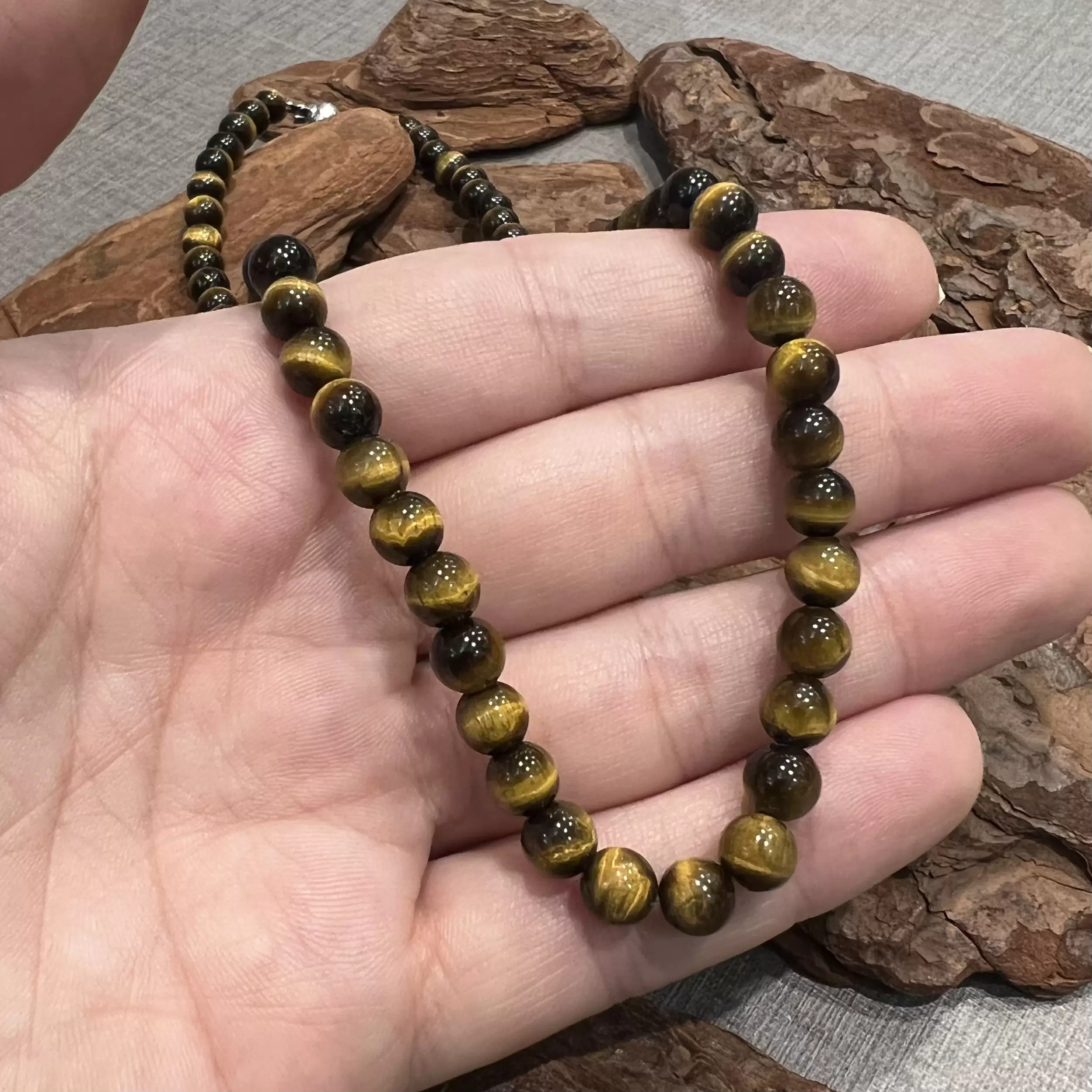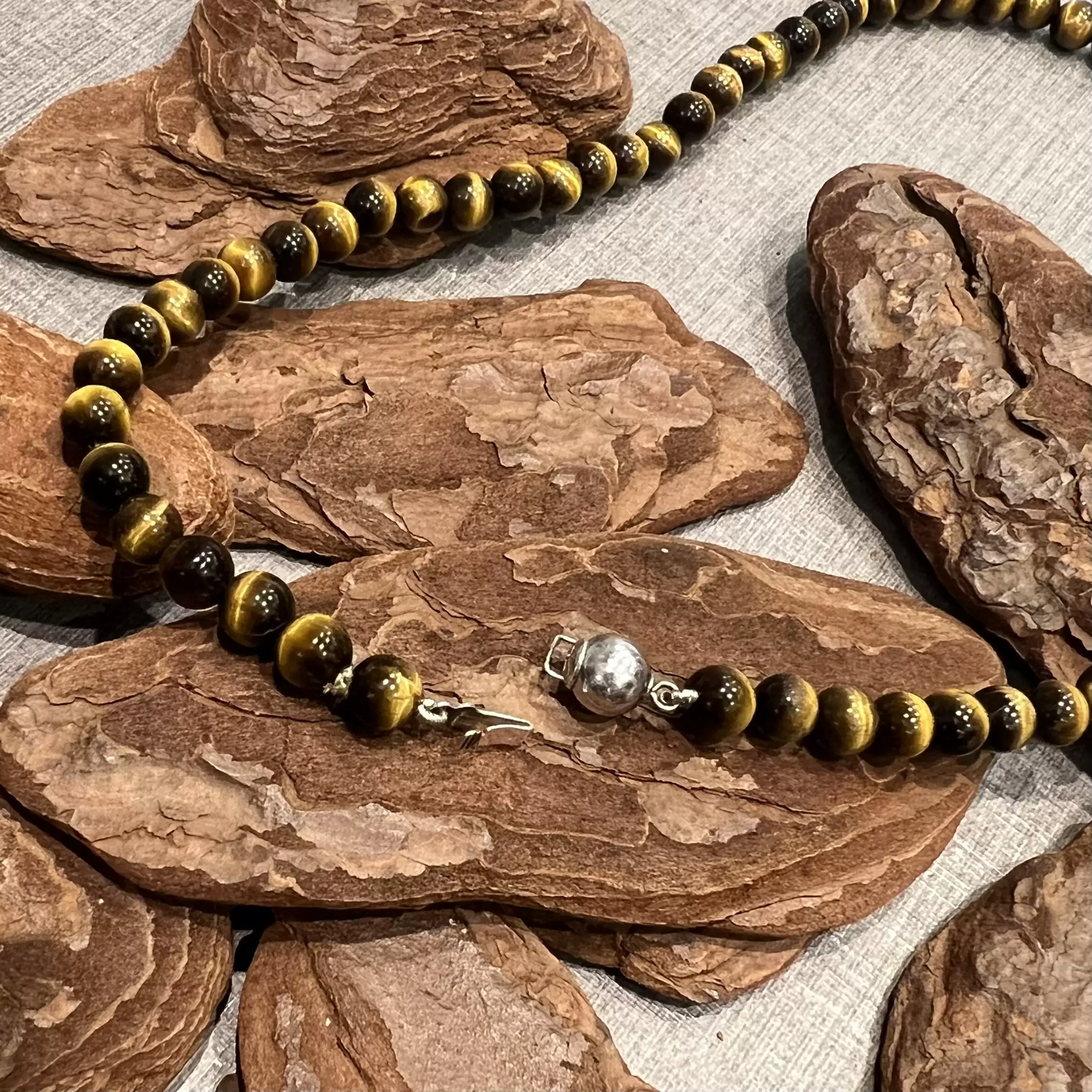 Colar com 42 cm de olho de tigre bola 5 com fecho em Prata 925.