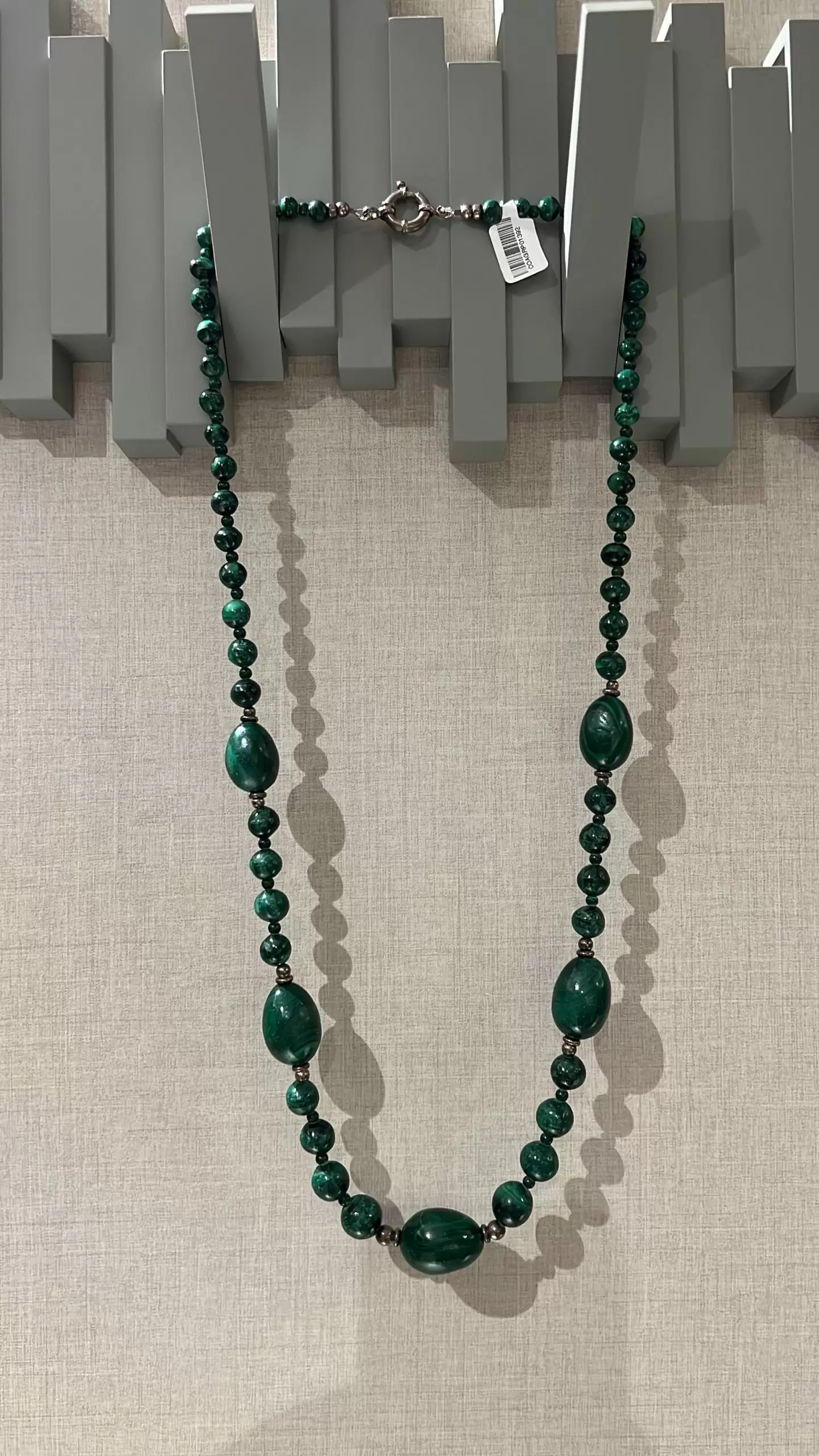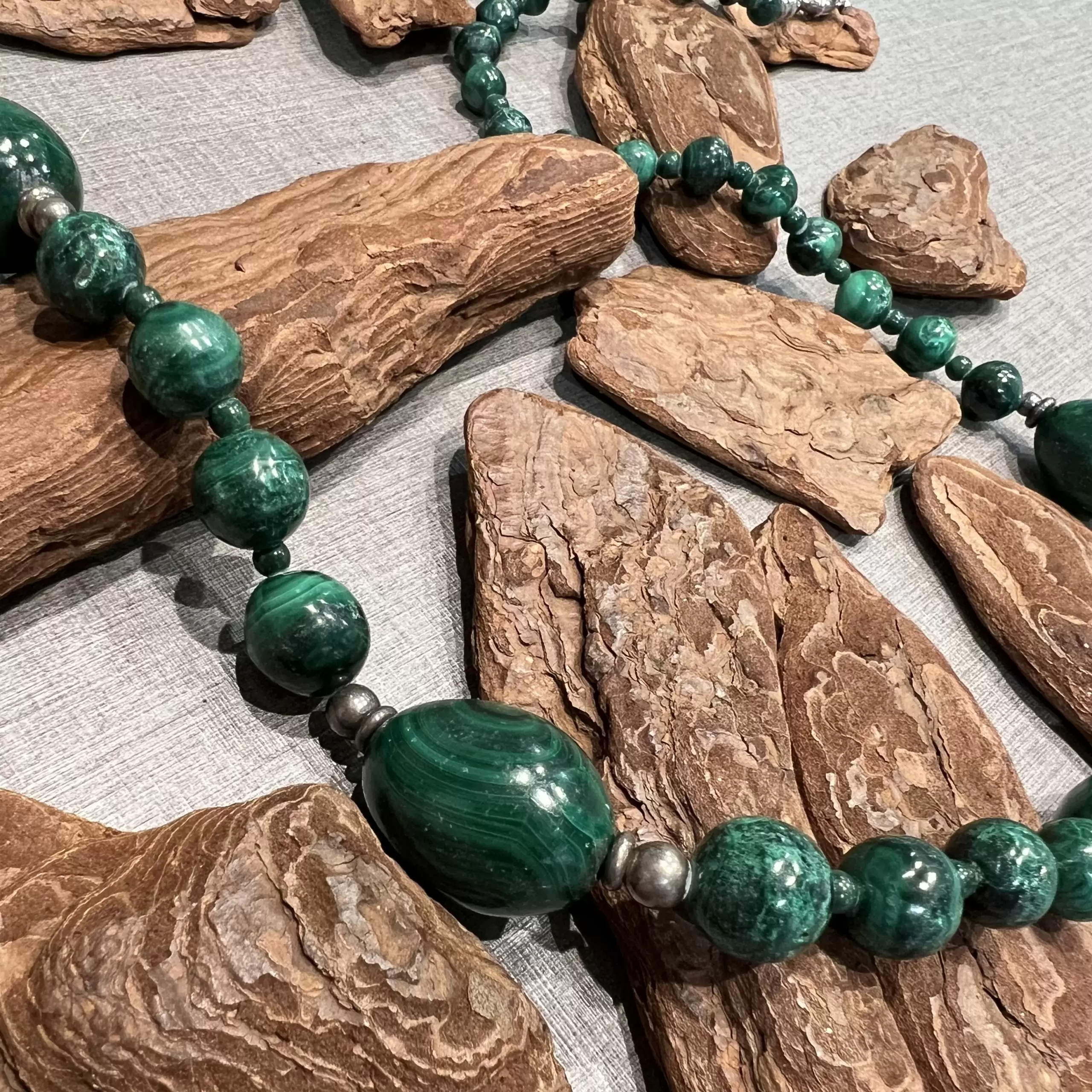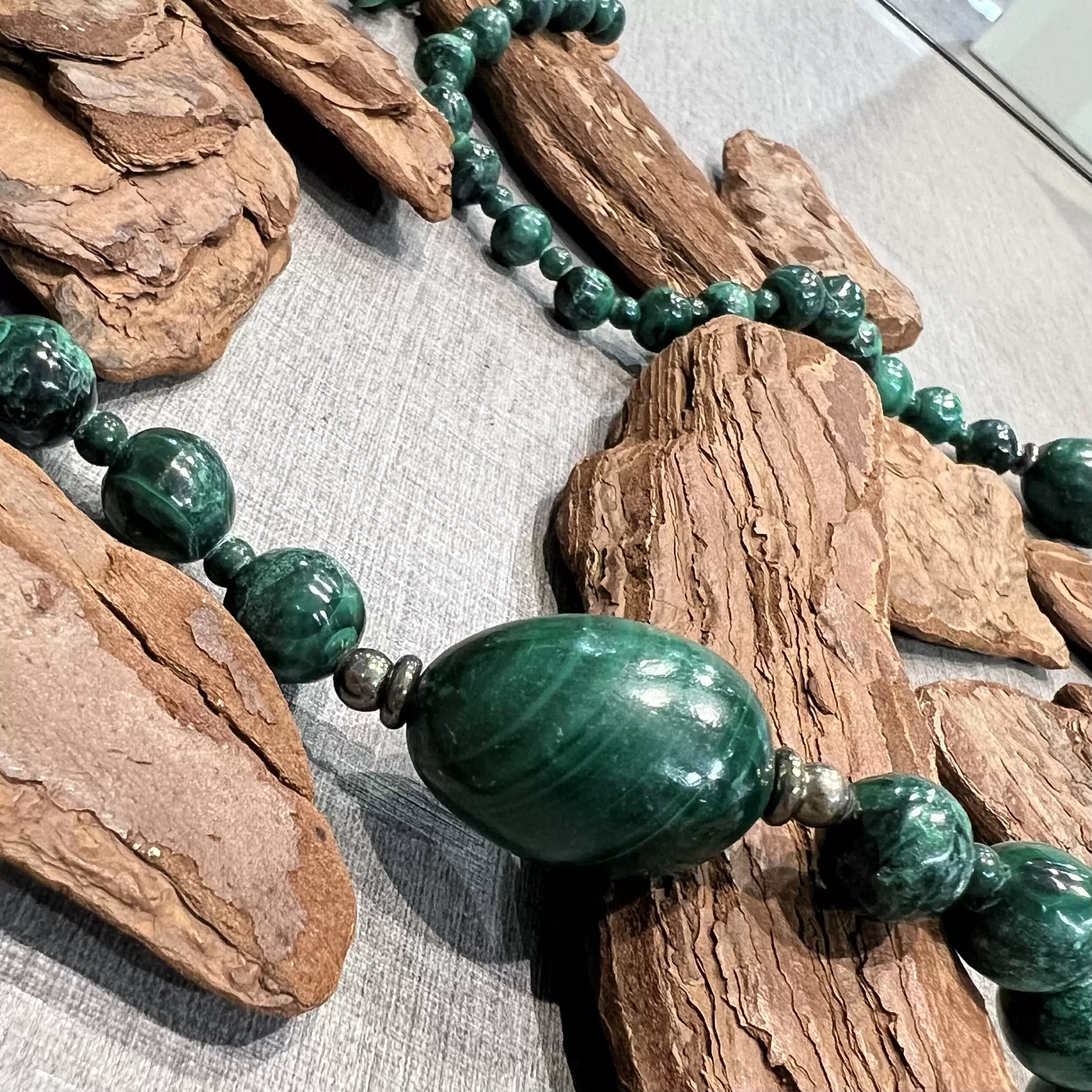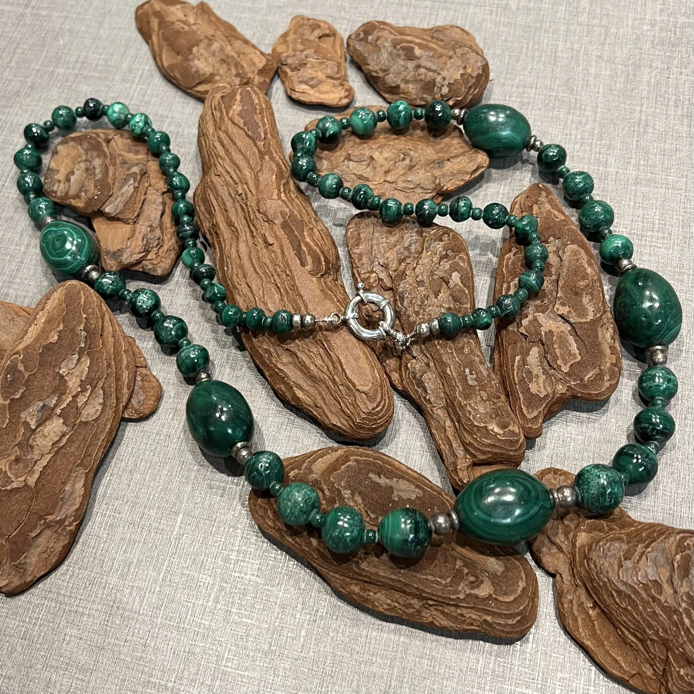 Colar Longo de Malaquita com fecho boia em Prata 925.