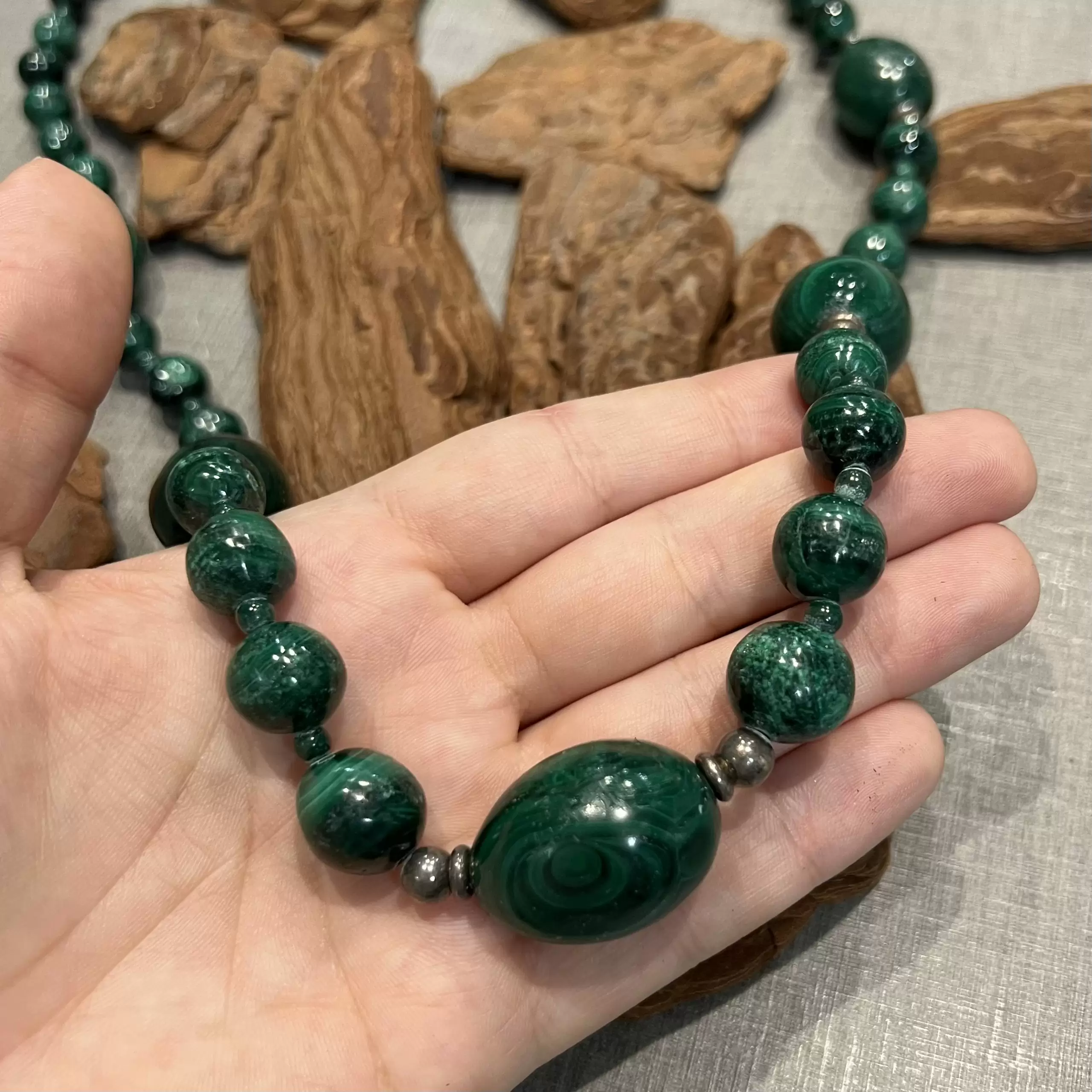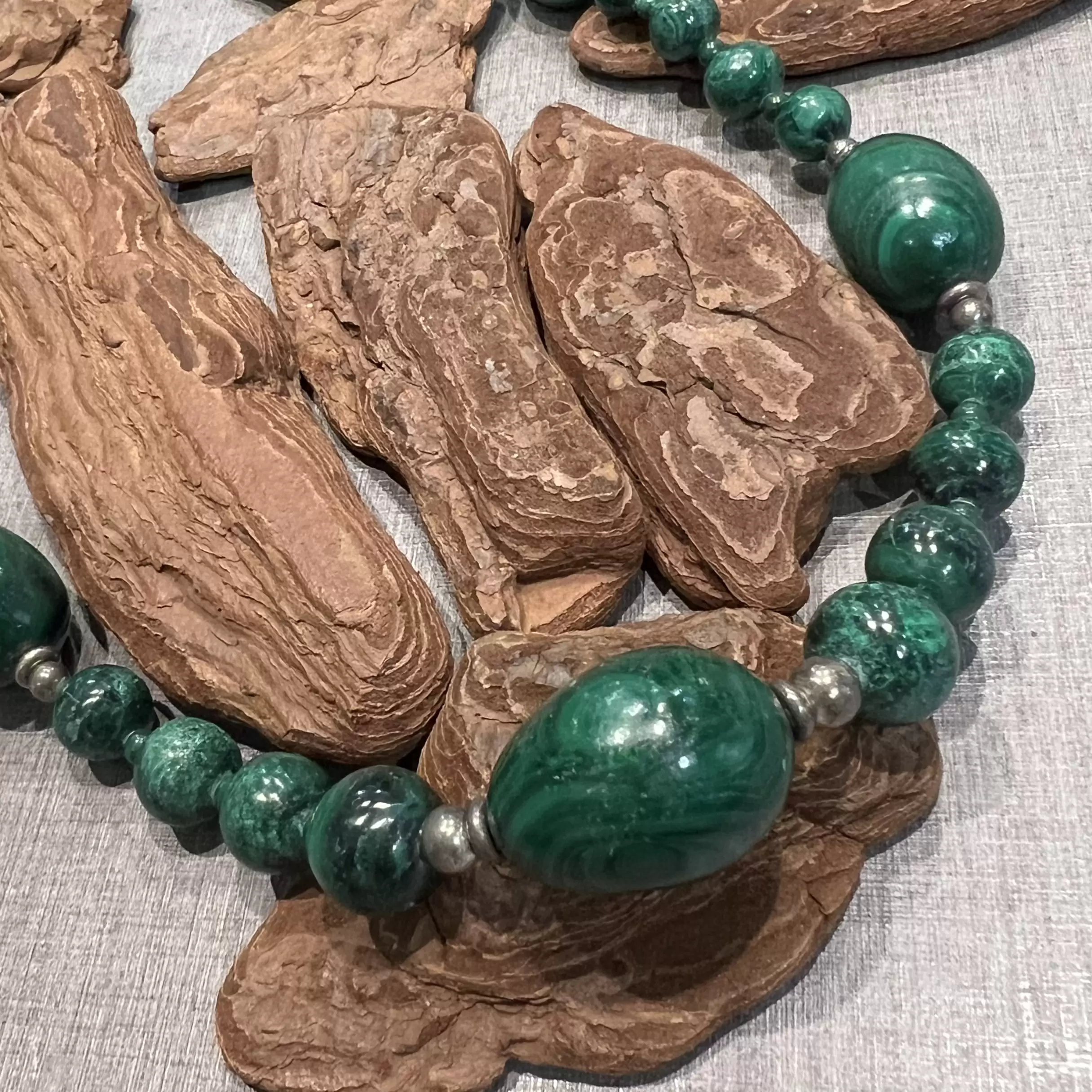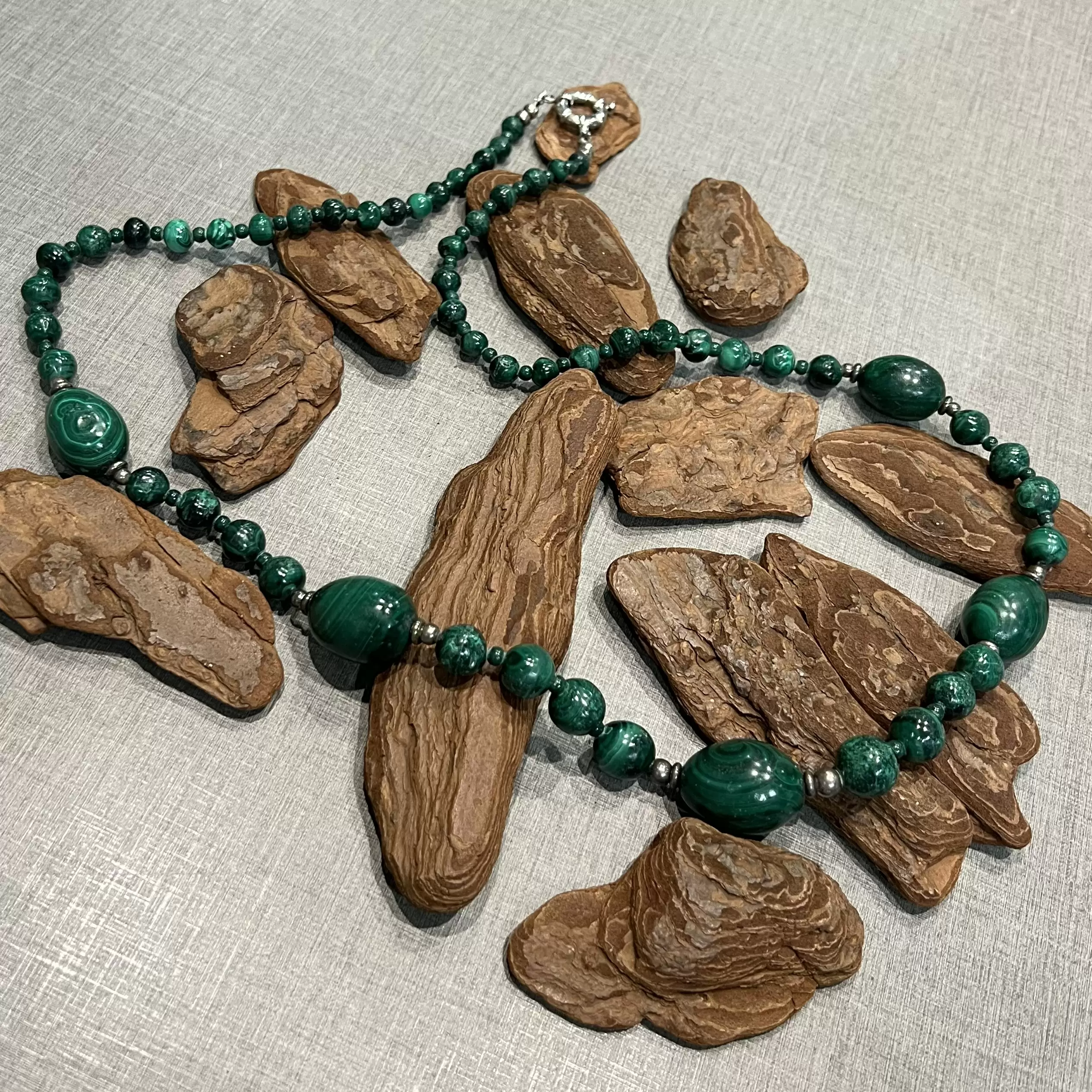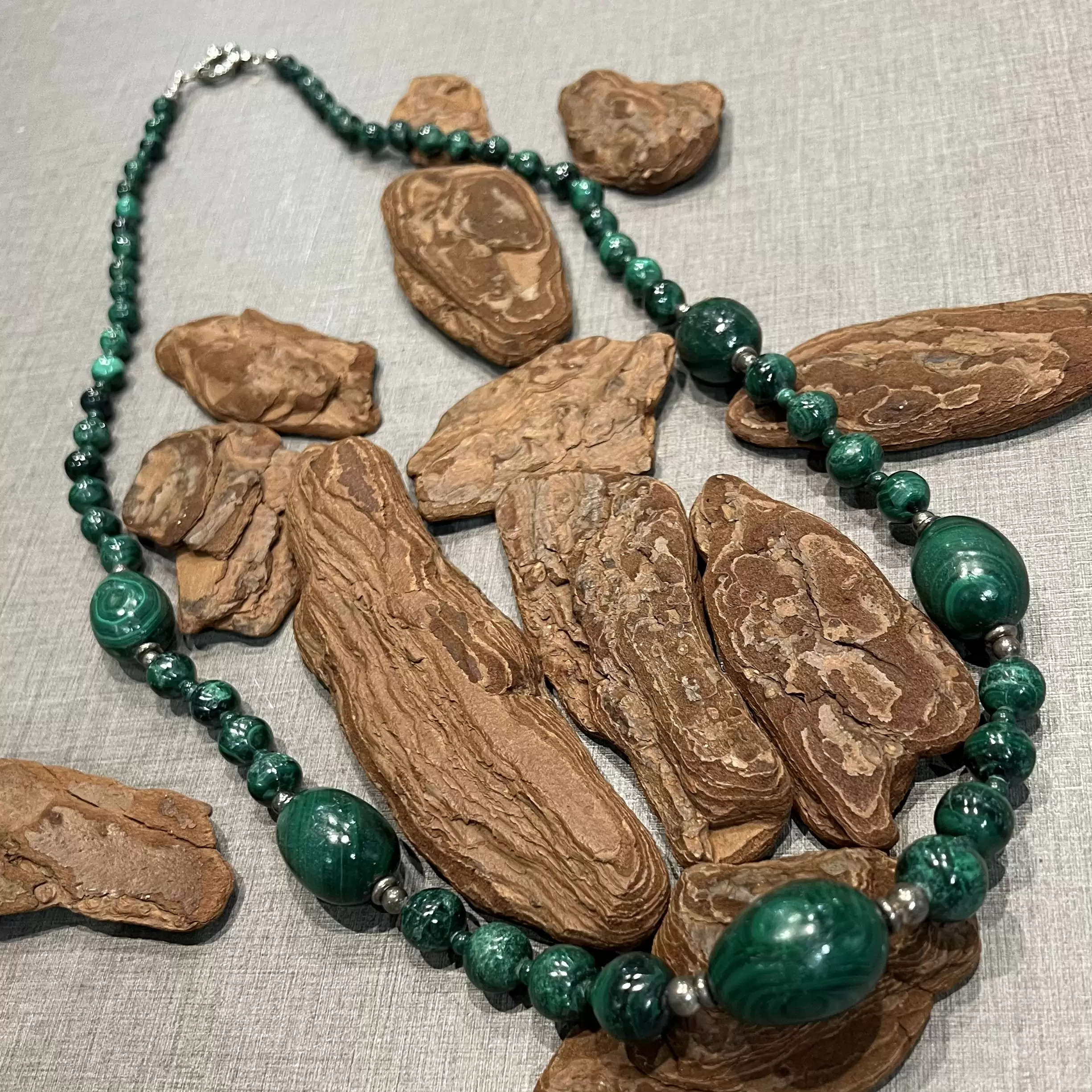Colar Longo de Malaquita com fecho boia em Prata 925.