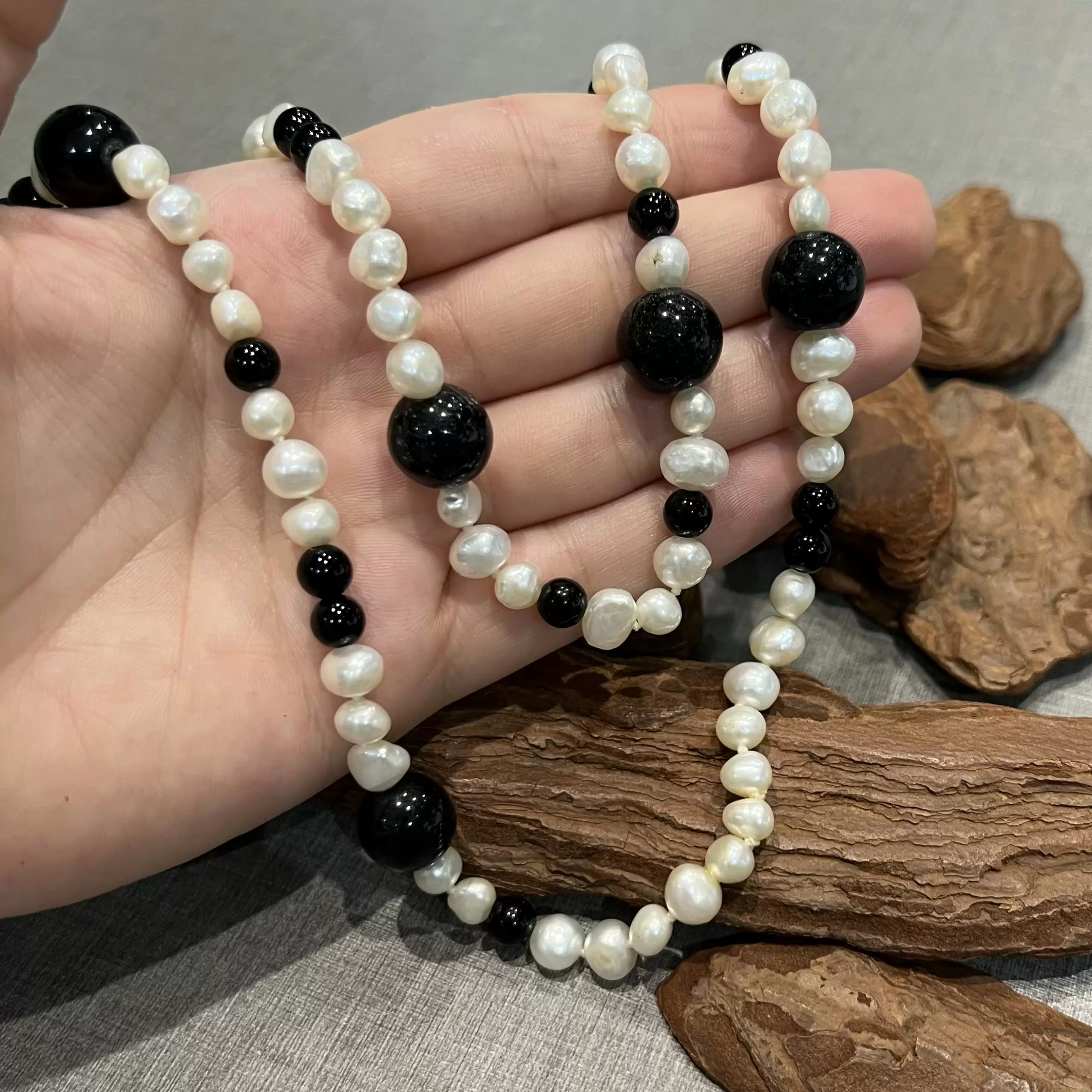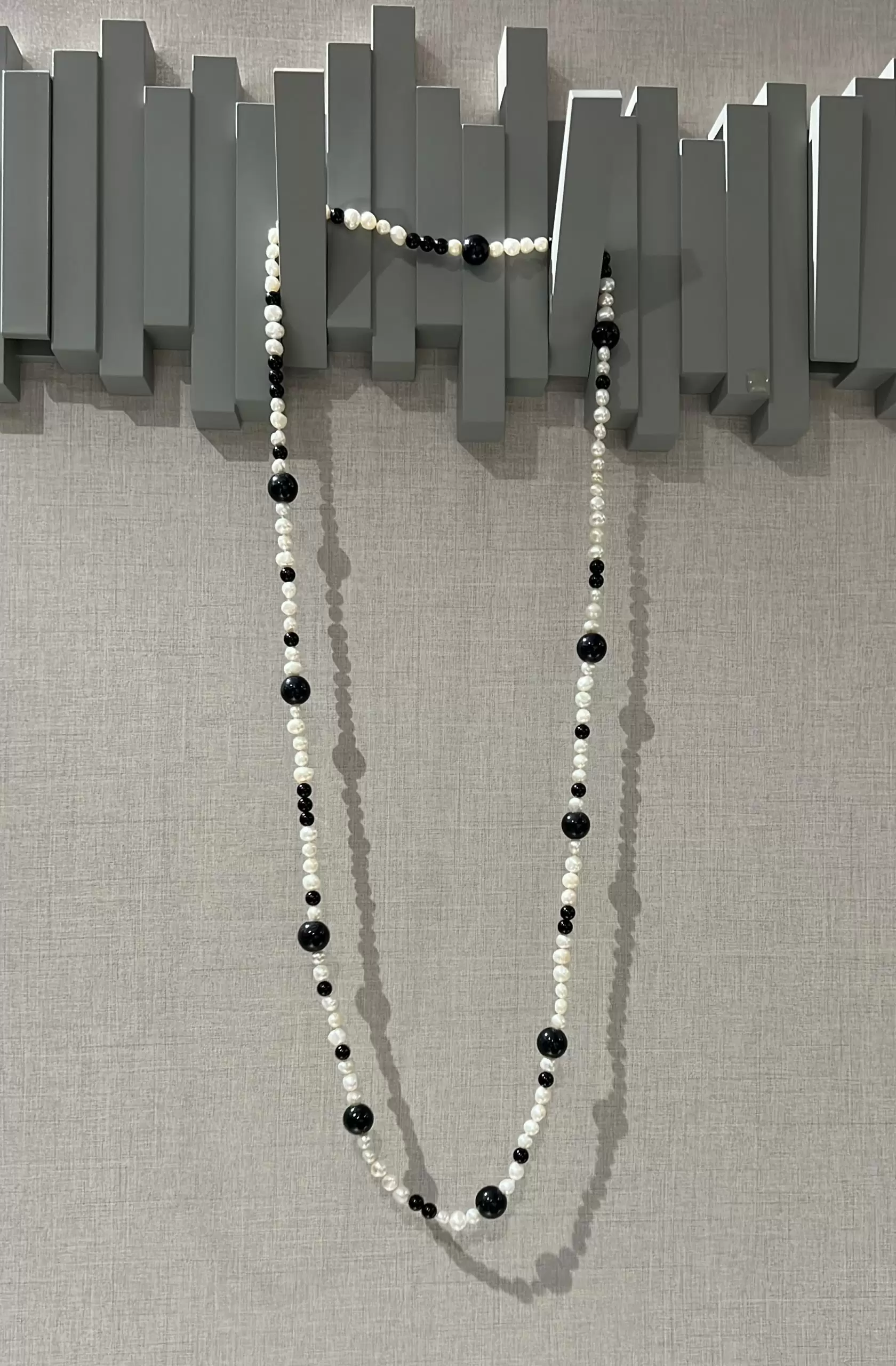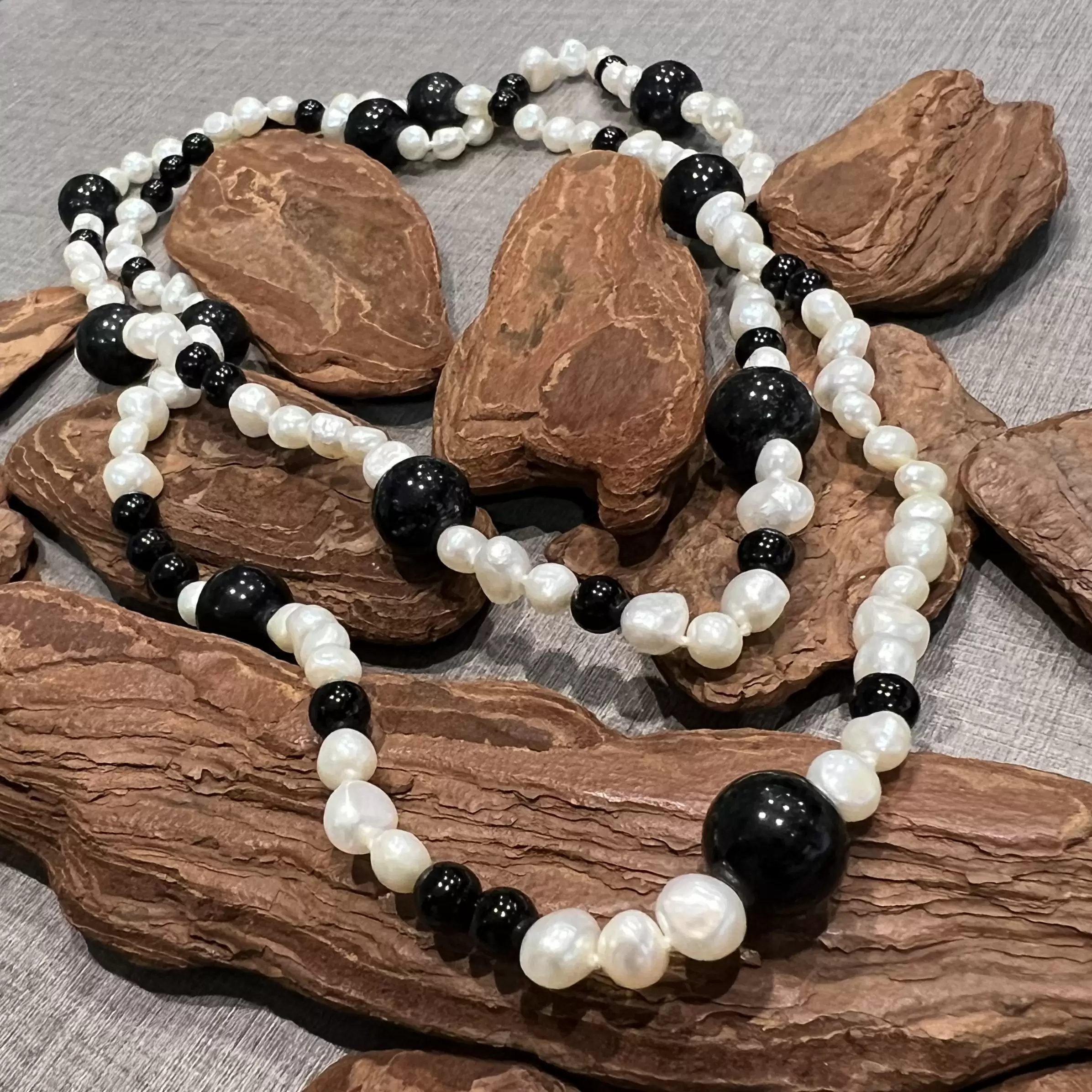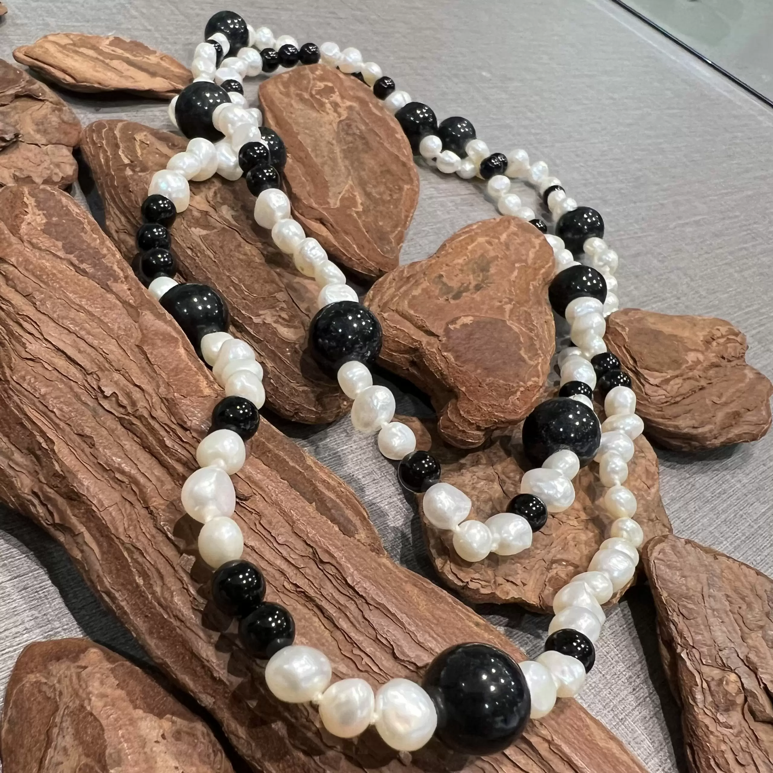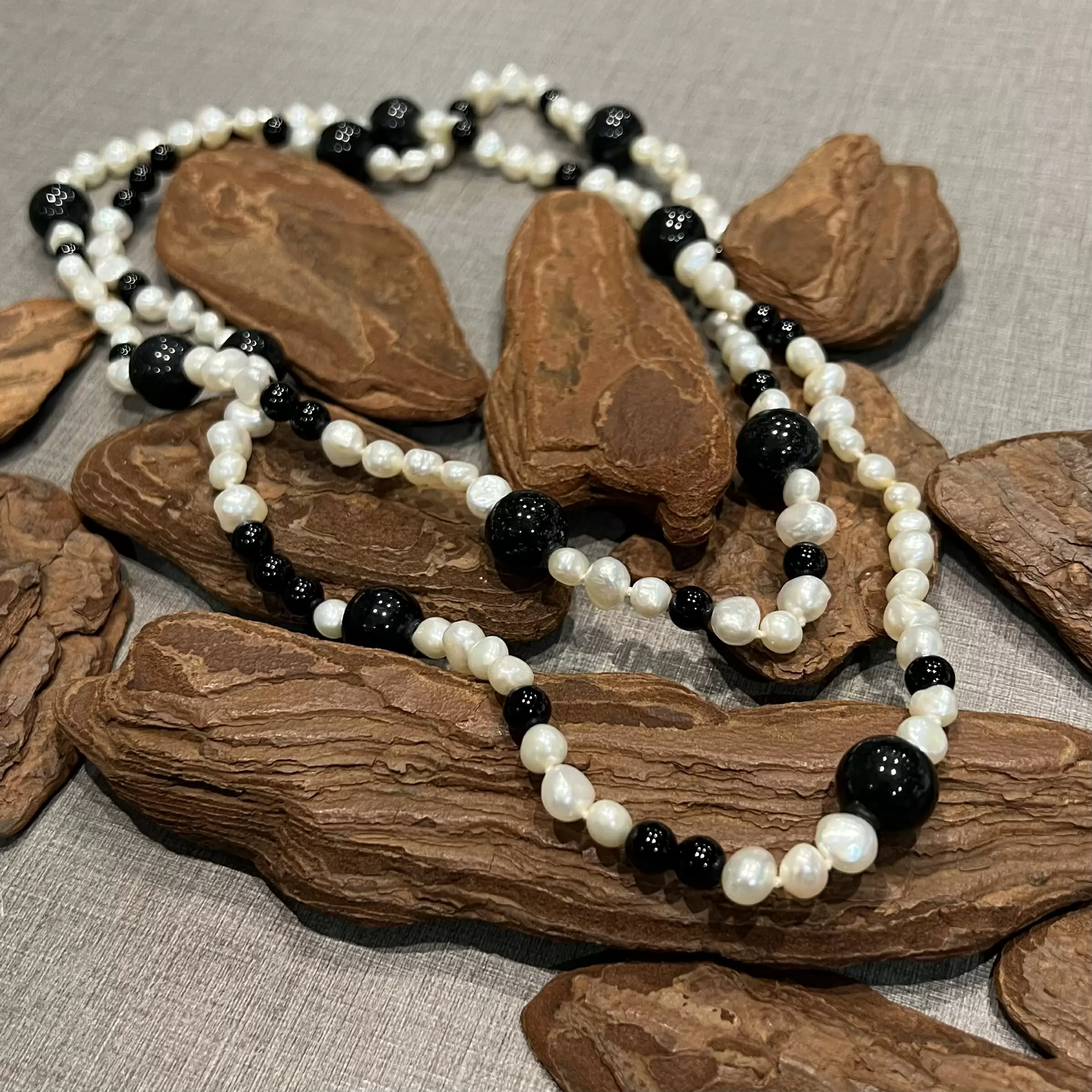Colar longo de pérolas naturais de água doce com ônix.