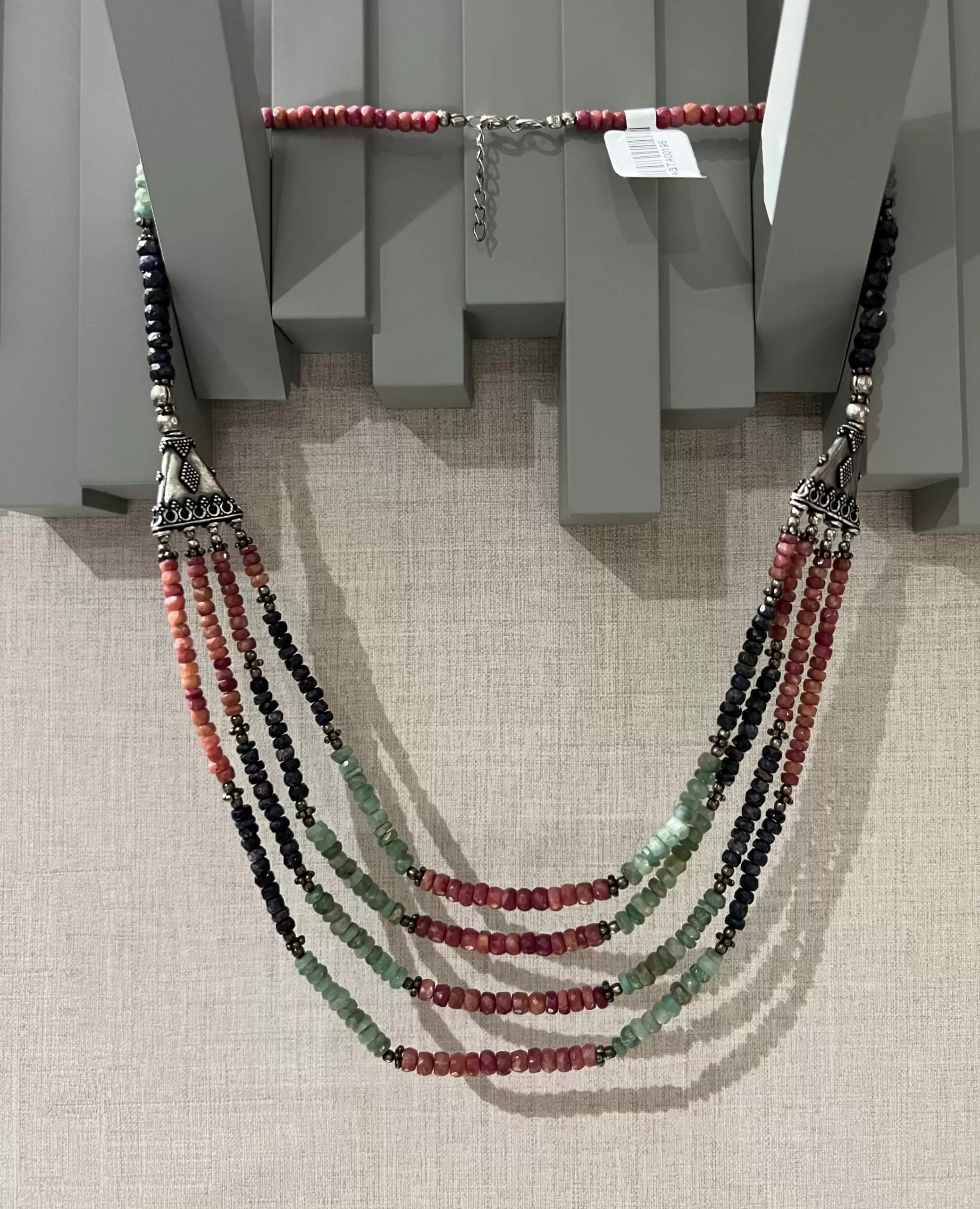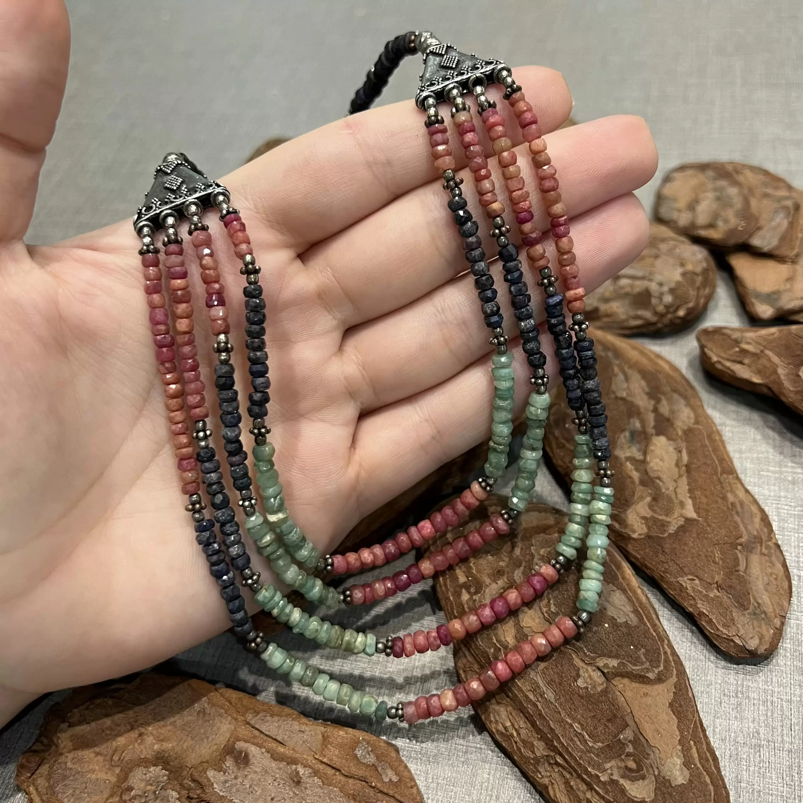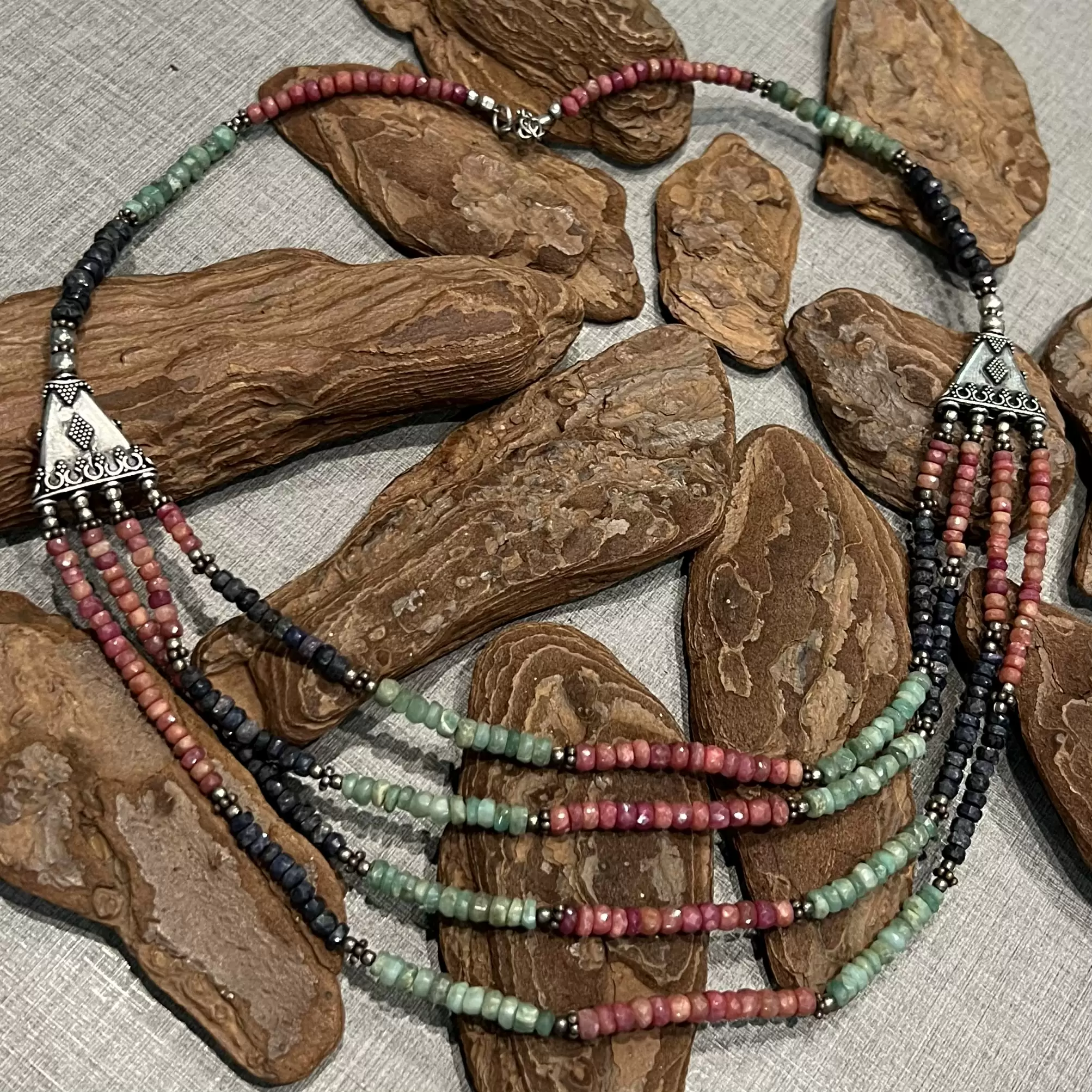 Colar de Rubi, Safira e Esmeralda Indianos em Prata 925.