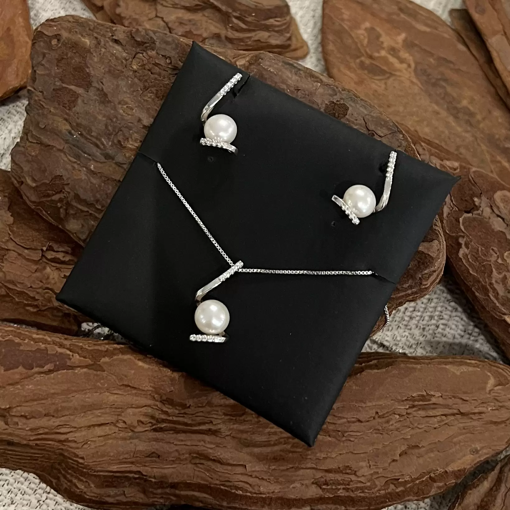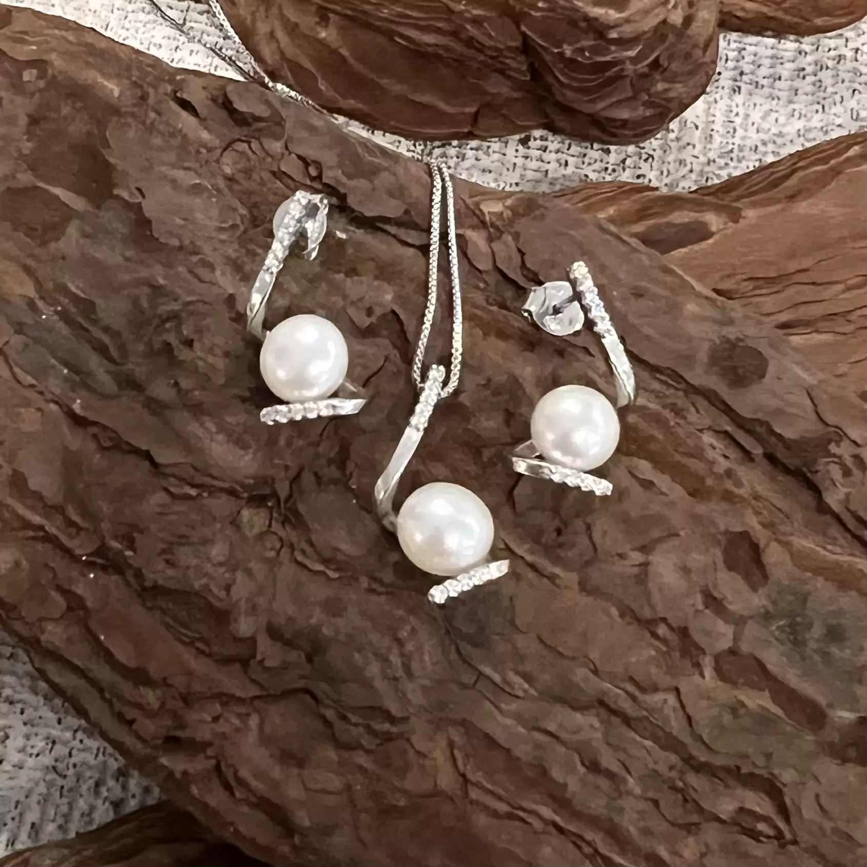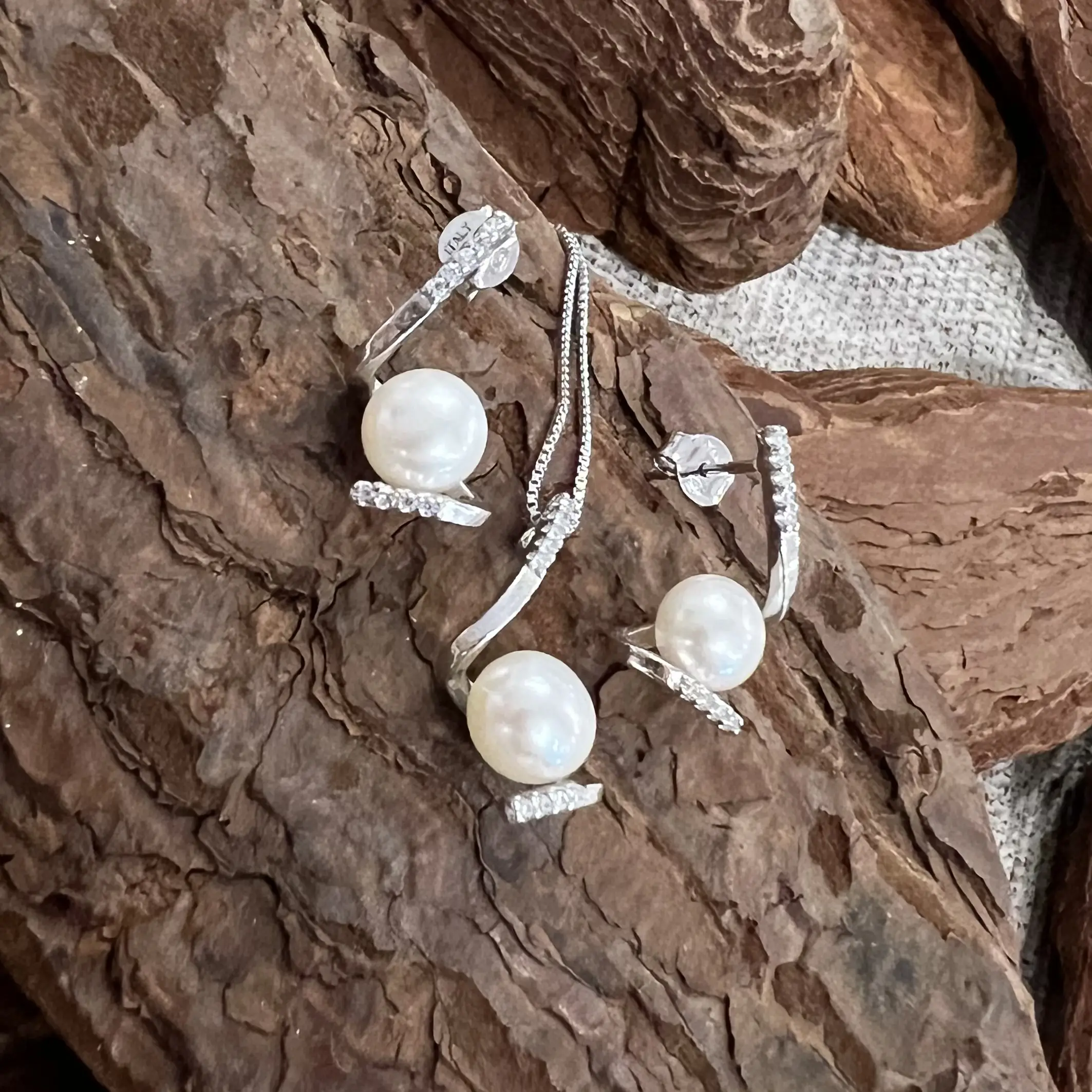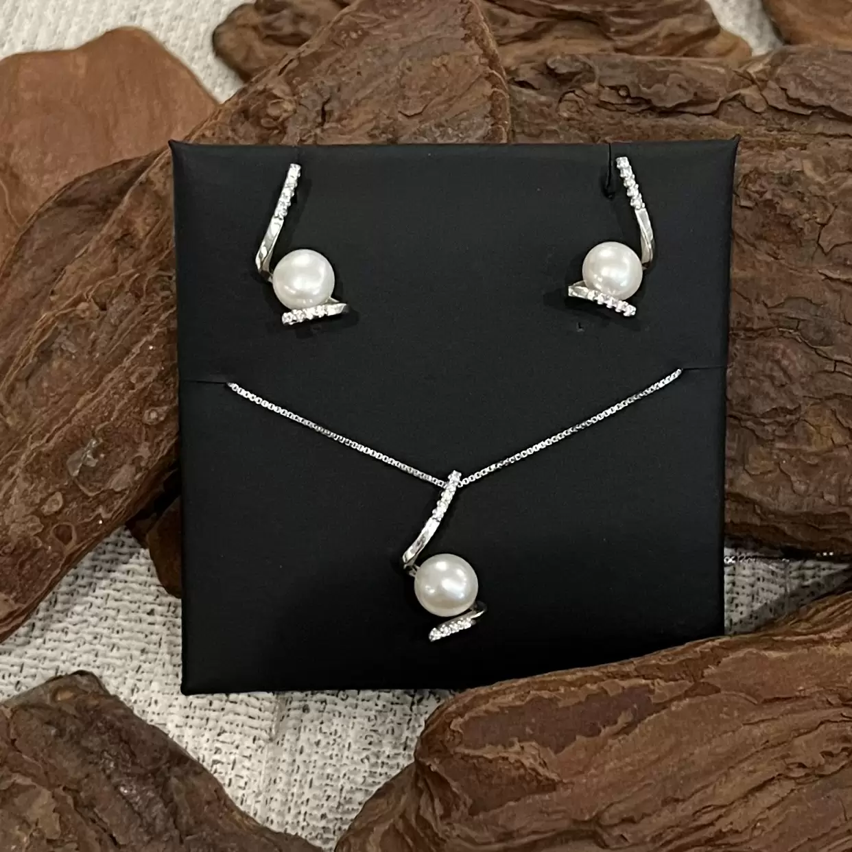 Conjunto de Pérola Natural com Zircônias em Prata 925 com banho de Ródio.