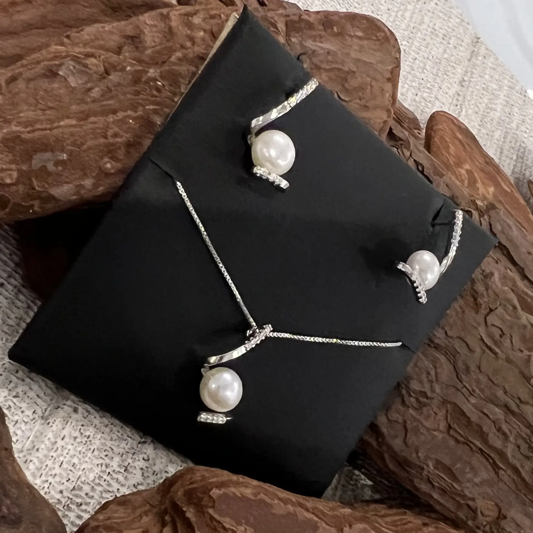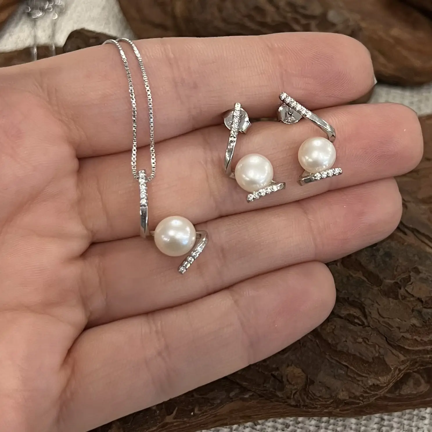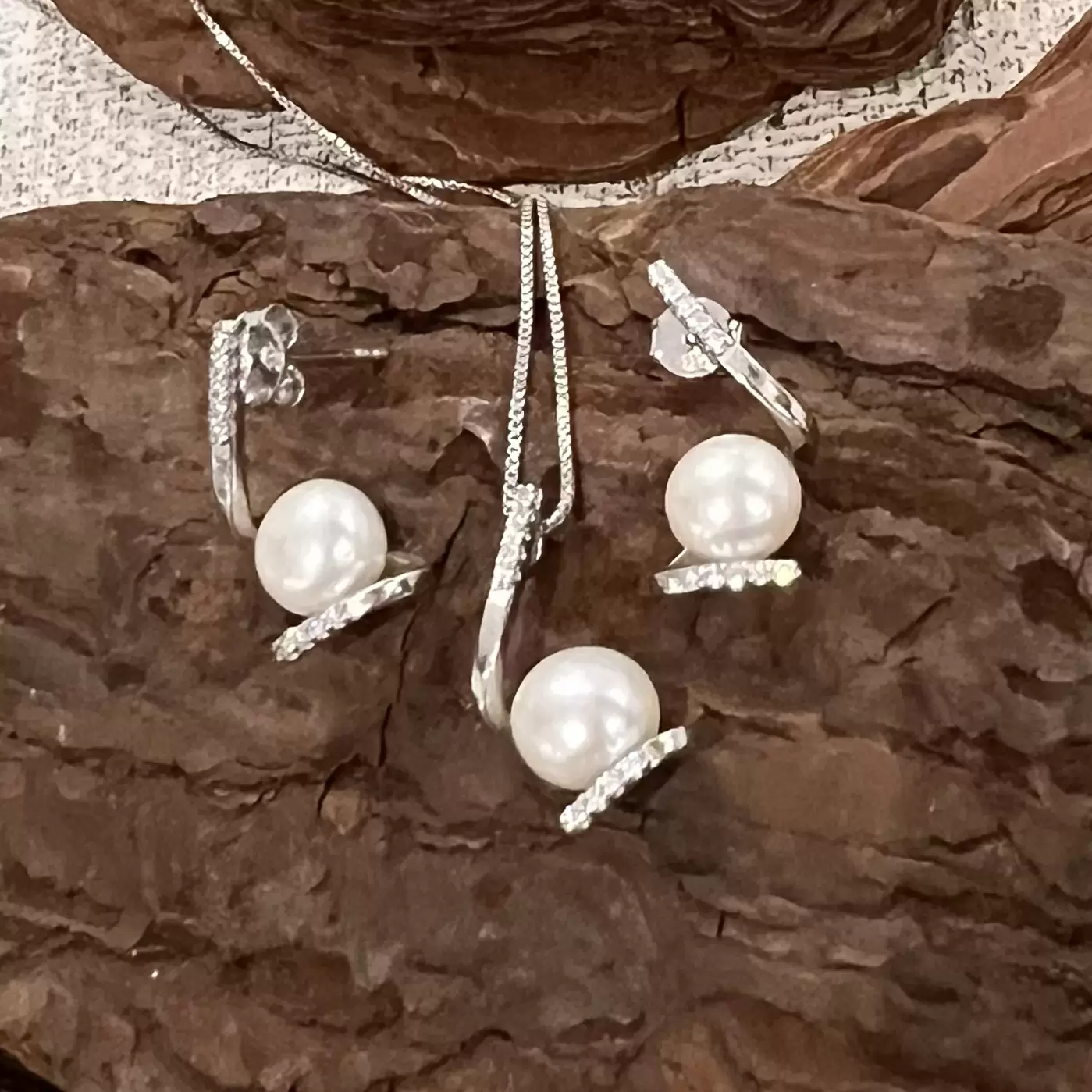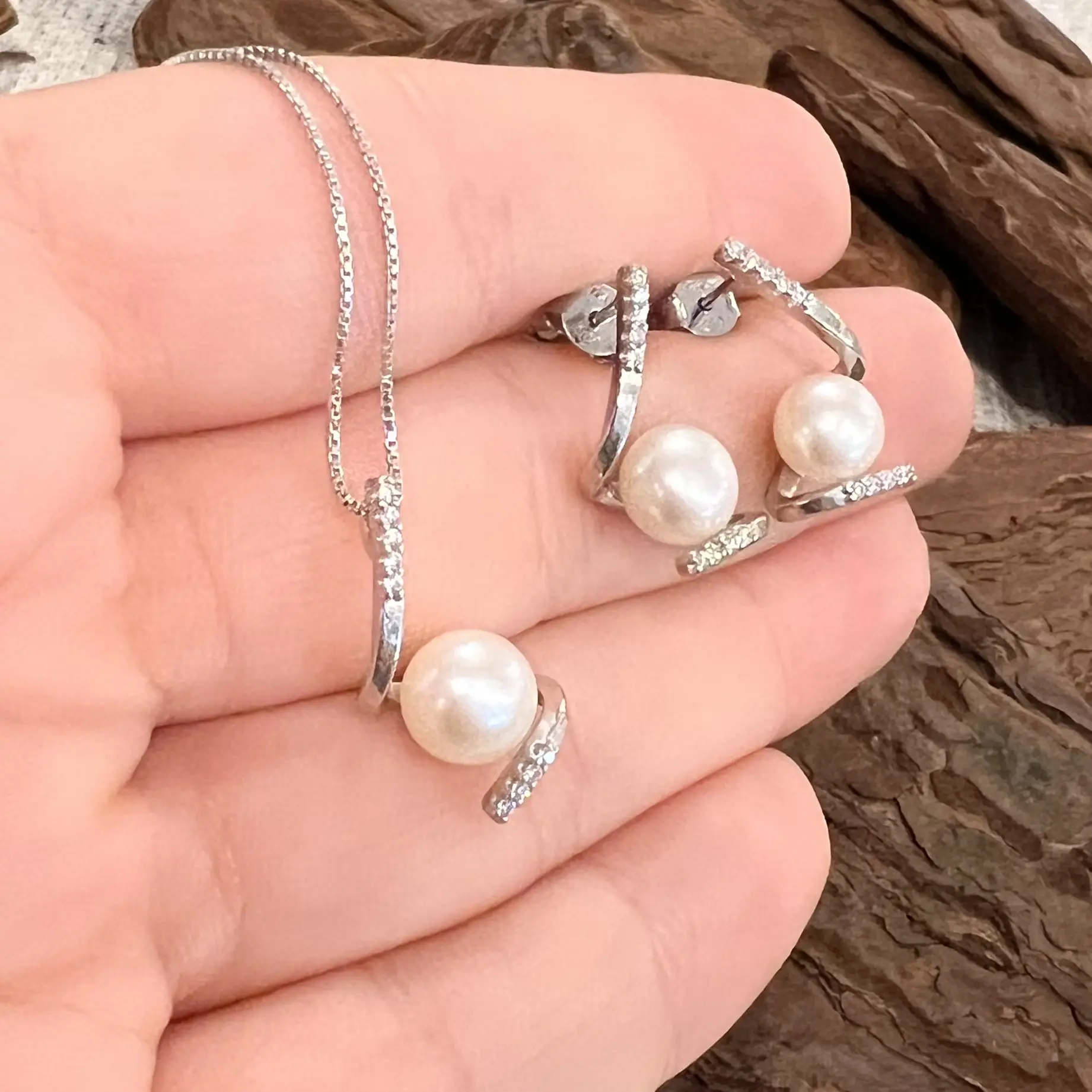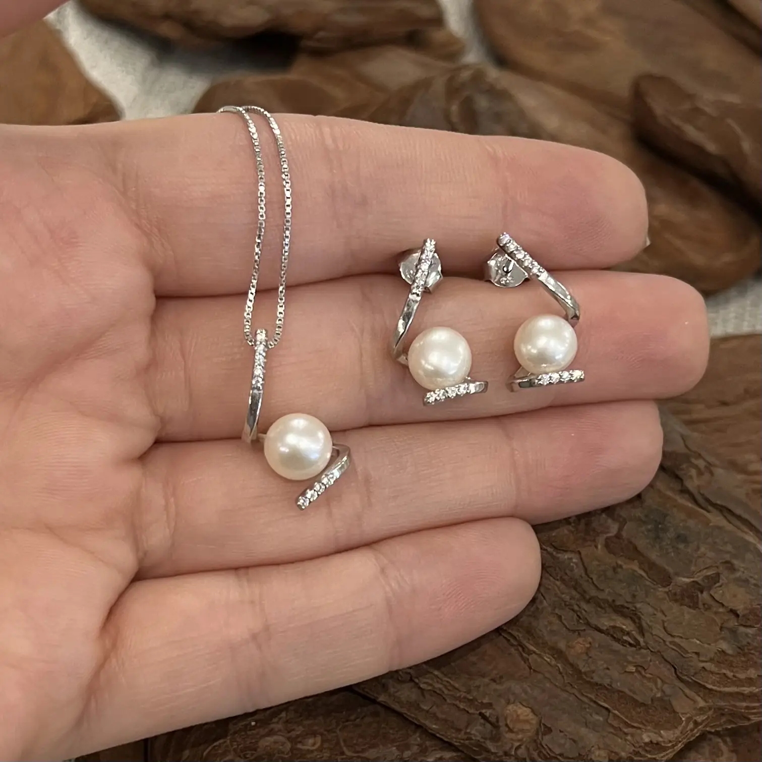 Conjunto de Pérola Natural com Zircônias em Prata 925 com banho de Ródio.
