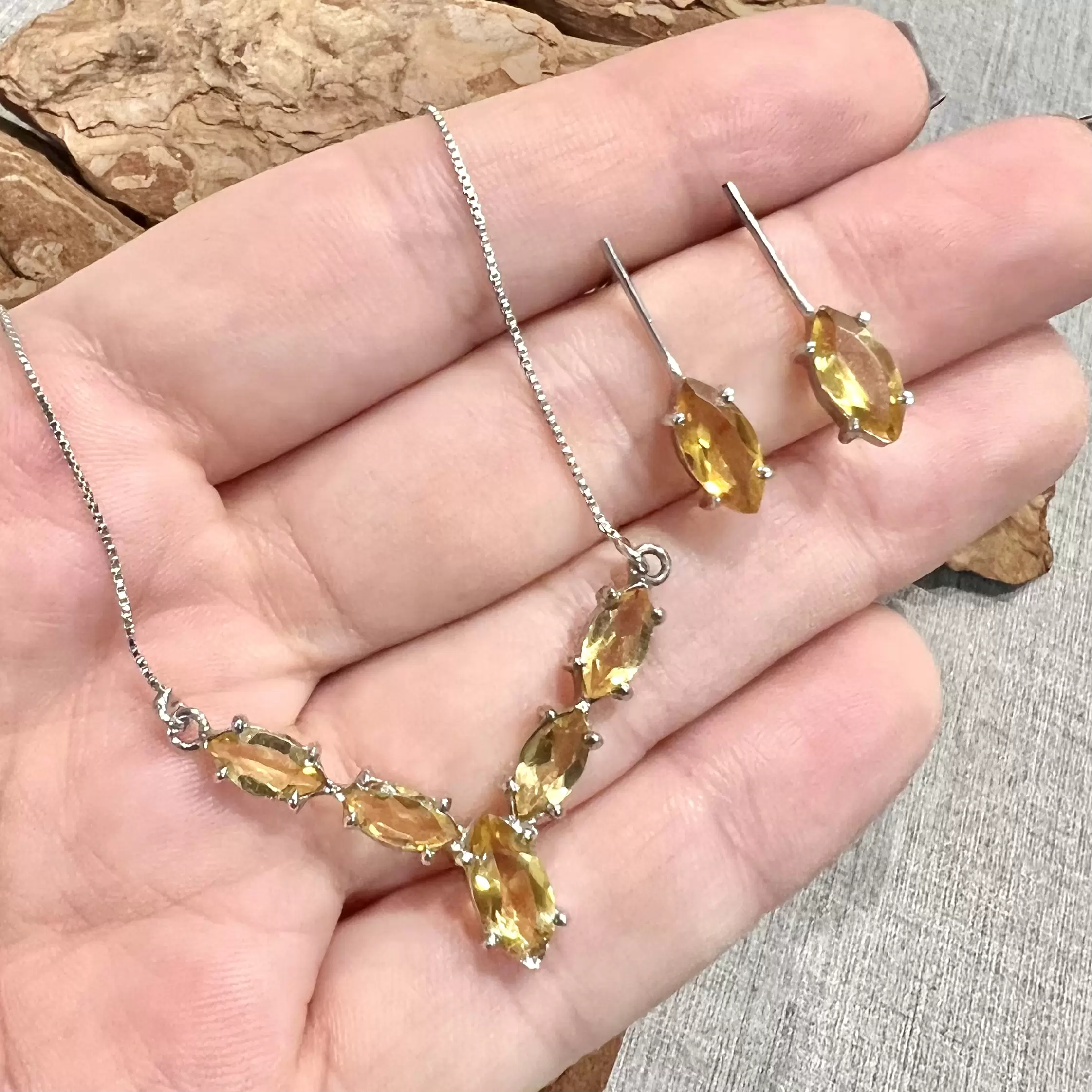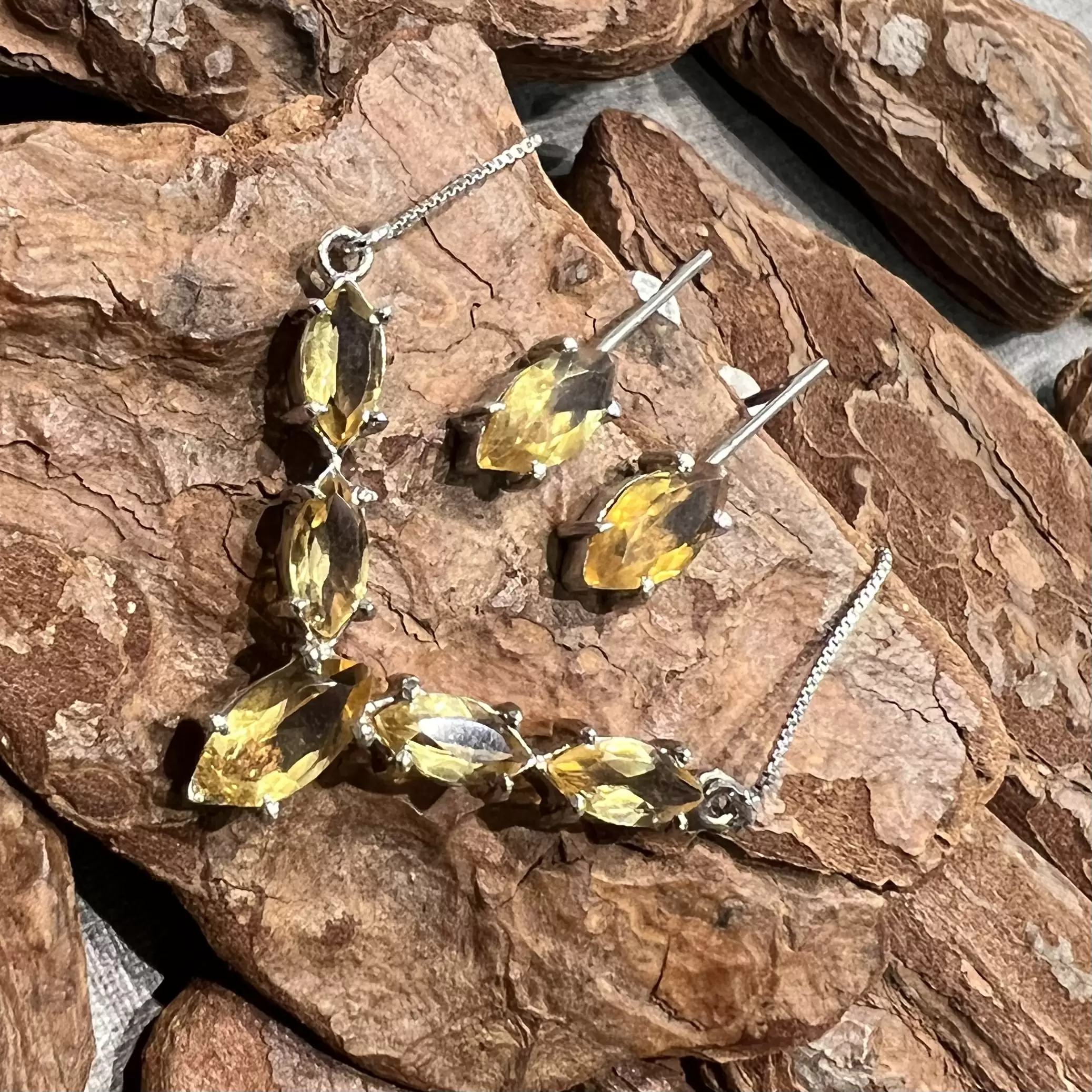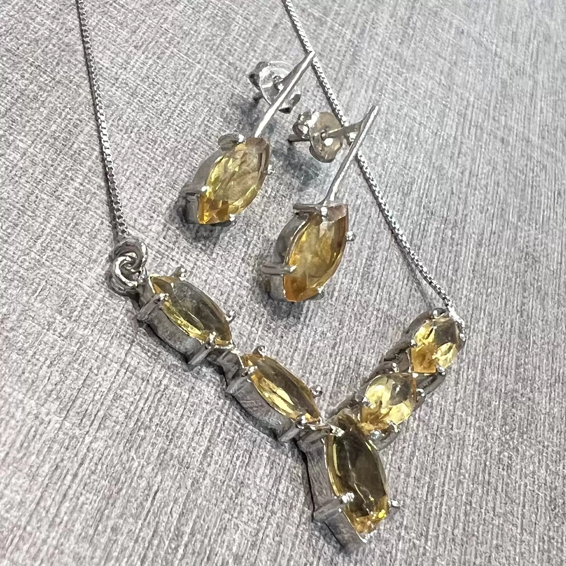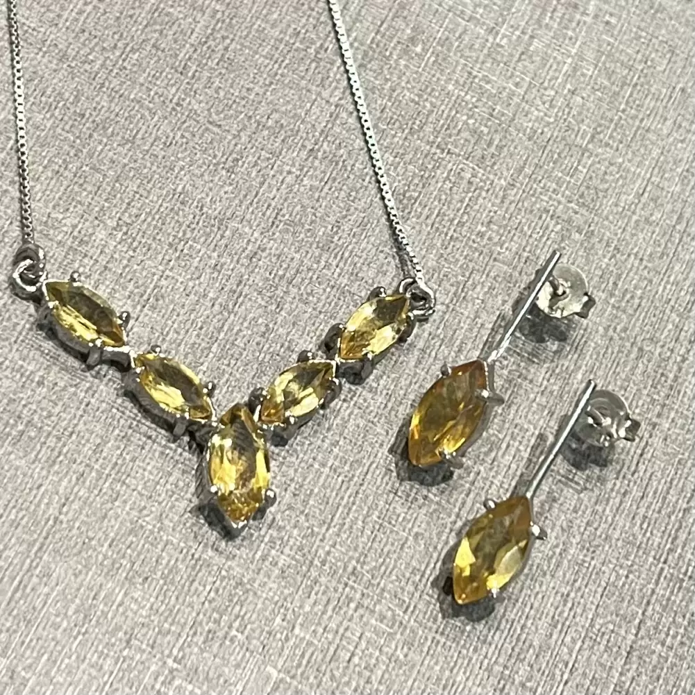 Conjunto Navete de Citrino feito em Prata 925 com banho de ródio.
