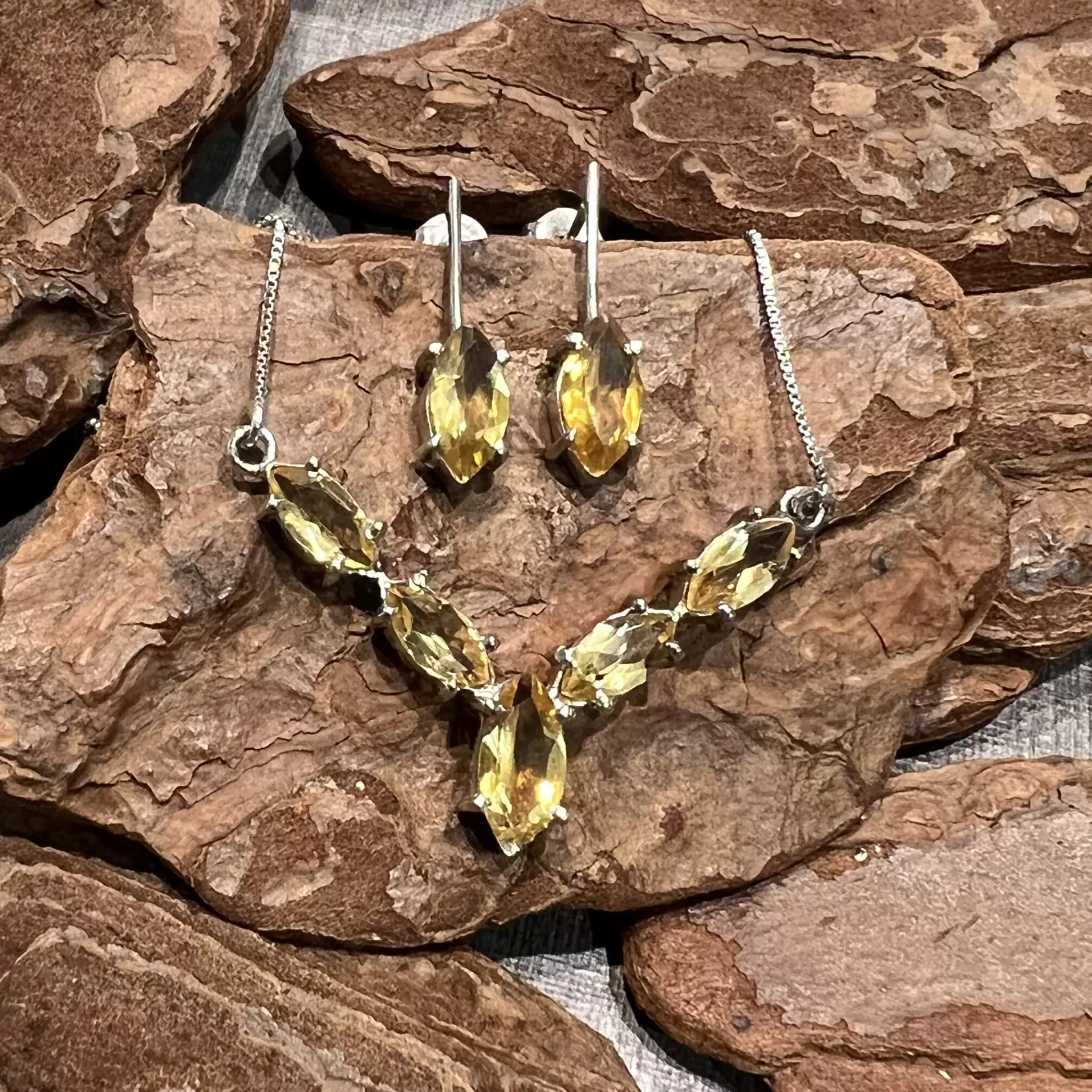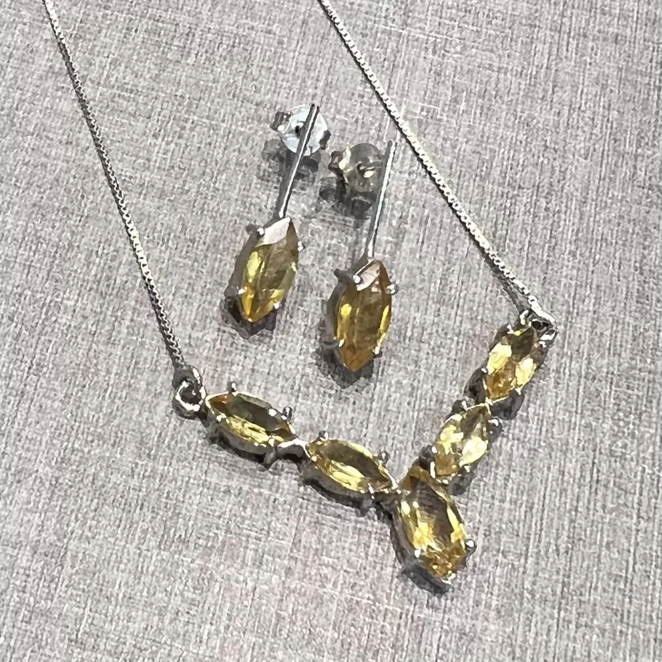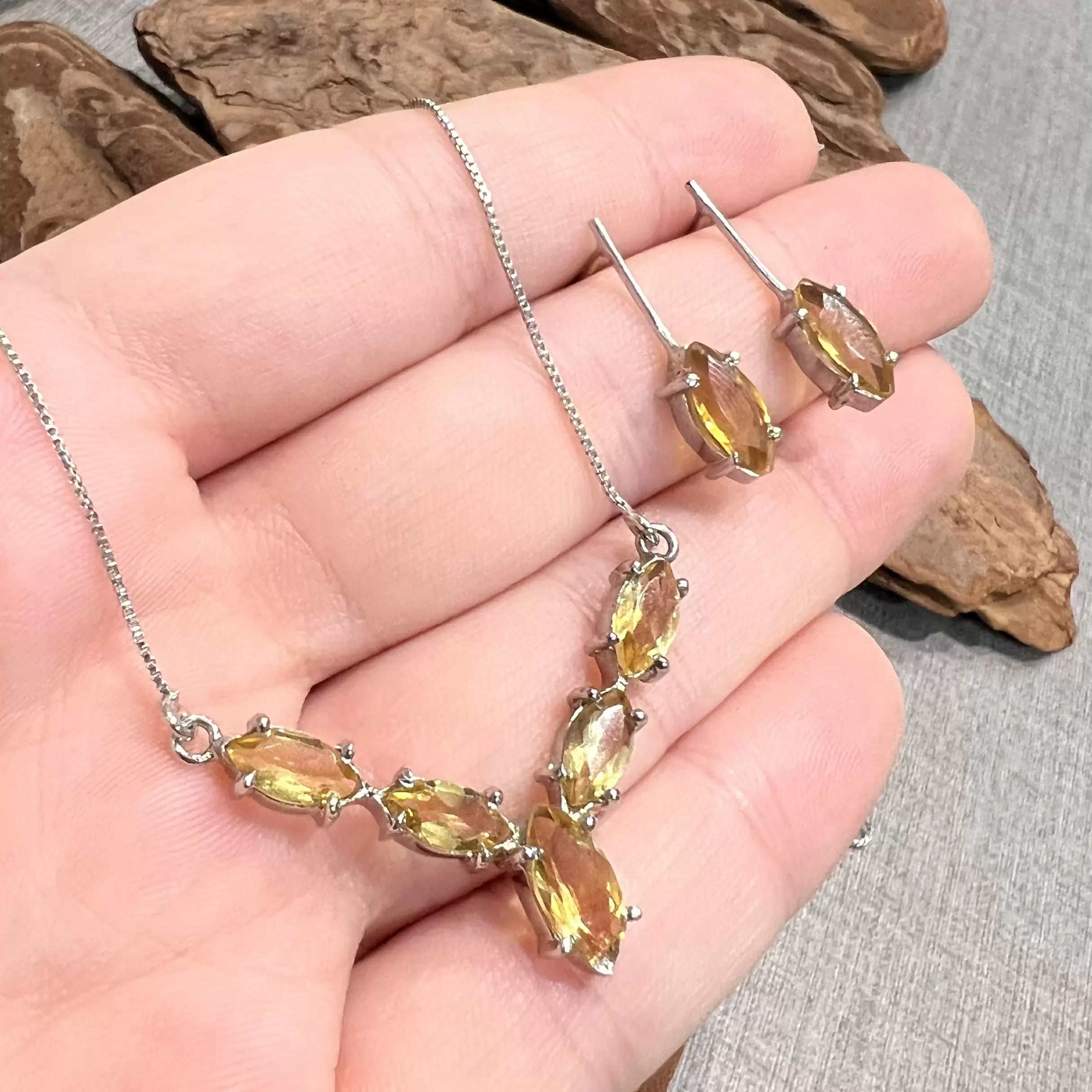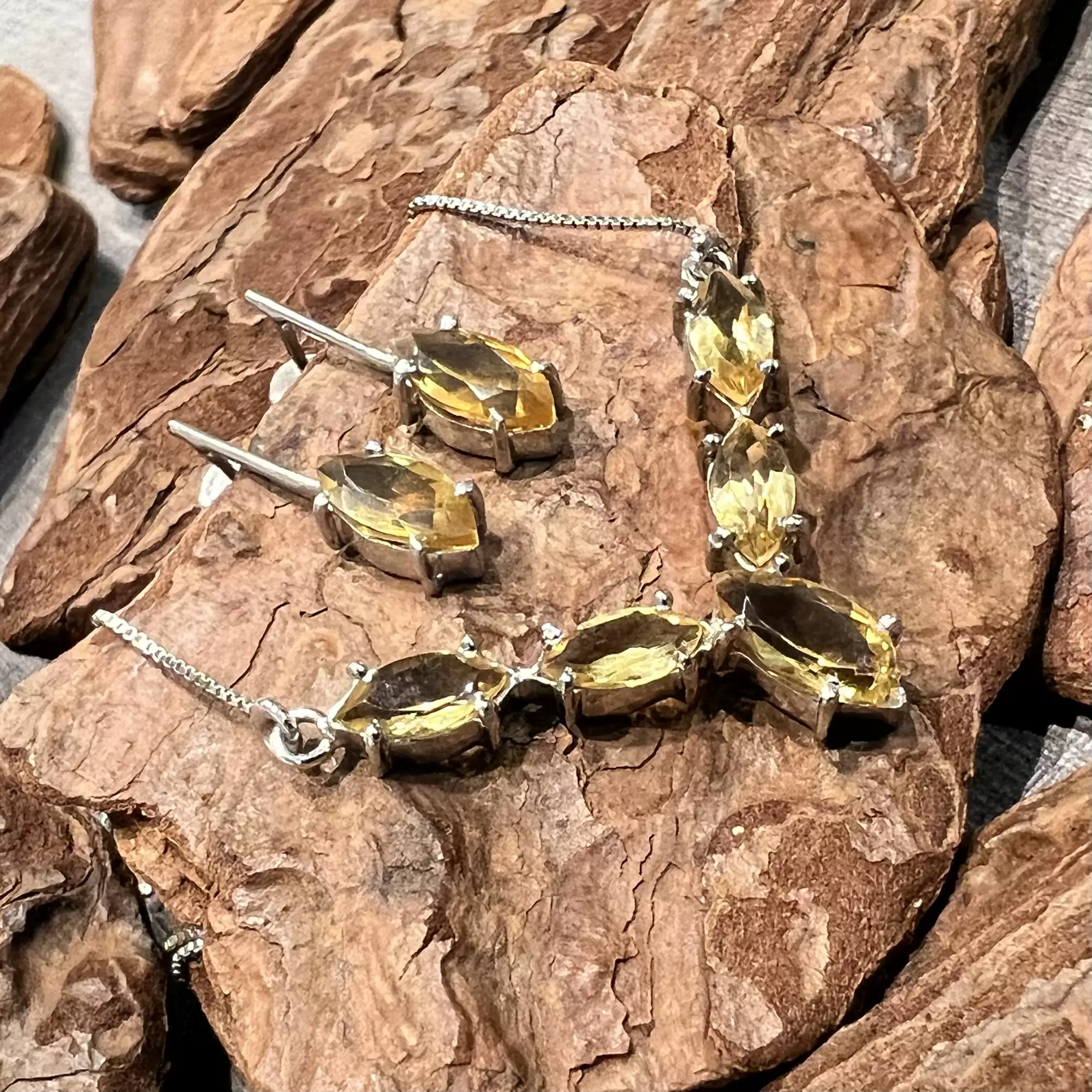 Conjunto Navete de Citrino feito em Prata 925 com banho de ródio.