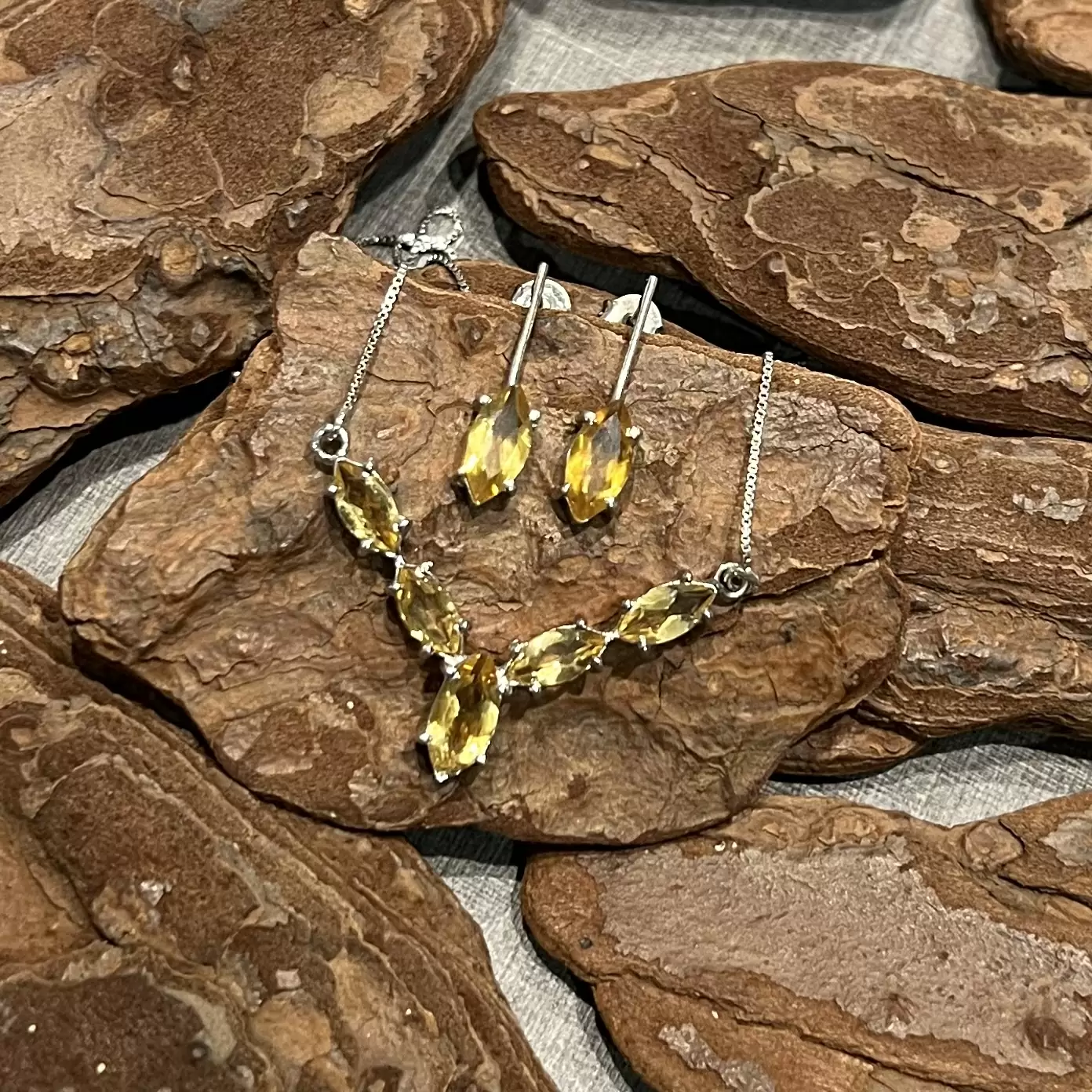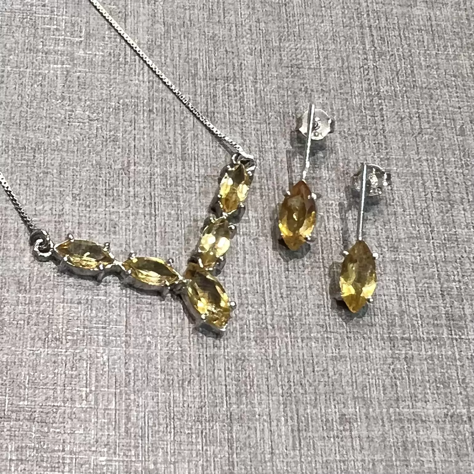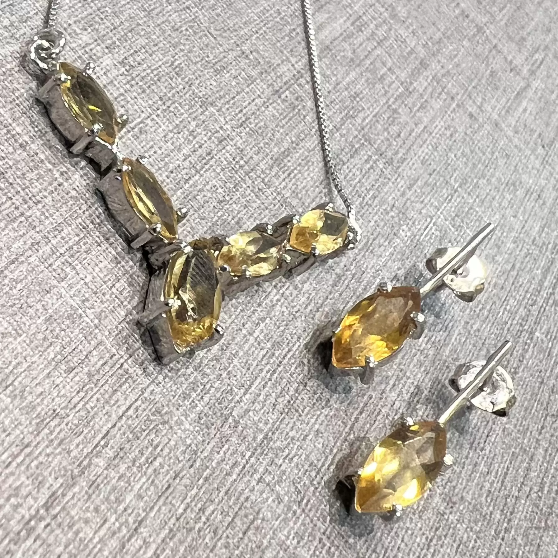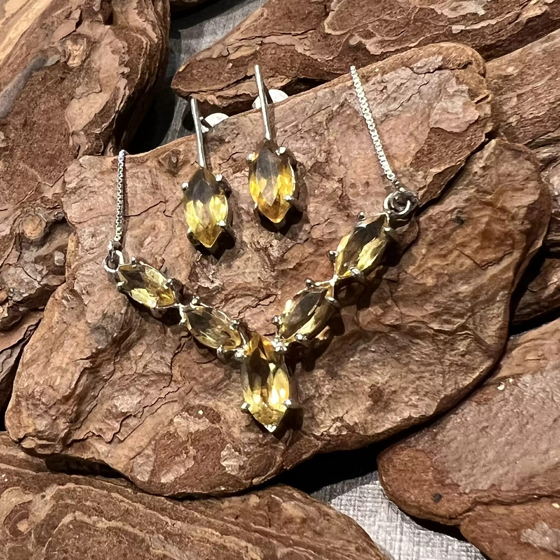 Conjunto Navete de Citrino feito em Prata 925 com banho de ródio.