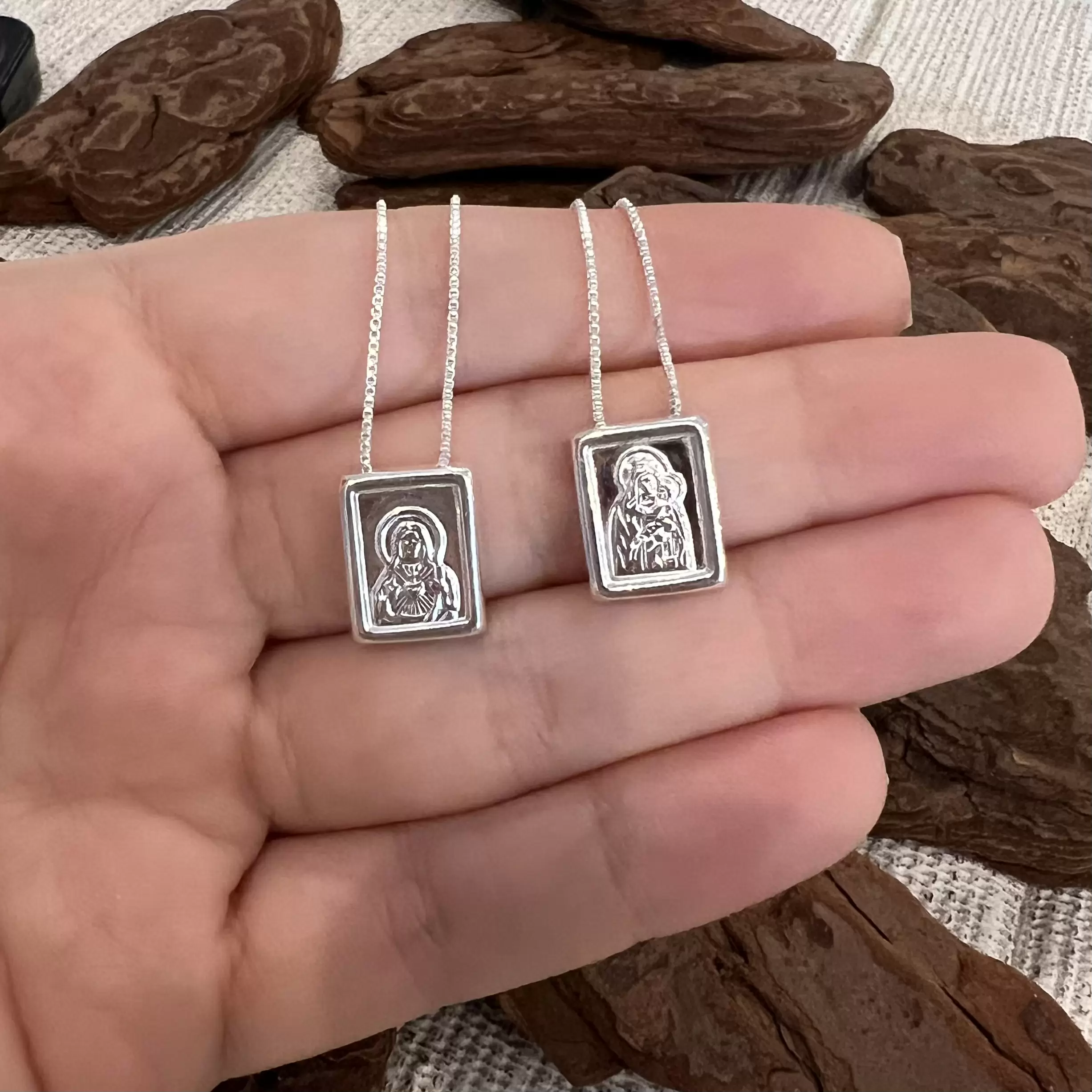 Escapulário de Caixinha Tradicional Liso M com imagem de Nossa Senhora do Carmo e Sagrado Coração de Jesus em Prata 925.