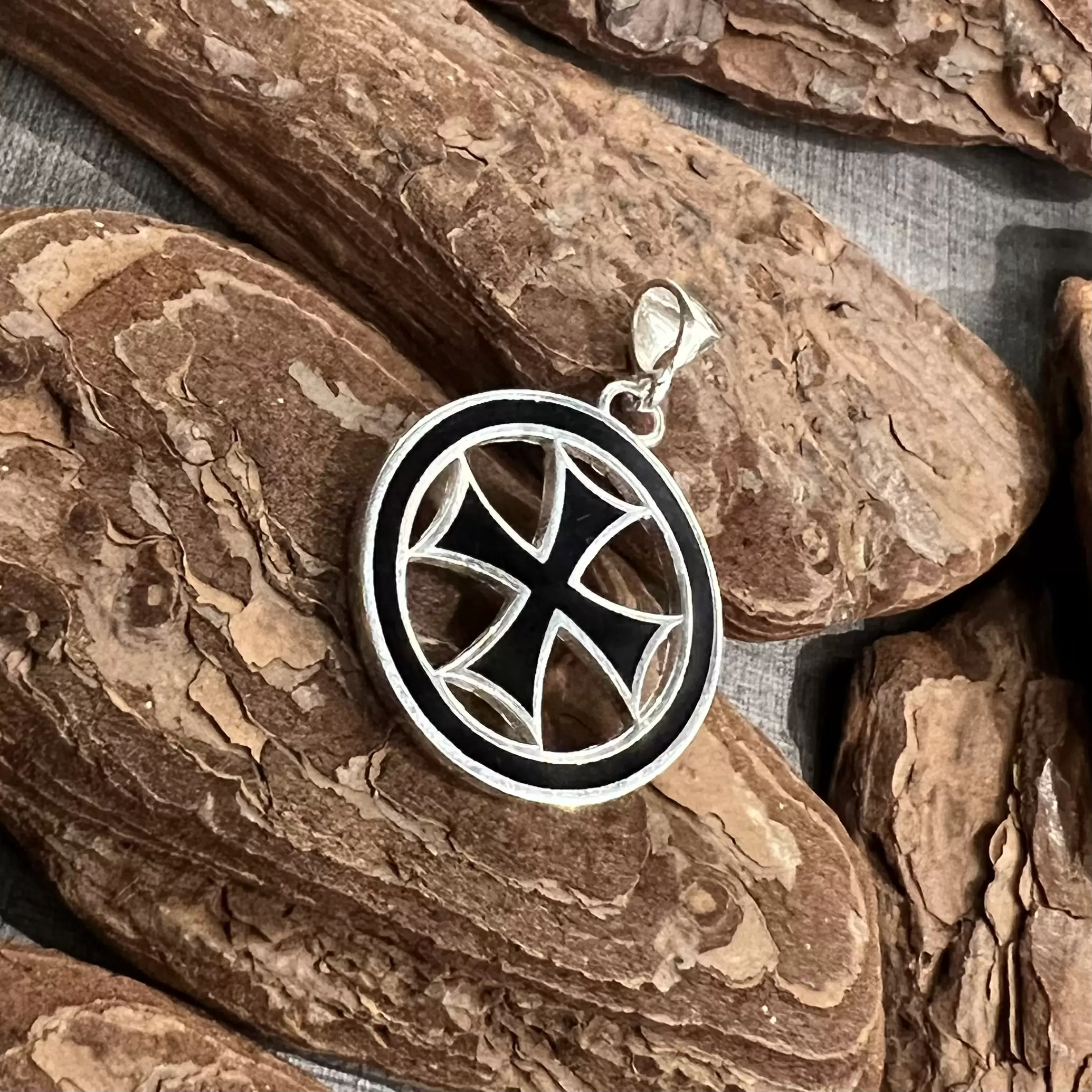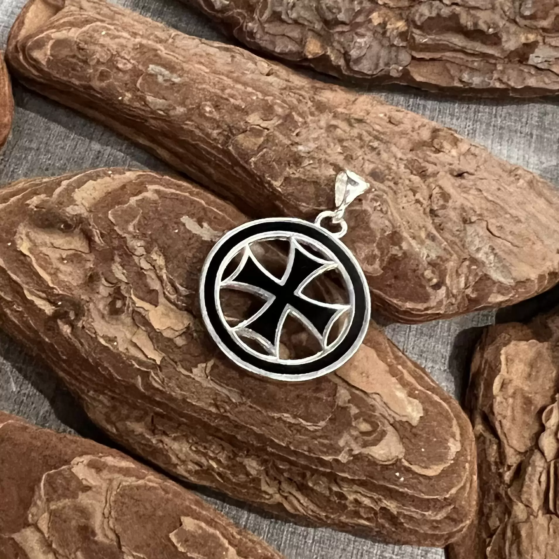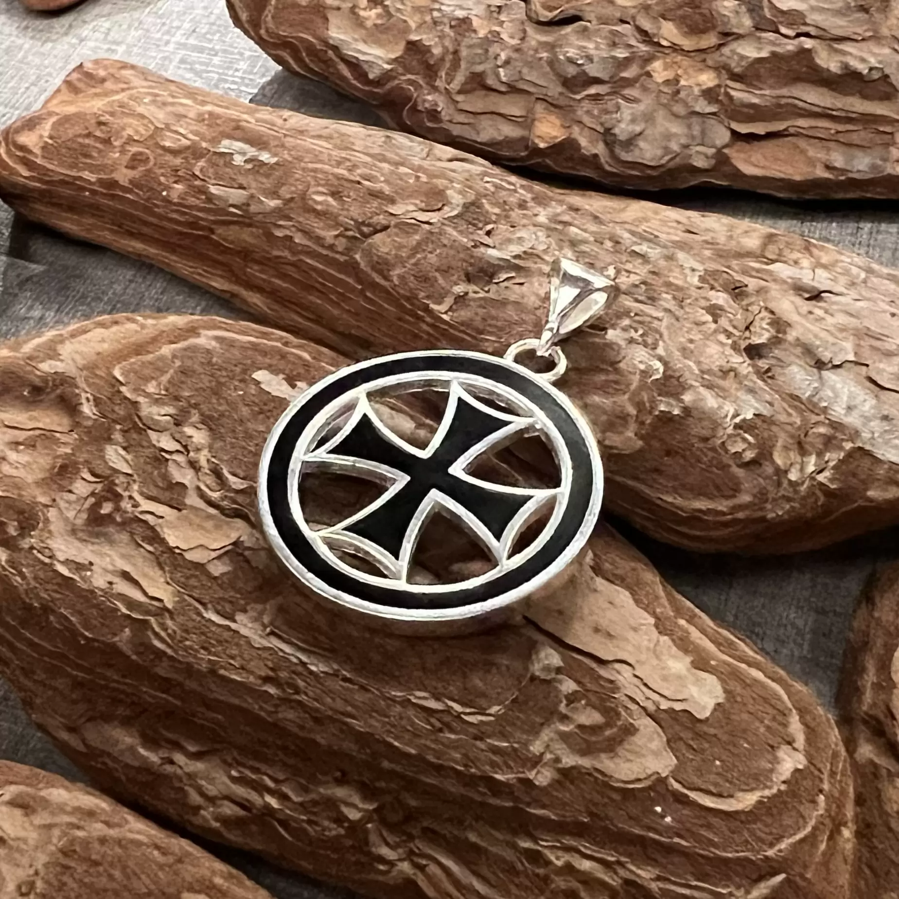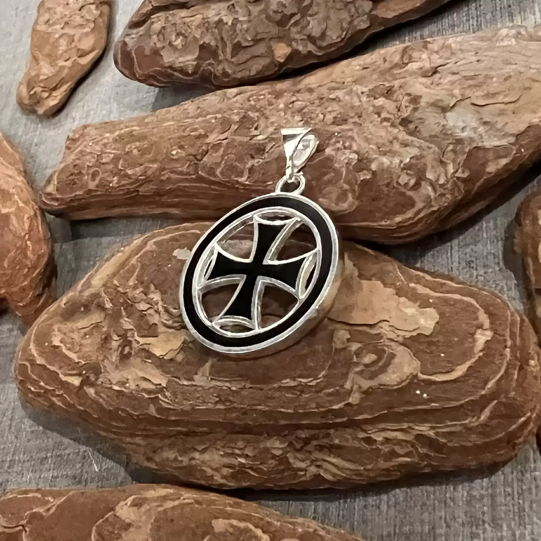 Pingente cruz de malta esmaltado em preto feito em prata 925.