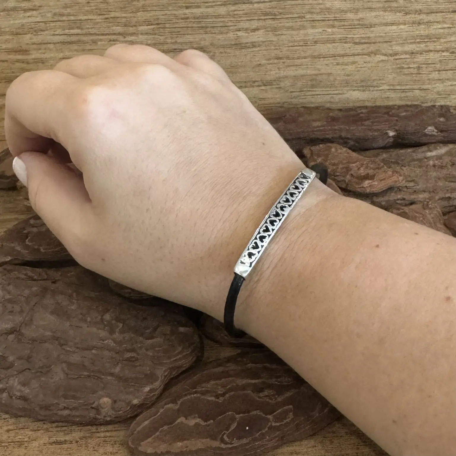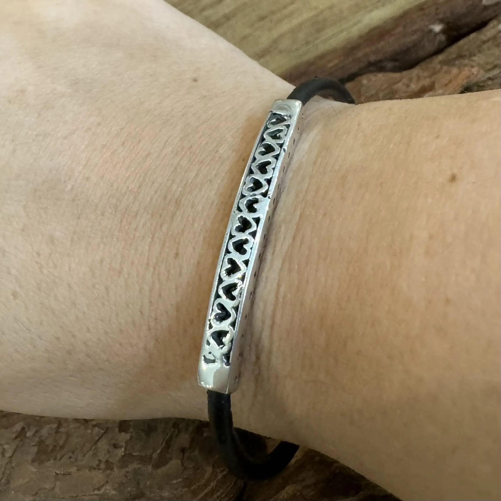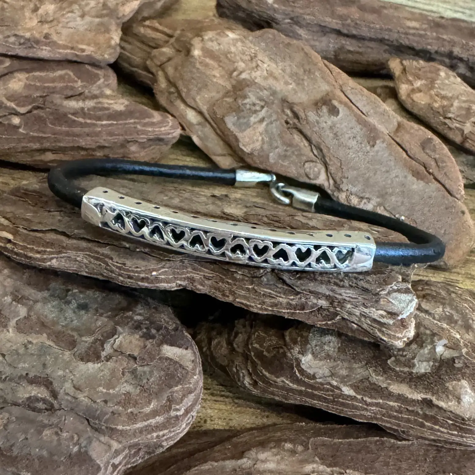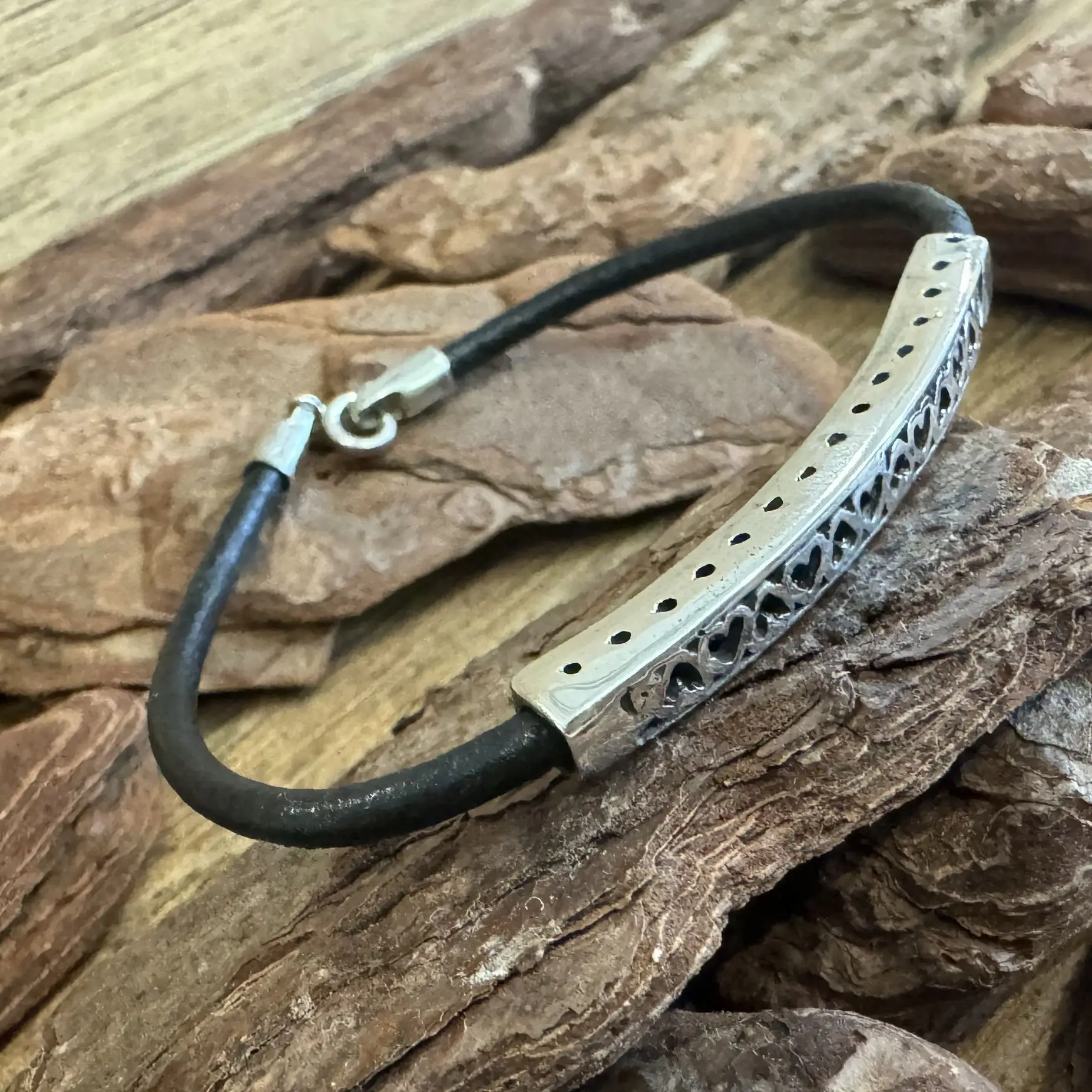 Pulseira de Corações com Couro em Prata 925.