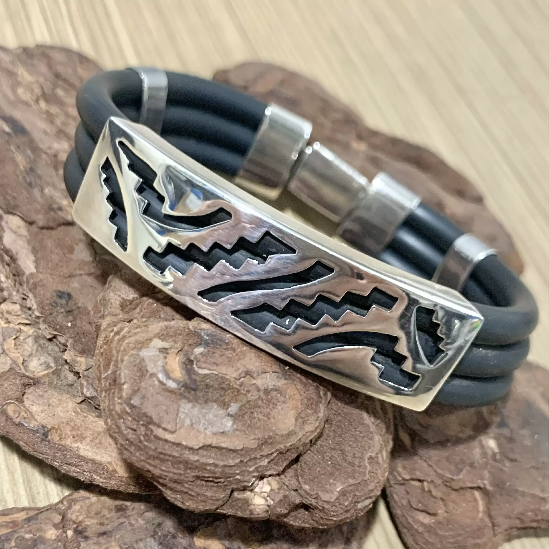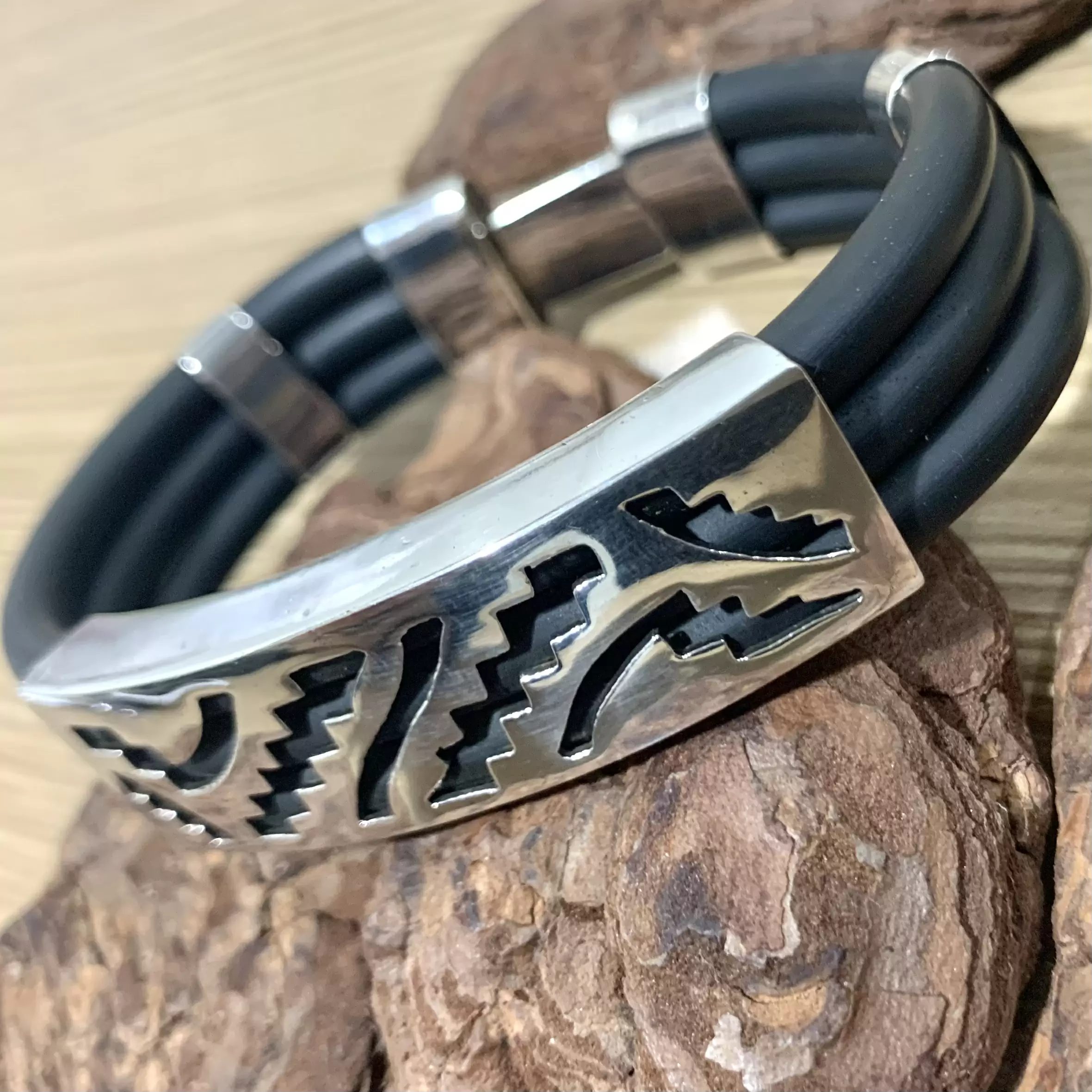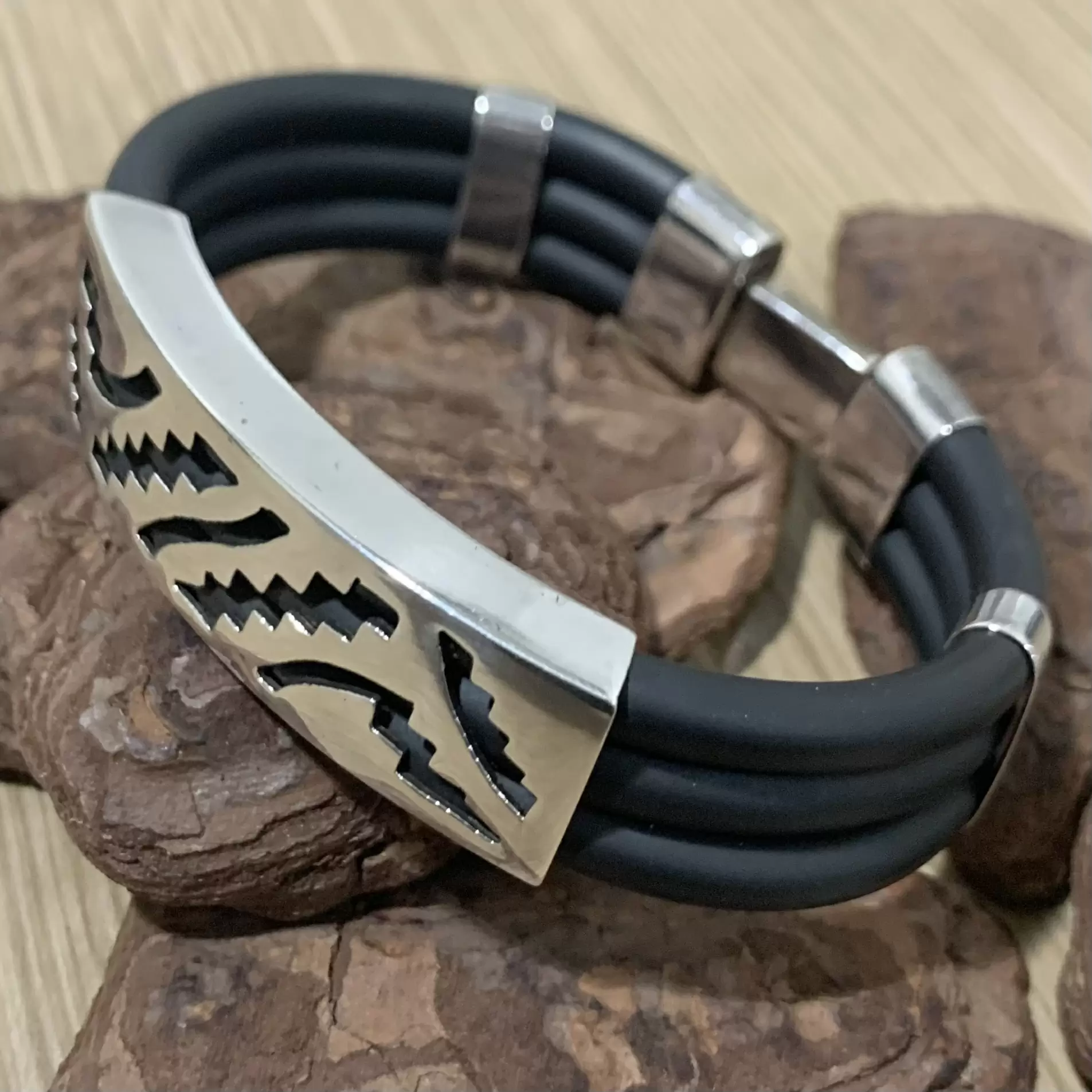 Pulseira grossa com 3 fios de borracha em Prata 925 com fecho gaveta.