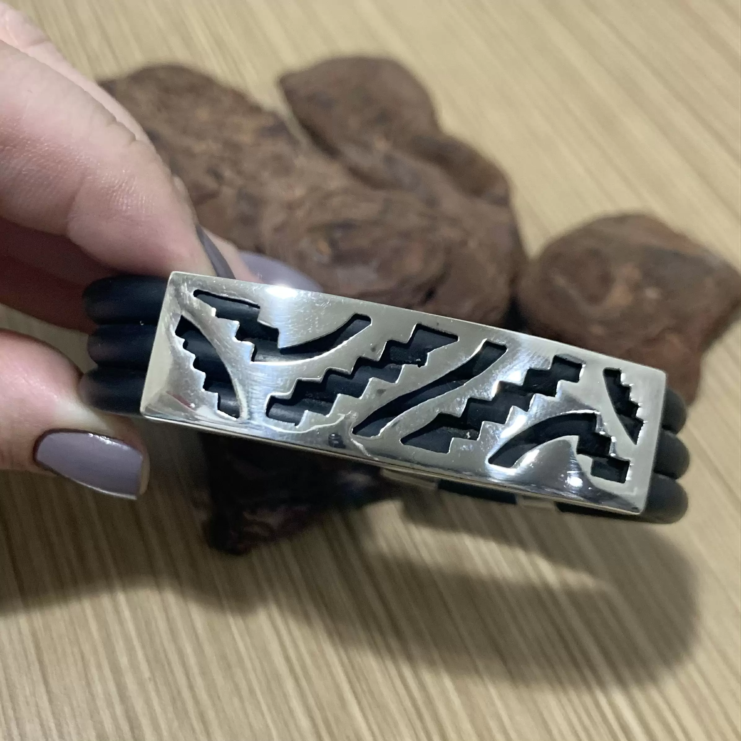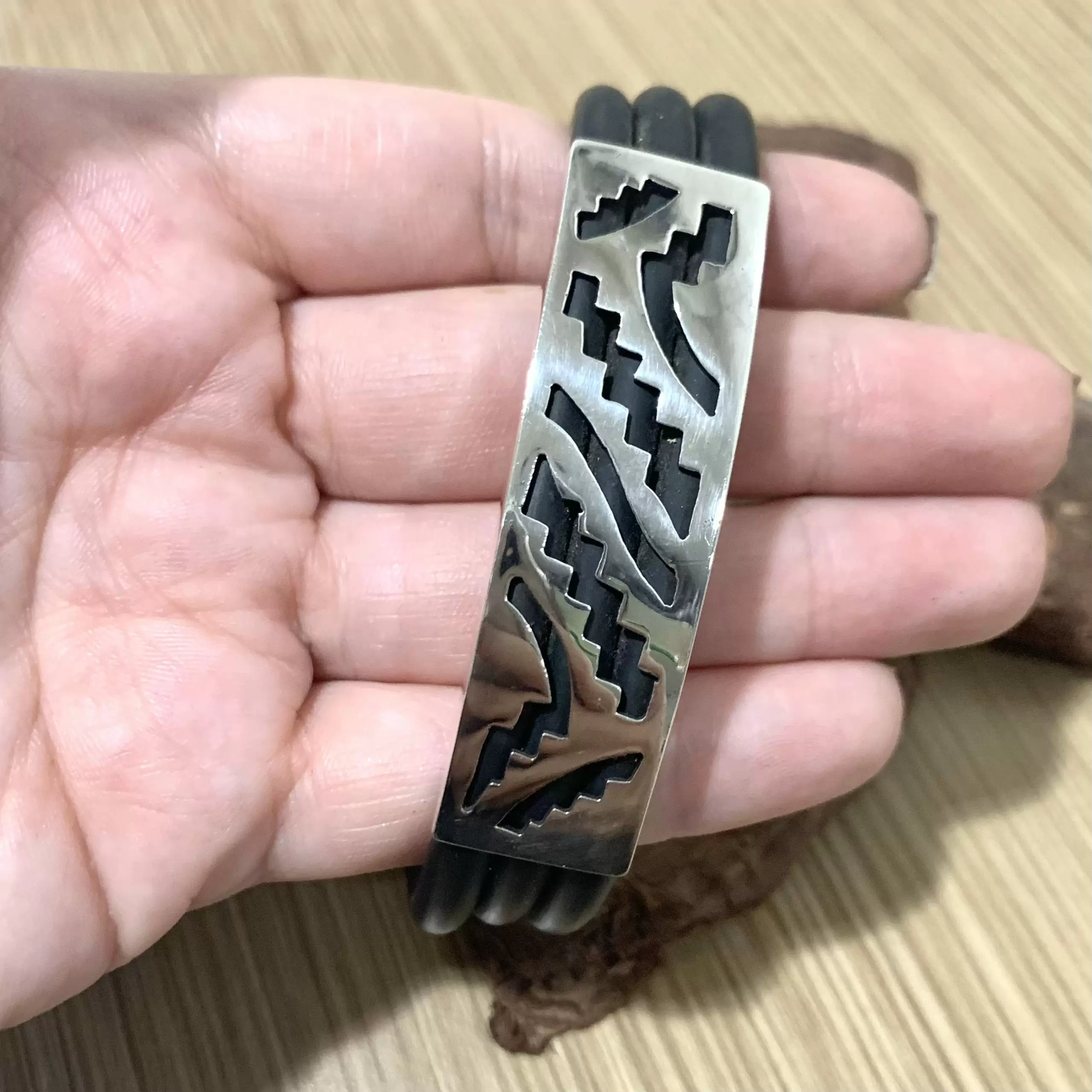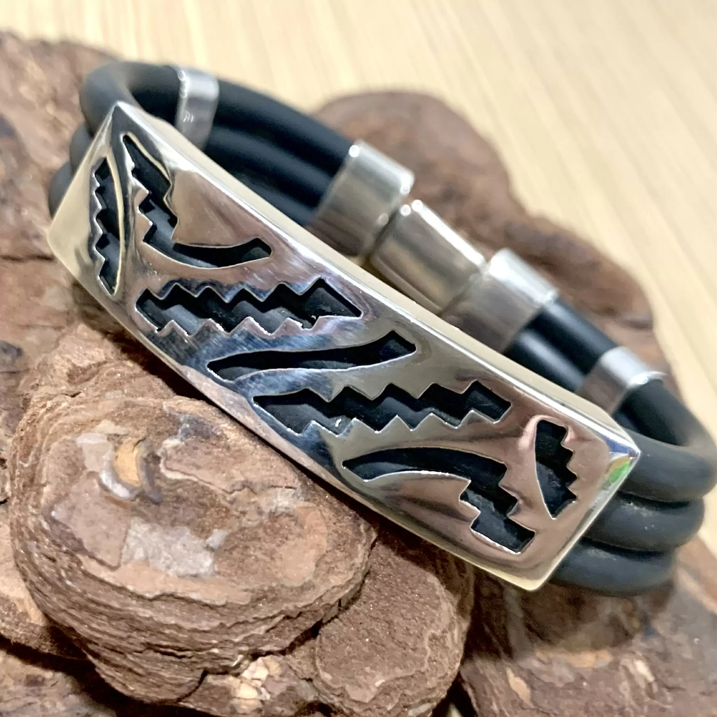 Pulseira grossa com 3 fios de borracha em Prata 925 com fecho gaveta.