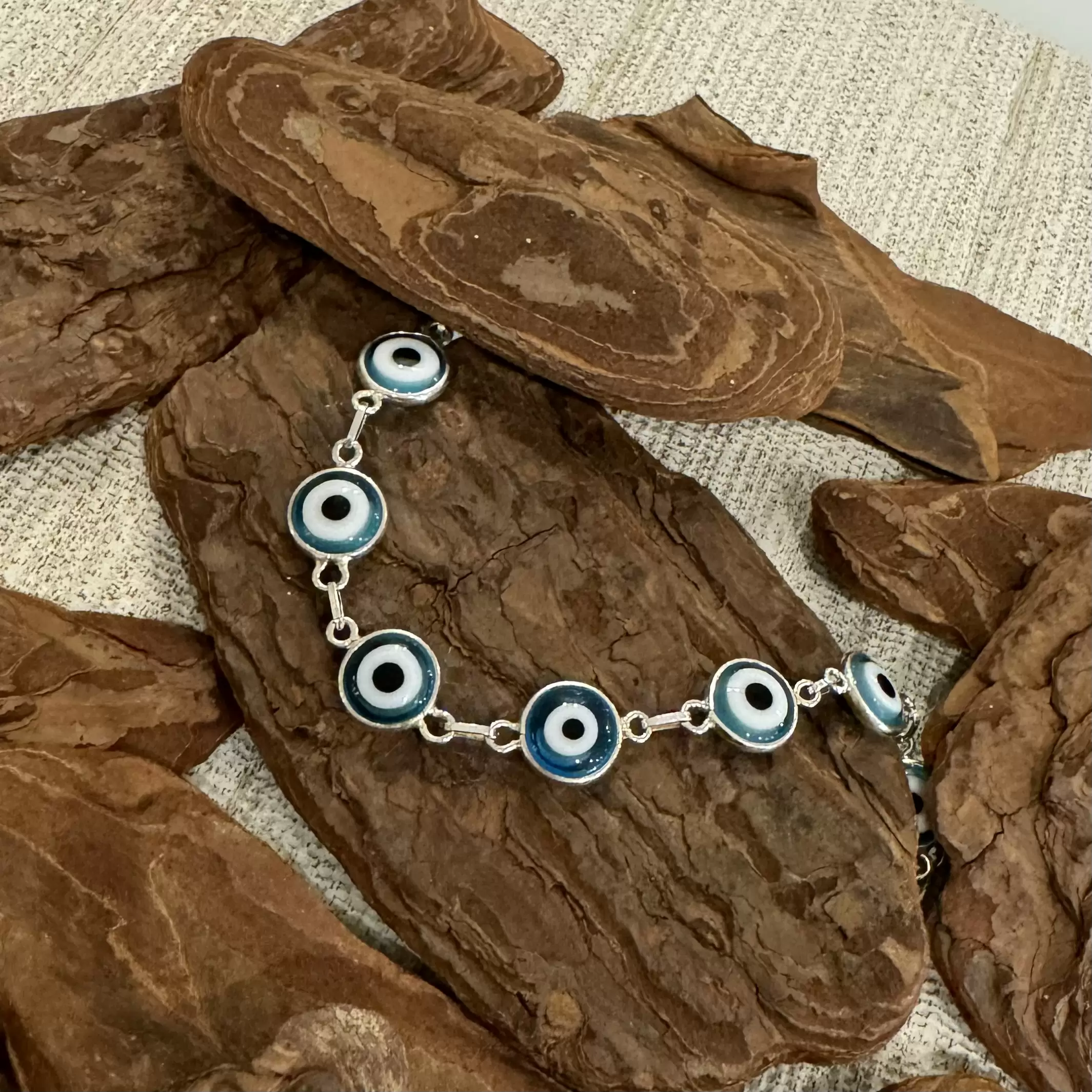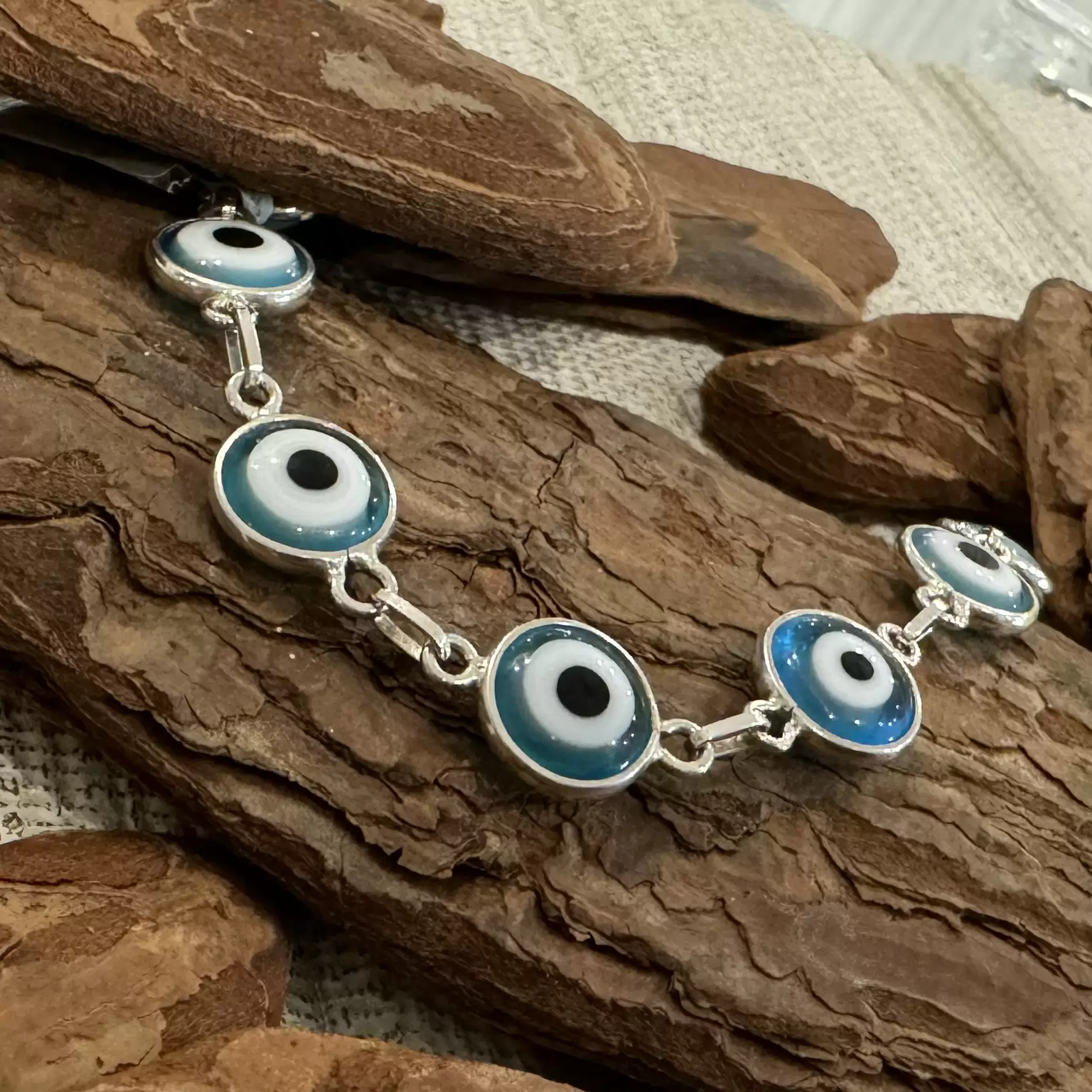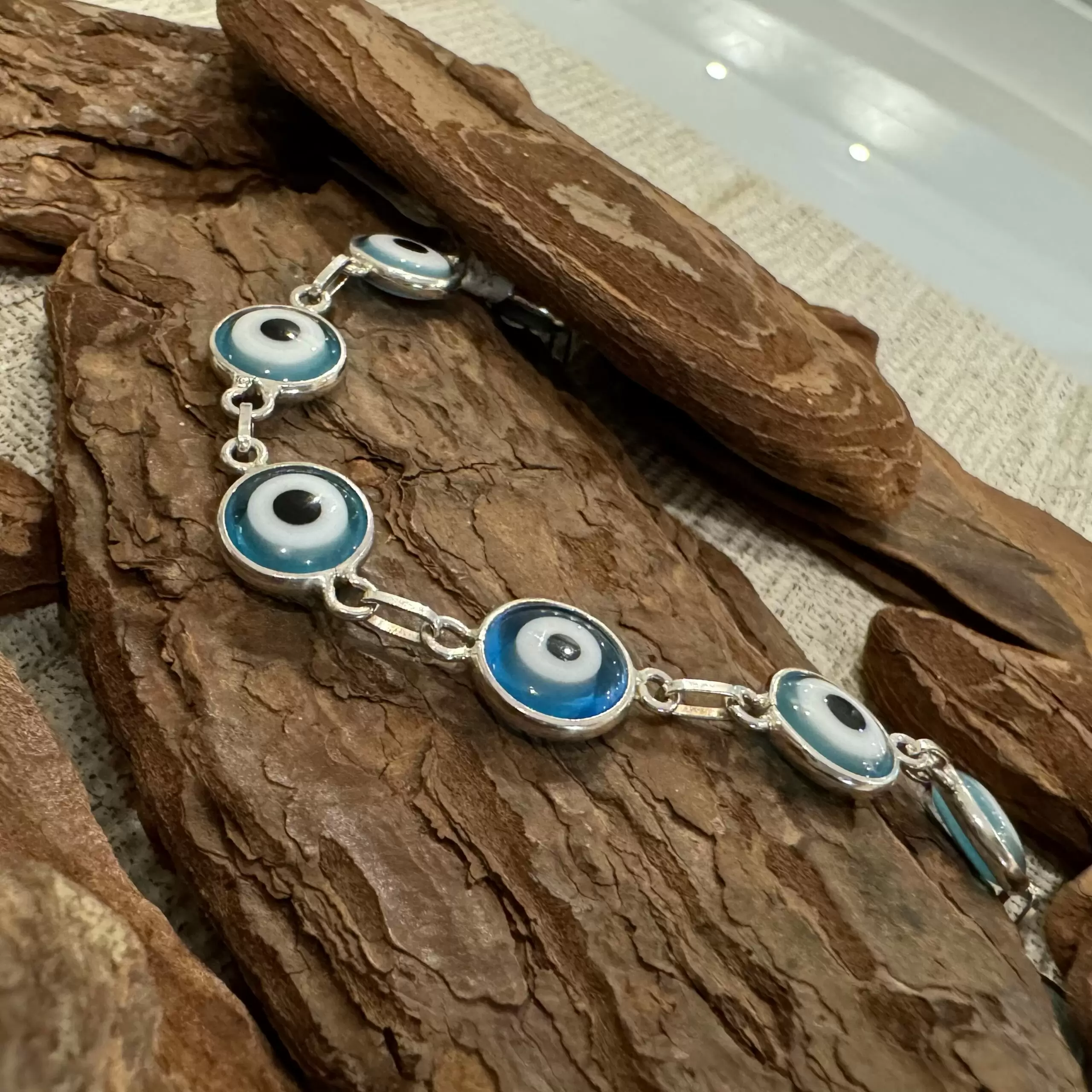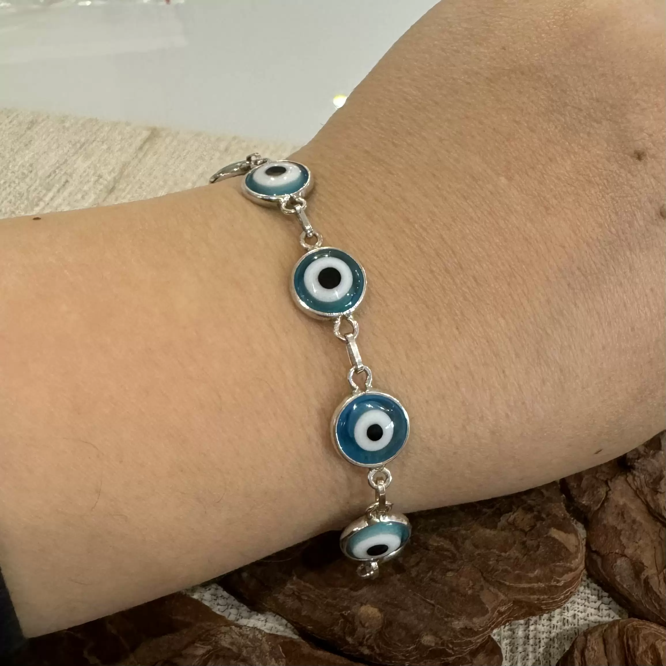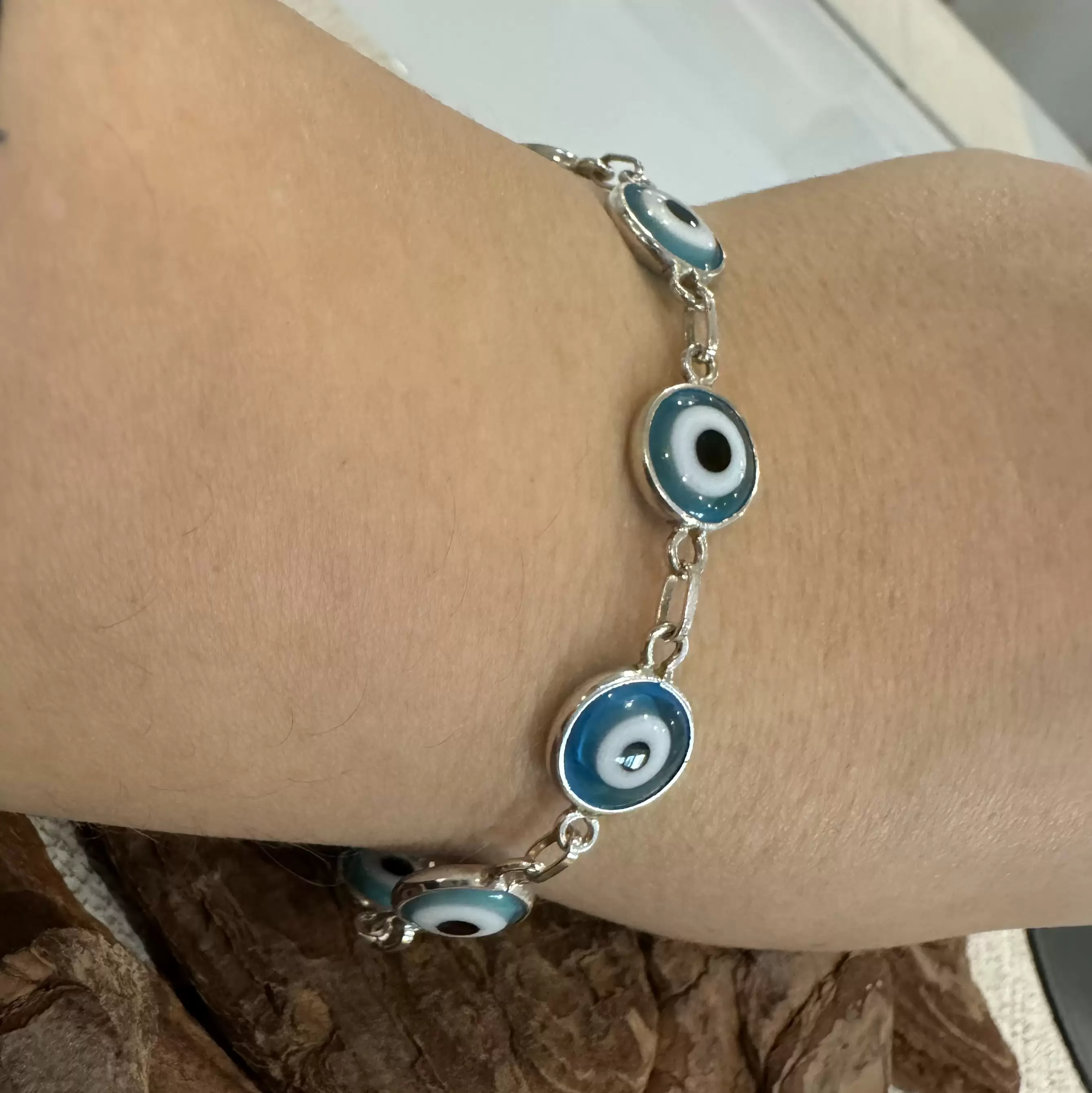 Início Feminino Pulseira Pulseira Olho Grego Grande Azul Claro em Prata