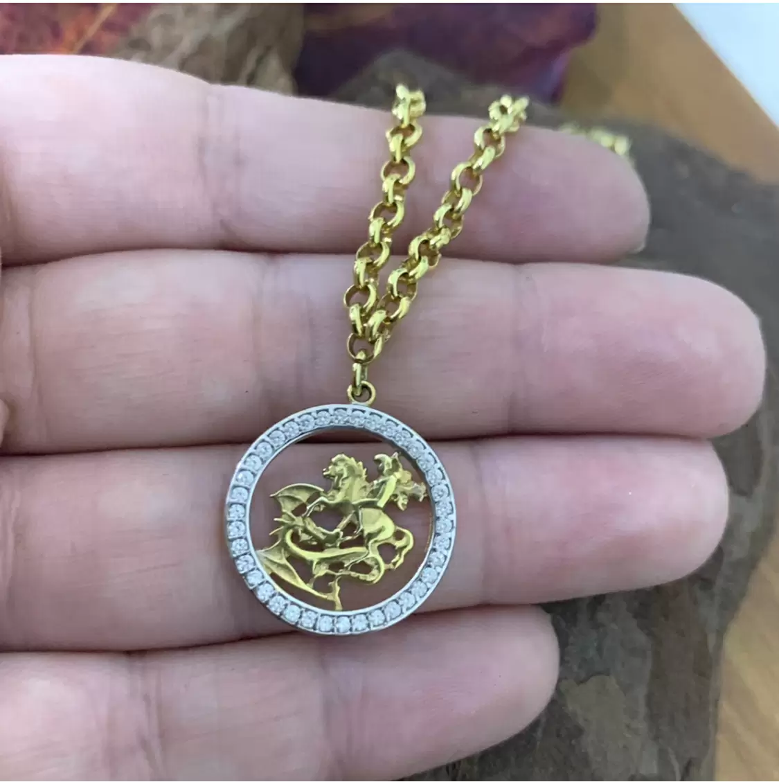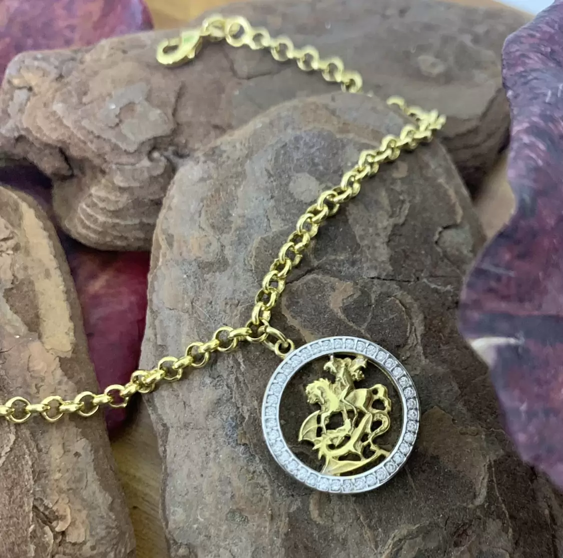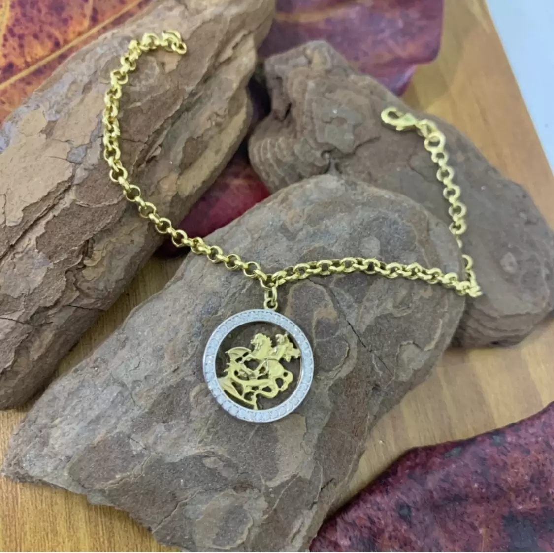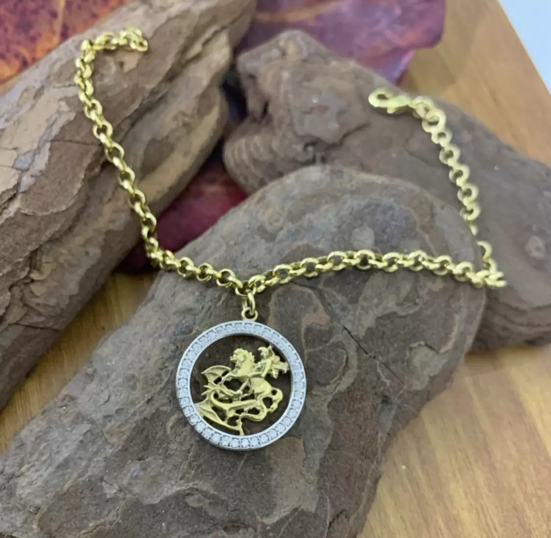 Pulseira de elo português com pingente do São Jorge cravejado com Zircônias brancas folheada a ouro 18k.